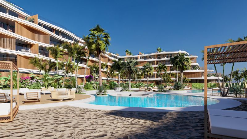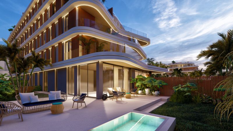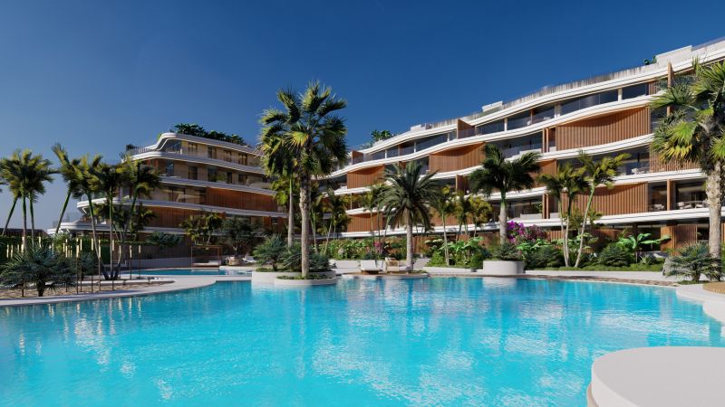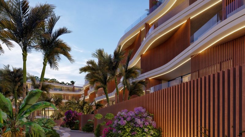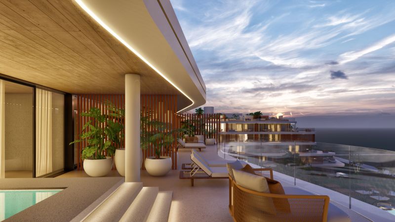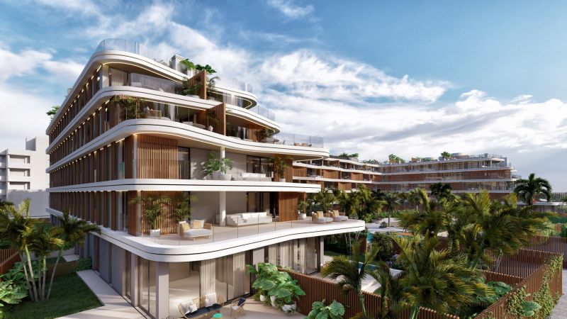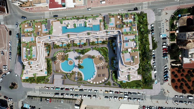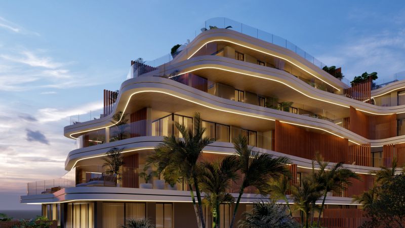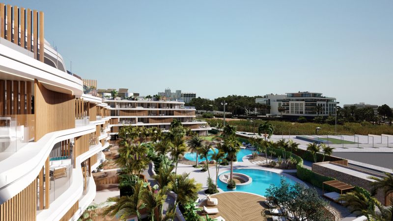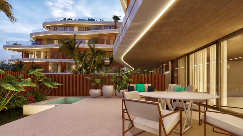 The design of the complex expresses “the waves”, which identifies the island of Ibiza and the sea, resulting in modern and winding lines, making it look innovative and cosy. The complex has 100 spacious apartments with bright interiors, every detail is carefully developed to offer an unforgettable living experience. We integrated luxury community spaces that allow interaction, gardens and terraces that give a possibility to rest and enjoy the stunning views of Ibiza. A big central garden serves as a centre of the project and is complemented with a large swimming pool on the ground floor.