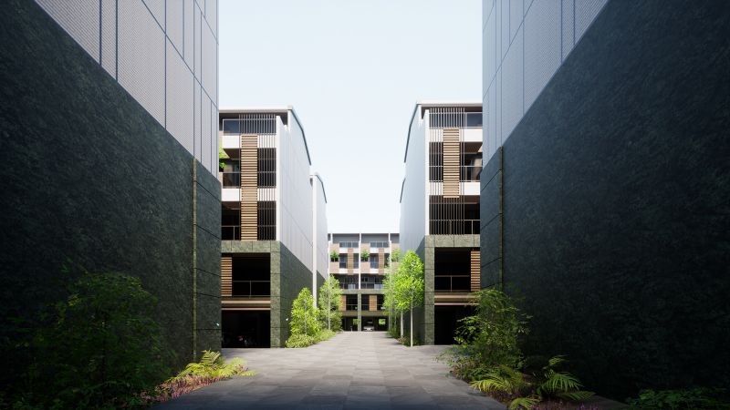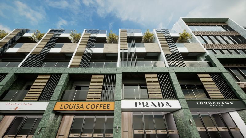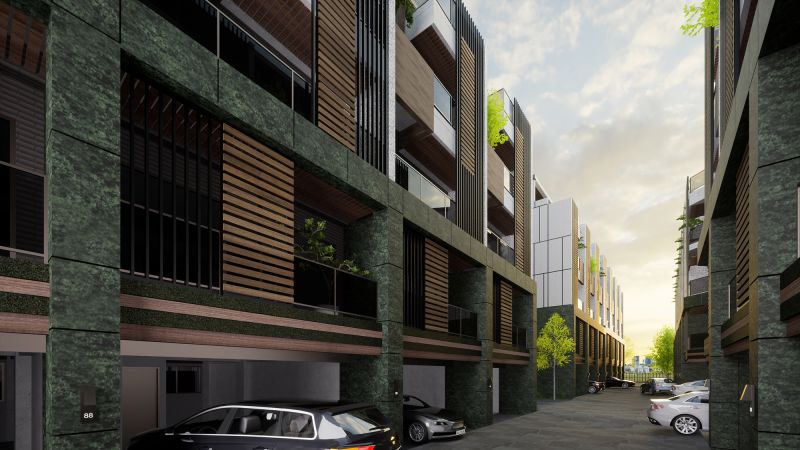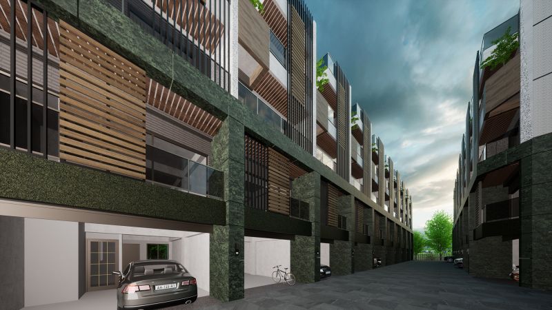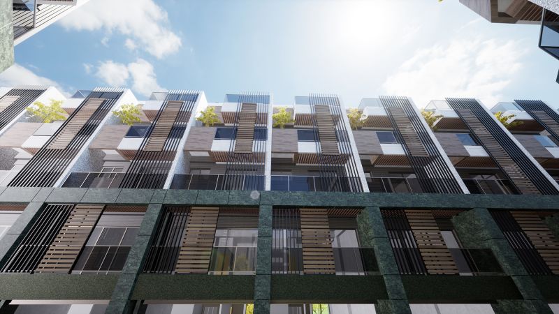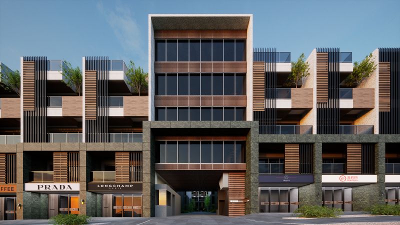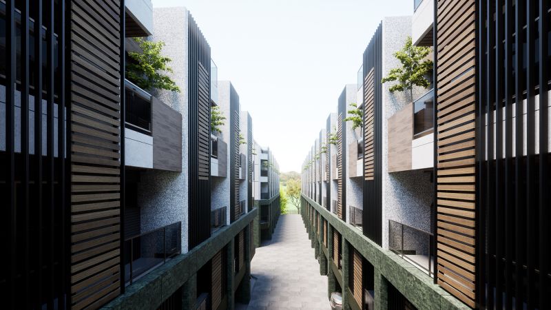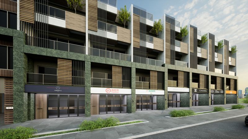 The house of this architectural design project is located in the rezoning area of the Aviation City in Taoyuan, Taiwan. The design team resourcefully adds natural elements such as stone, wood, and green plants to the exterior of the building, thereby blending with the adjacent forest park and composing a beautiful melody of this majestic forest. Looking at the front of the building, the dark green marble is used as the lower half of the structure, and the white tone is used as the upper half of the wall color arrangement.
