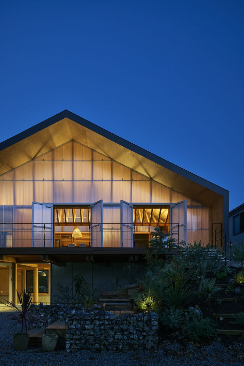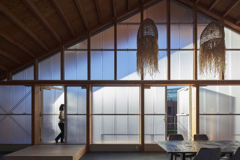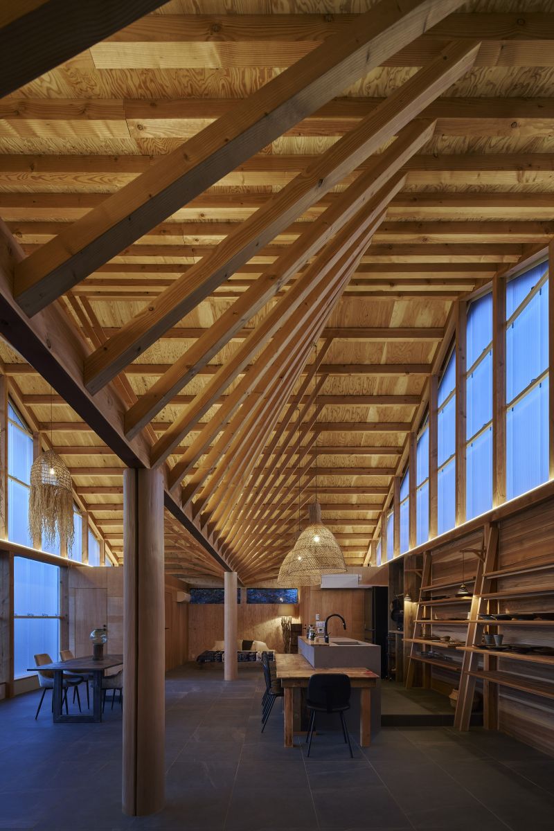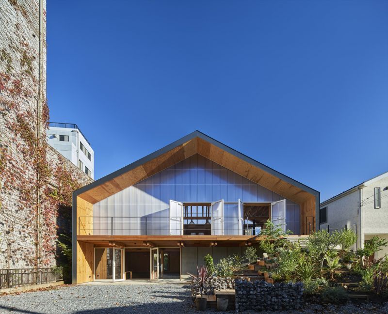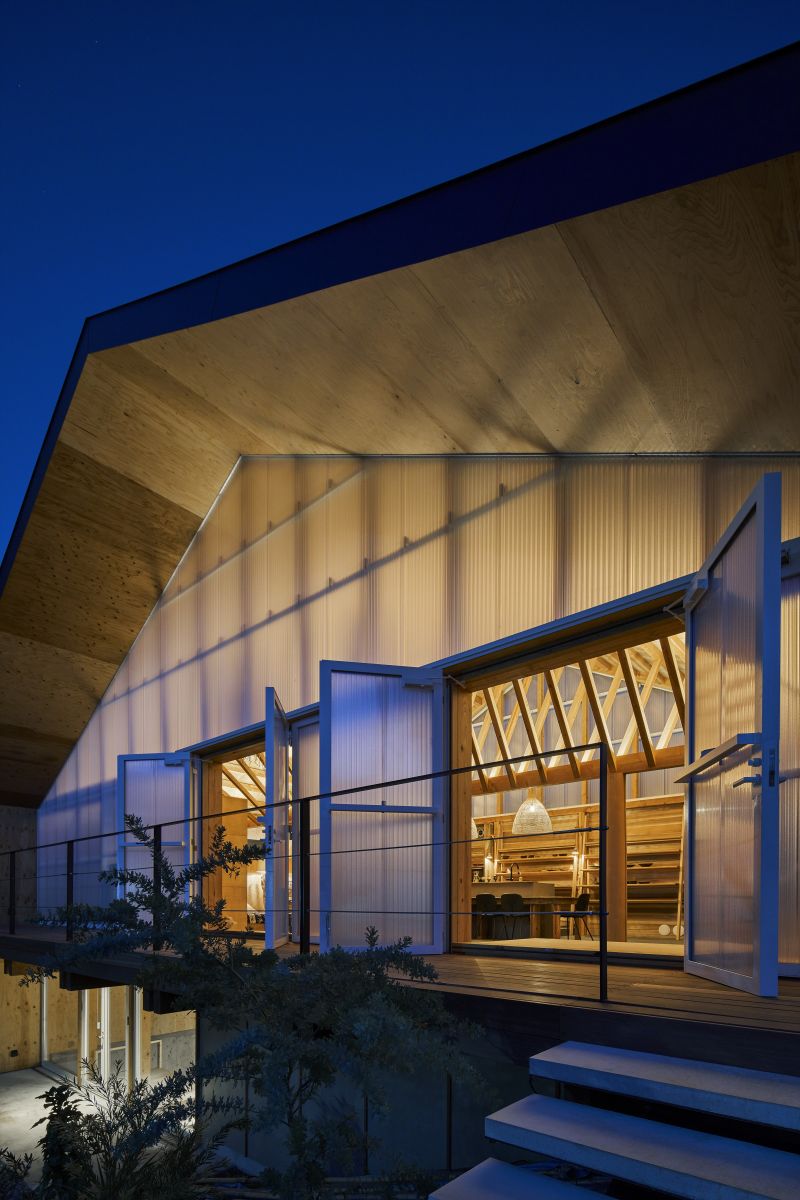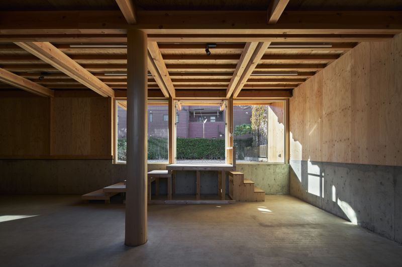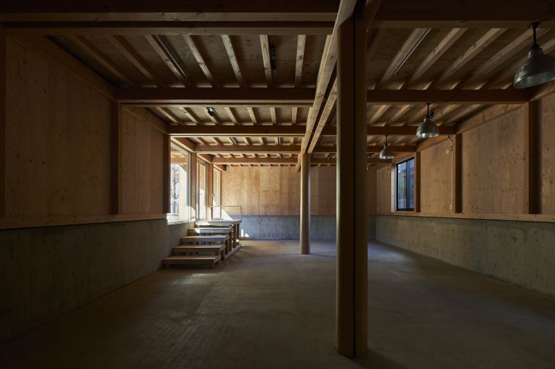 In contrast to the RC main house, the building is an annex designed as a light wooden building. The ground floor is used for a warehouse, while the upper floor is a second house of the owner. The exposed timber frame structure is composed of the lower structure with two-story posts, and the roof structure with timber struts which shift in angles and form HP surfaces. This annex, surrounded by the main building and other detached houses, aims at presenting a new and unclassified townscape in the way it’s used, the scale, and how it emerges as architecture.