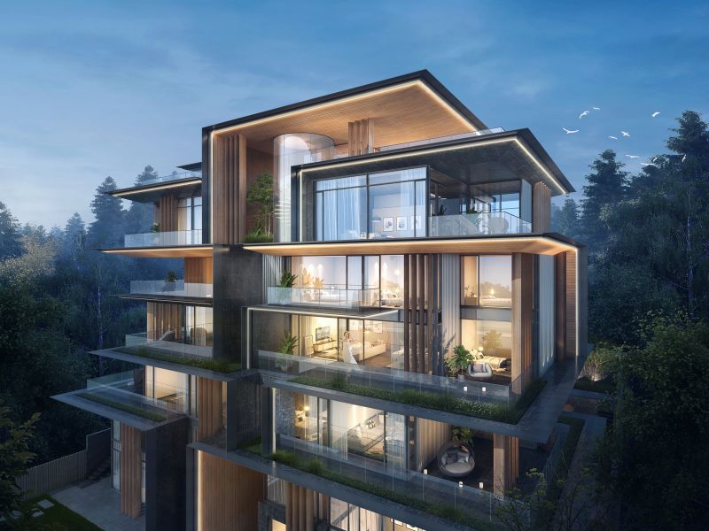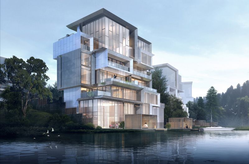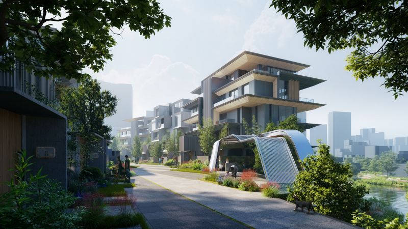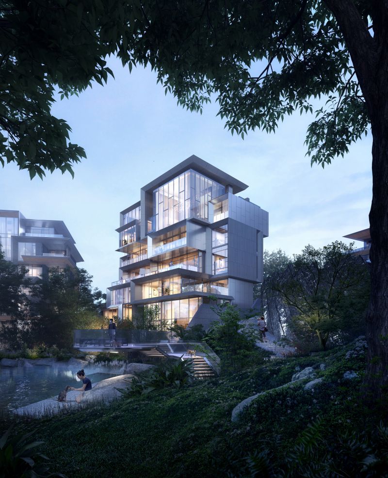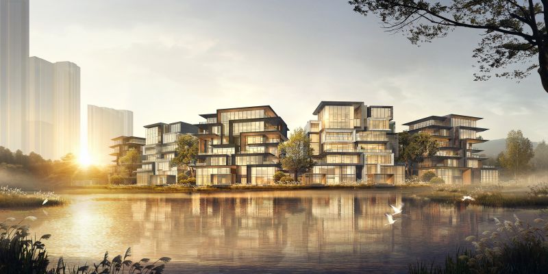 The B2 Sky Courtyard Villas situated on a water-encircled island. Through the use of two distinct architectural languages, the design balances the interaction between the building volume and the surrounding natural environment while offering high-quality residential goods. Type 1 adopts the concept of stacking blocks to create transparent and interlaced façade. Type 2 uses the inverted L-shaped blocks and three-dimensional folding plates that are layered at various heights and lengths. A vibrant and distinctive residential island is produced by combining two dynamic and adaptable monomers.