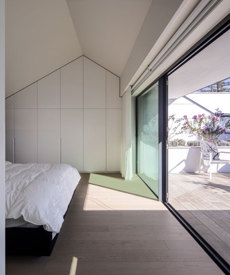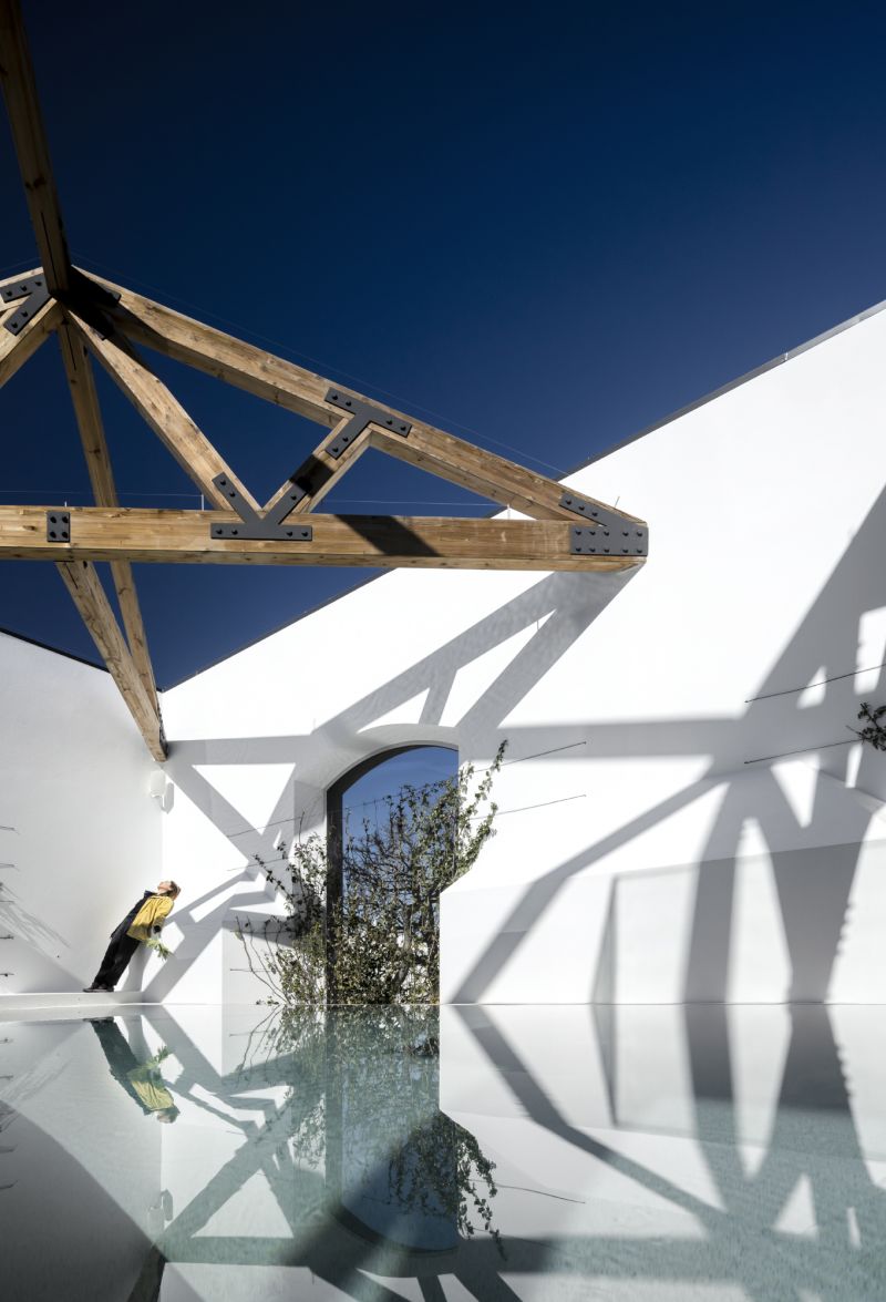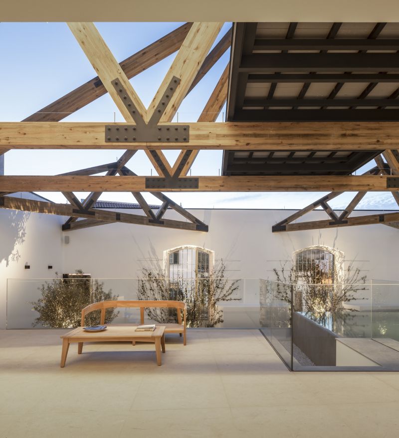 The facade was maintained, with the thick walls of the original building and its opacity allowing the privacy between the house and the street. A patio was designed beside the corner of the building, looking up from it we can see the original vertices of the trussed against a background of the infinite sky.