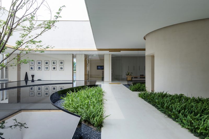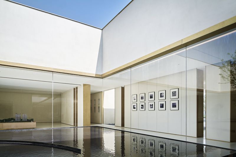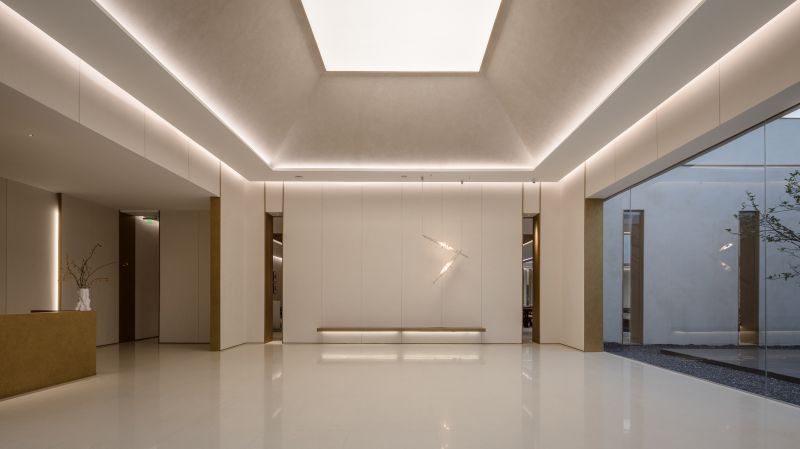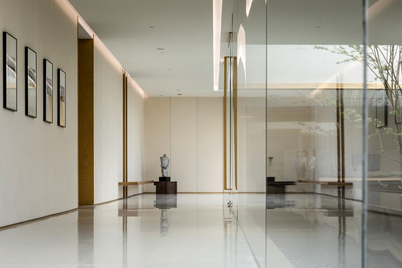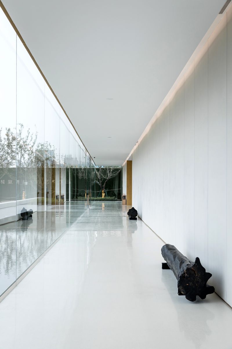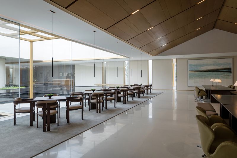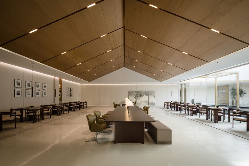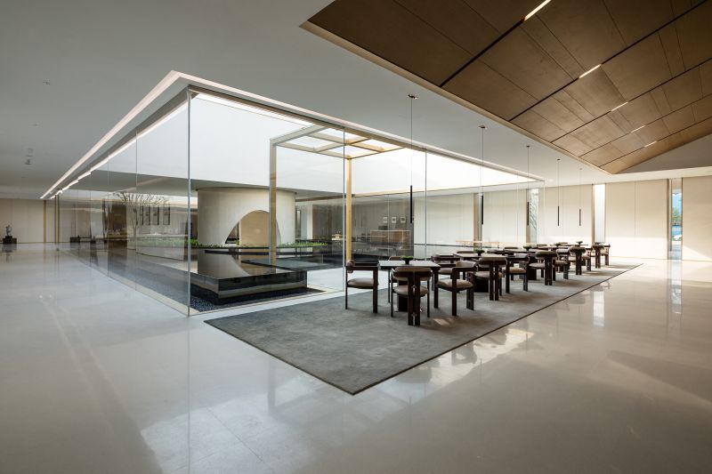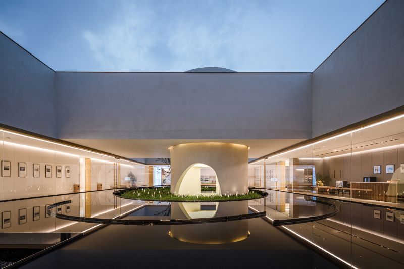 The Aesthetics Center in the shape of hollow squares has large areas of glass to improve lighting, eliminating the boundaries between the building and the landscape. Its wood material echoes the ancient city with “circles” as a key element. The combination of hollows and circles perfectly interprets traditional culture and aesthetics with modern architectural languages. The arc divides the space into dynamic and static areas, and the atrium columns increase the richness. The introverted space provides a sense of privacy where people, architecture and nature live together in harmony.
