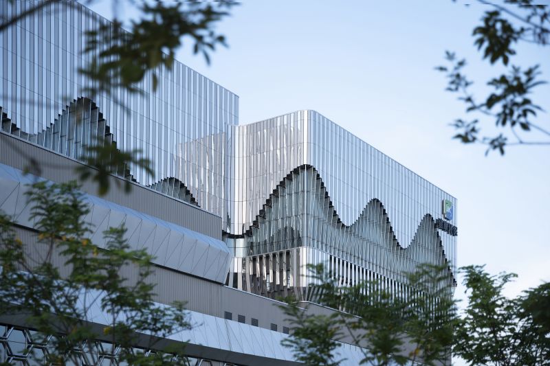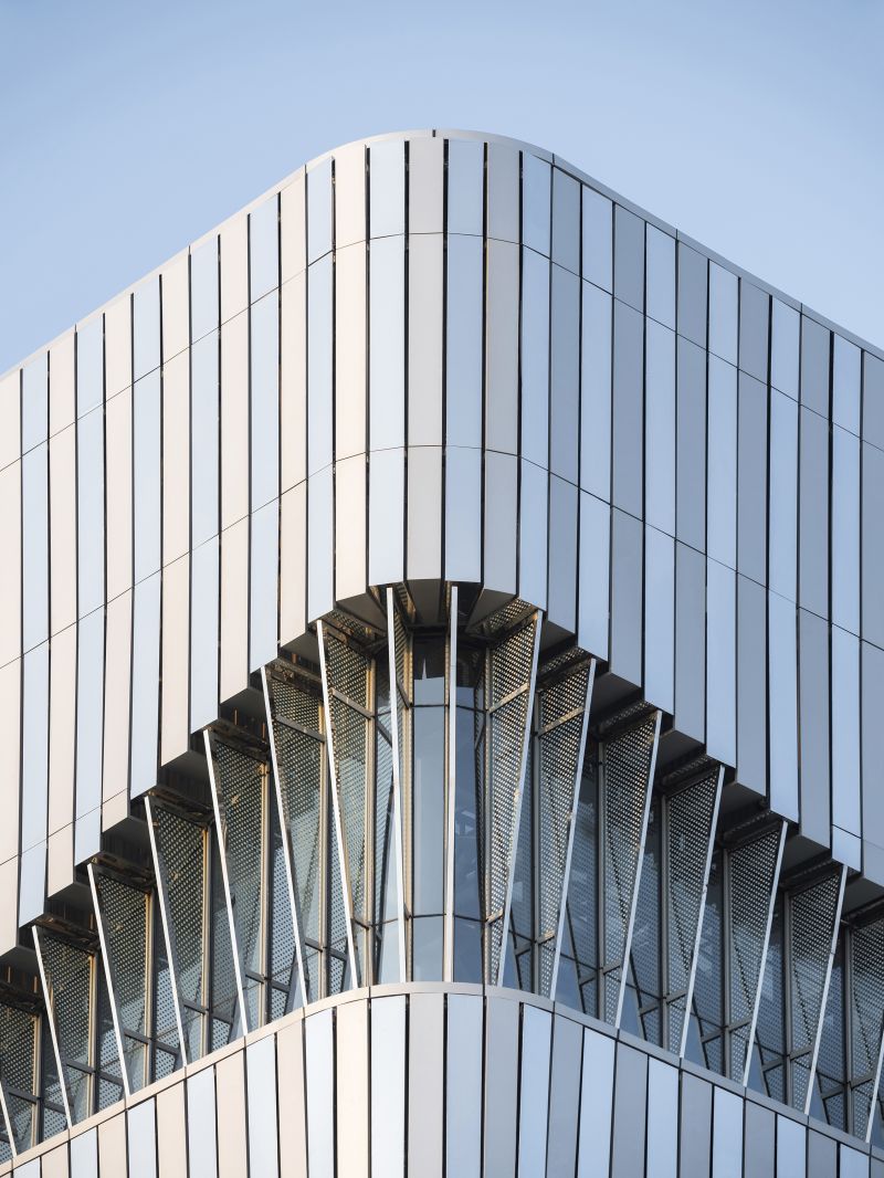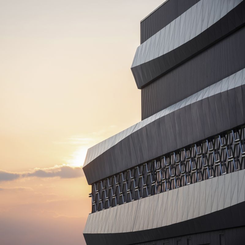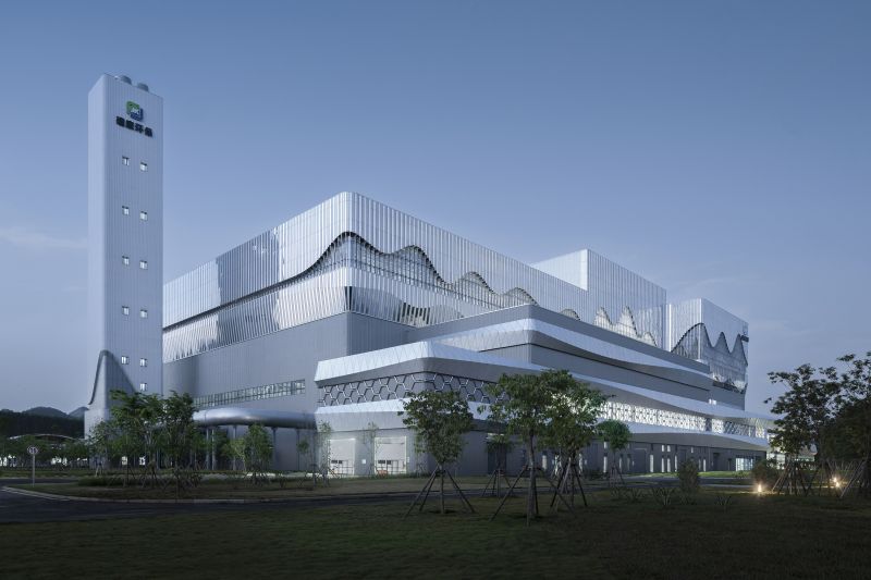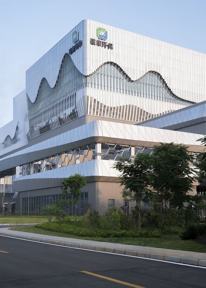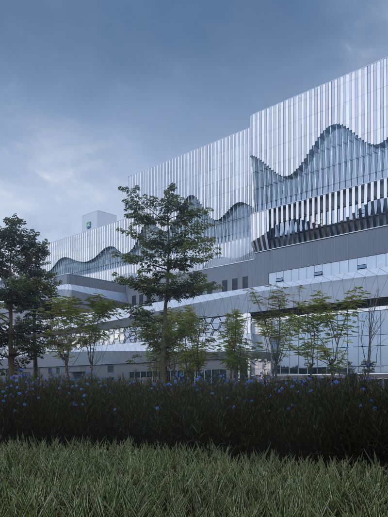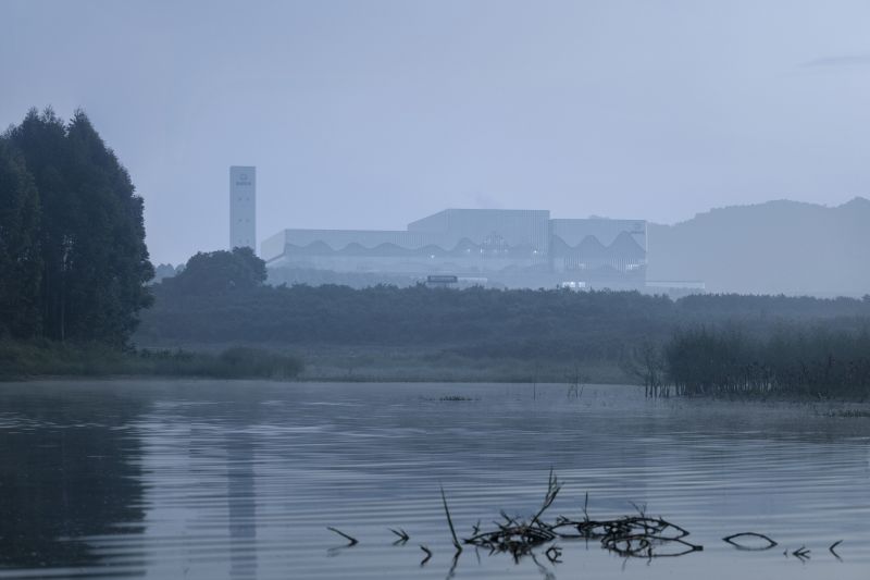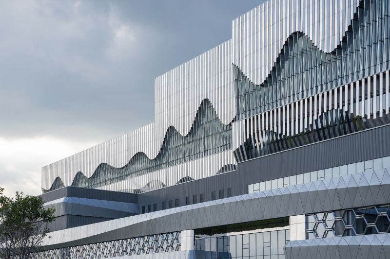 Backed by undulating karst mountains, this factory building draws its design language from the natural context. To the north of the site there is a bare plateau flattened by the mining of a cement factory. In order to respond to the nature and memory of the site, the facade of the building is featured by a pattern of undulating mountain range to visually remedy the damage to the mountains by human impacts, evoking the self-examination of human activities. The pattern of the mountain range is derived from the combination of four sets of trigonometric function curves through parametric design.