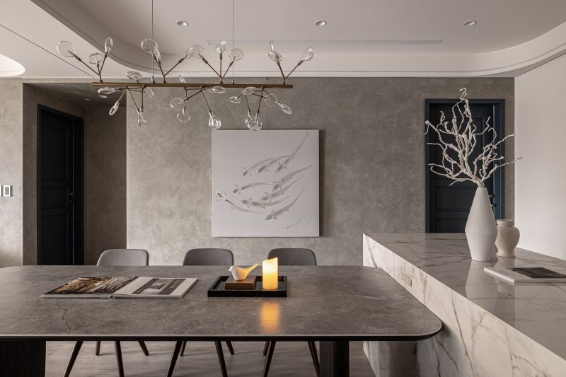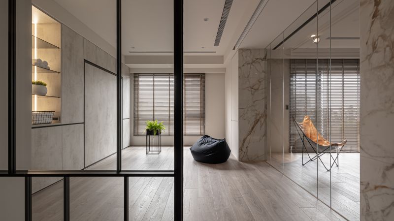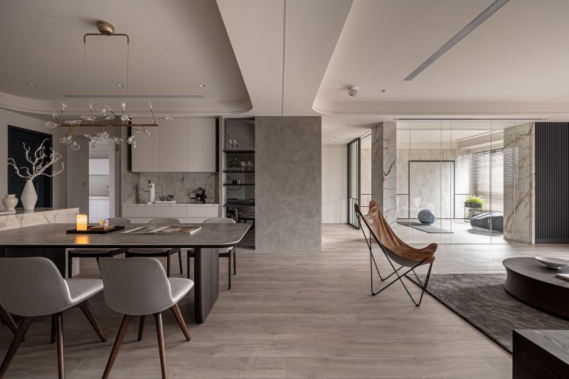 In order to maximize light, the designer used glass partitions and an open approach to create a sense of brightness. In order to build this space where light can penetrate the entire room, the designer removed all the solid walls of the public spaces and presented it in a fully open way and used the shape of the ceiling to define the common area. The light lines and textures drove the atmosphere of the home, and this project, with its open-up design, caters to a sun-loving family of four who have just moved back to Taiwan from New York to start a new chapter in their new home.
