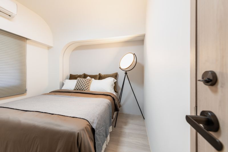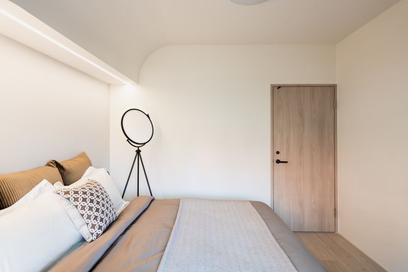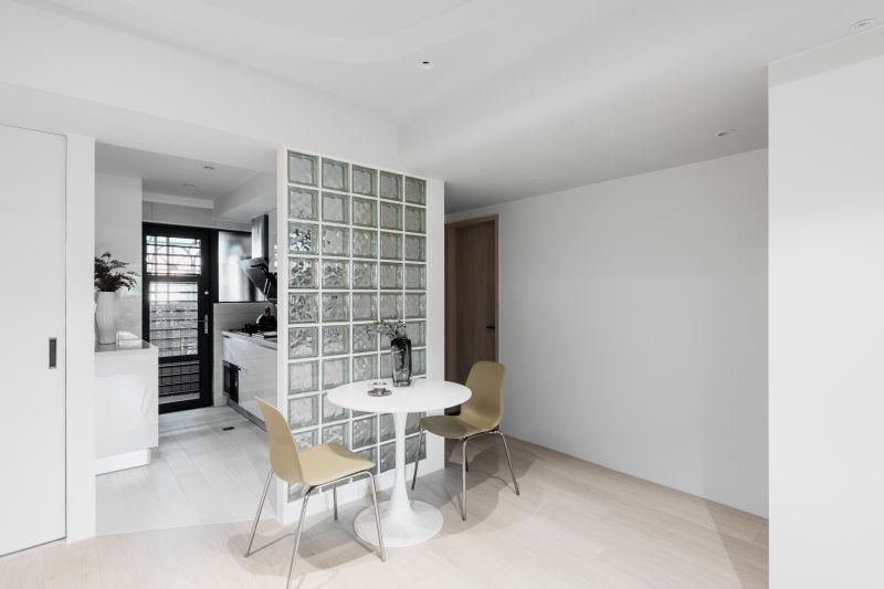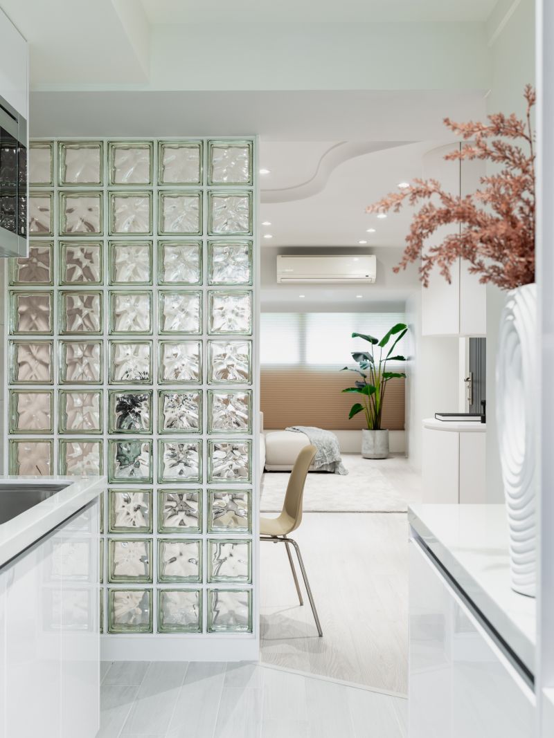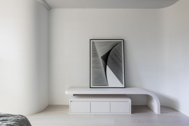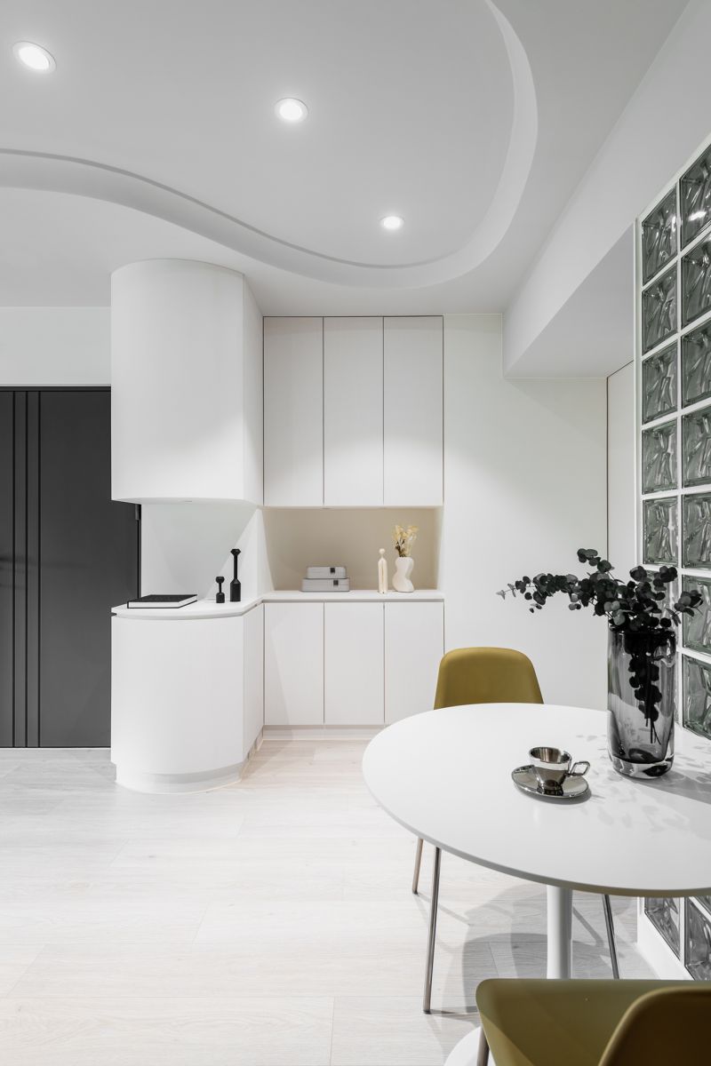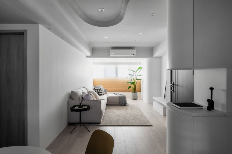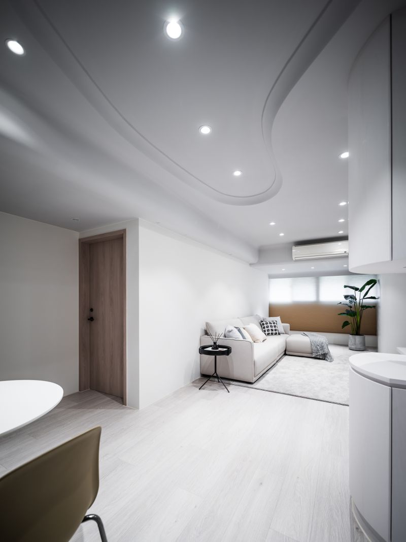 Because of the low floor, the original layout is not ideal for letting in natural light. In addition, the old living-room balcony has been pushed out, leaving a beam across the living room. As a result, the structure, though impossible to modify, is transformed by using the concept of “open the gift box”so as to resolve the visual discomfort. Flowing lines play a vital part in the decoration, transforming defects of the original space as well as presenting varied beauty, thereby adding fun and enjoyment of being immersed in simplicity.