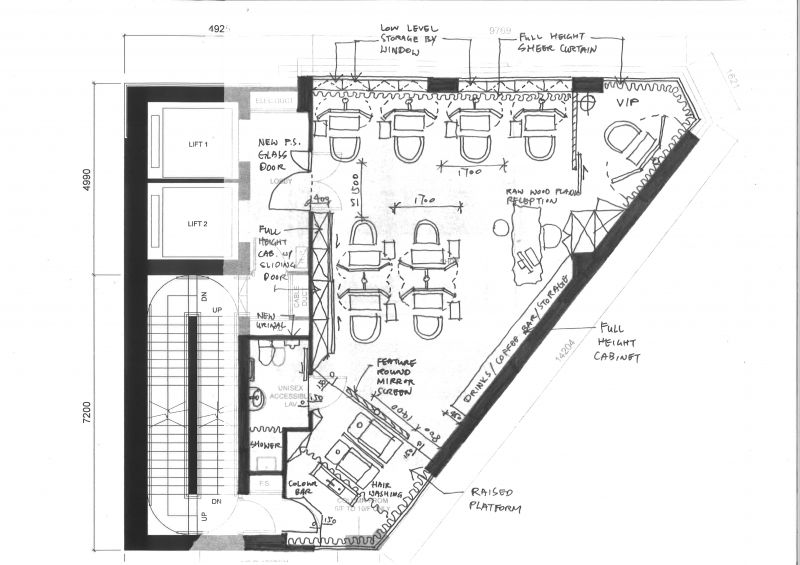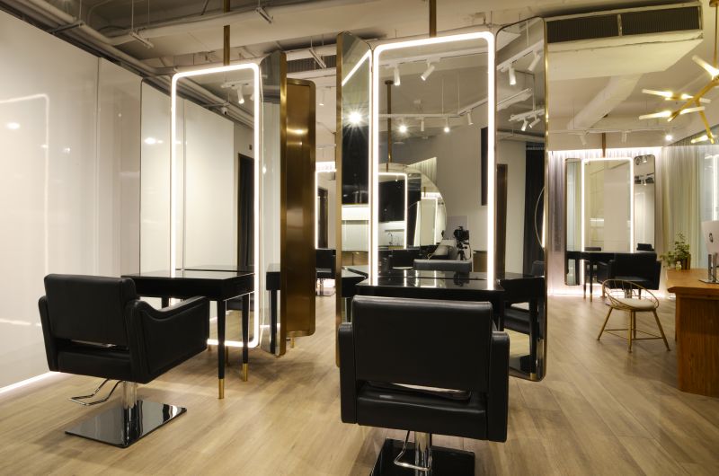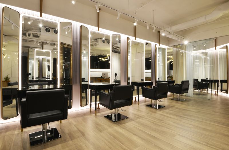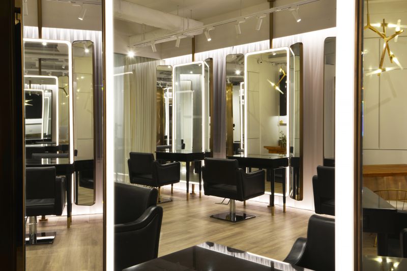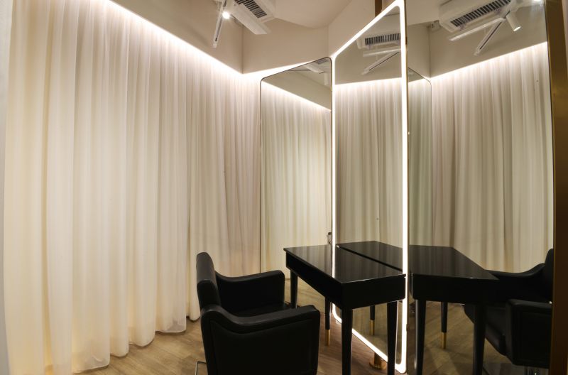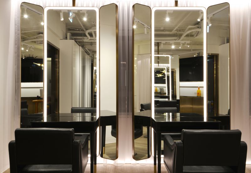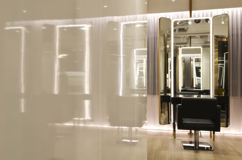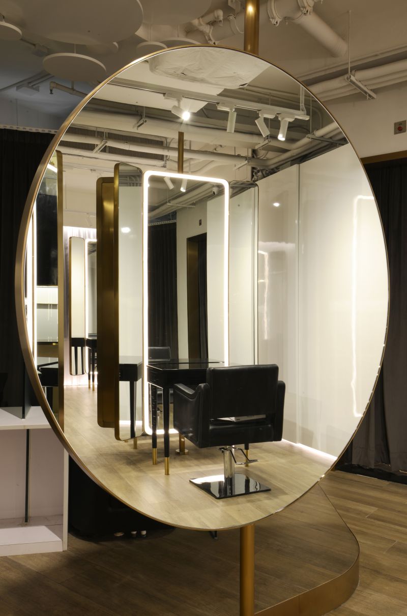 The design creates a spa experience for hair dressing. It enhances this luxurious journey with atmosphere of indulgence. White sheer curtain softens the space and mood with cosy-ness. The light brown timber look tiles add extra comfort-ness. The full height triptych mirrors enhance the spacious-ness. Its bronze trims and concealed light provide unique visual image during the service and sufficient brightness from different angles. An oversized round mirror outside of the washing area acts as the visual and physical barrier for the area, as well as the iconic feature of the brand.