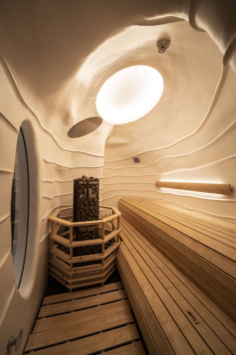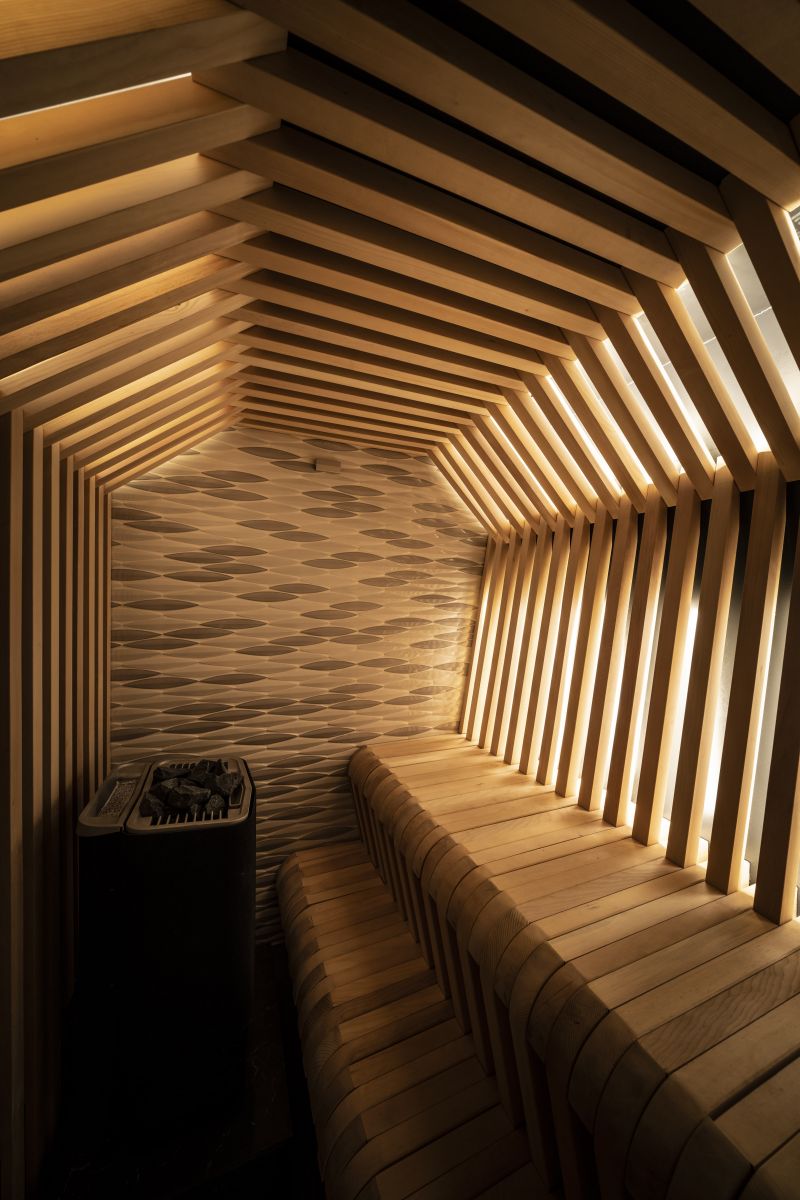 “LATTICE” is a natural and authentic motif and “CELL” is a geometric polygon evokes the image of cells being activated by metabolism by a sauna. The dome-shaped “COCOON” is calculated for heat convection and has the image of calming the mind in a pure white cocoon.
