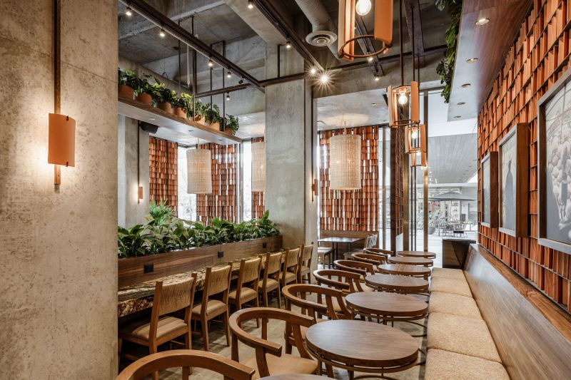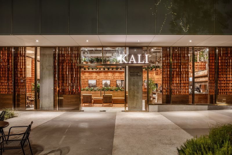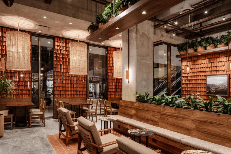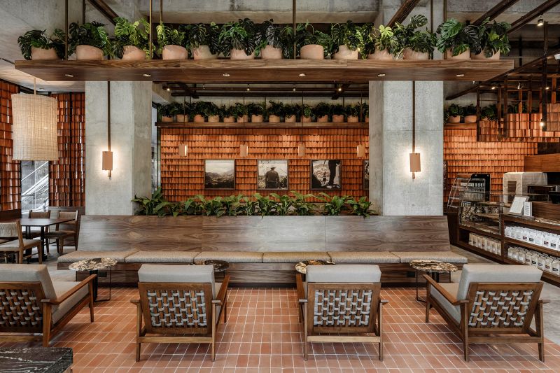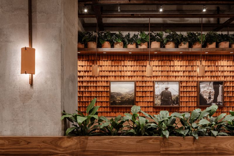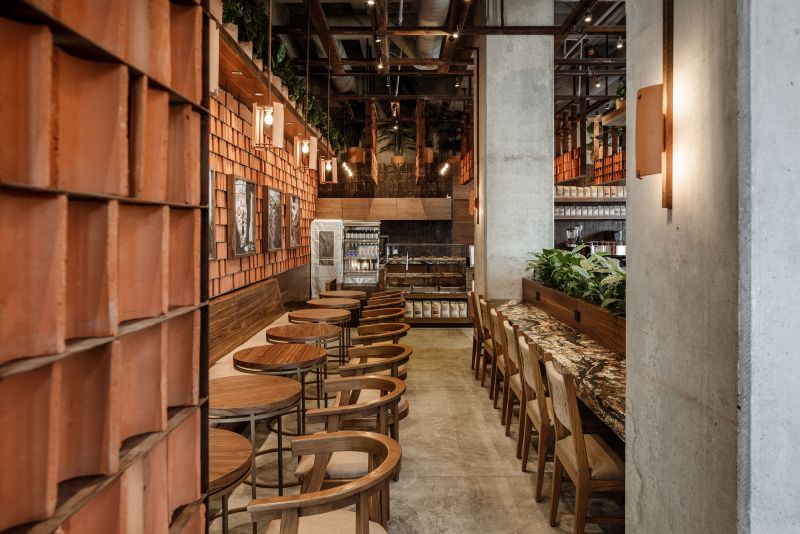 Using this clay tiles as part of the interior design on the walls, not only conveys their ways of life, but also offers a unique and warm texture that will function as an ambiance trademark for the brand. When the light is set against the texture, it acquires depth and its curved shadows resemble coffee beans, connecting the space to the product.
