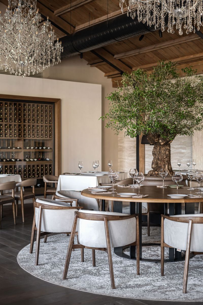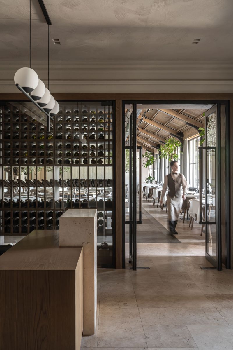 Thus, a restaurant of 1600 square meters is a kind of well with a cozy courtyard with a fountain and an abundance of greenery inside. And the uppermost material of the project, rustic travertine, builds up a domestic comfort of a sunny country and performs an enchanting function inside the restaurant.