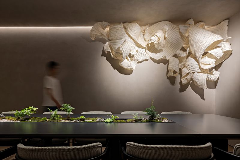 The meeting room is a place to gather for discussion and meeting. The faith that the space pursues is expressed by the three-dimensional decoration on the wall in a restraint way.