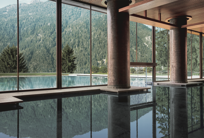 A set that seems to emerge from the forest and integrates perfectly in the landscape in which it is located; in coherence with the philosophy of the Brand, Lefay Resort & SPA Dolomiti reinterprets The traditional architecture of the place, finding the recurring elements of mountain constructions, such as wood, stone and the rigorous simplicity of finishes, mediated Through a strong Italian style that confers prestige and luxury internationally.Starting from these elements, the Studio Apostoli, a multi-award-winning architectural signature in the receptive and wellness field, has laid concepts.