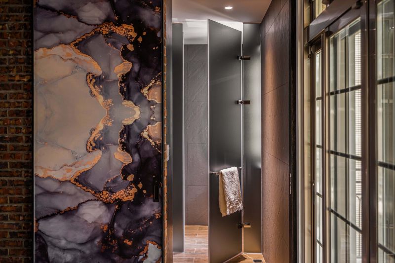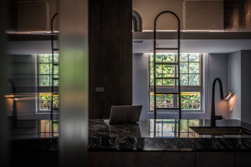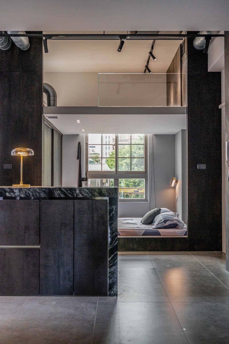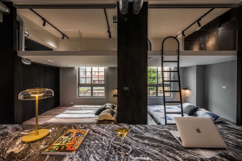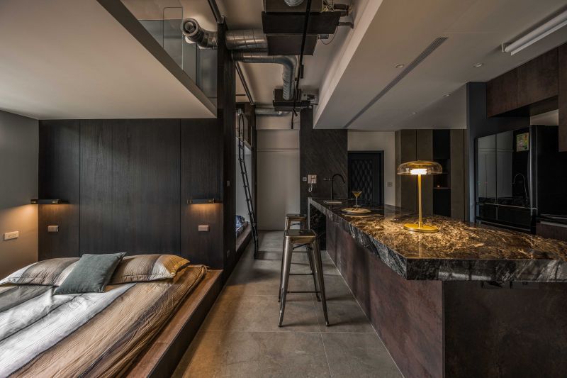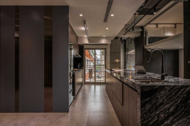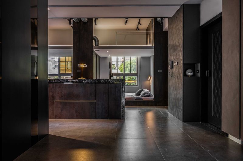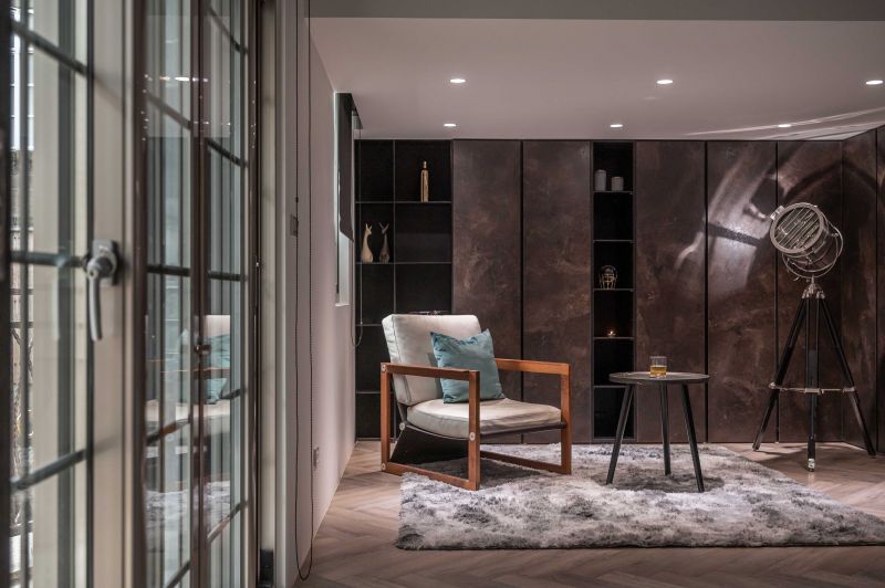 The client prefers dark colors. With the industrial style as the theme, the design team used solid wood, natural materials, marble, and metal to create a deep and introverted texture. It is worth mentioning that the design team avoided mirror elements. With the same tone of different materials, the rustic texture of the natural stone and the large format printing of the oil-painted door panels echo the natural scenery outside the windows and show the prestige. Last but not least, the design team adopted an open plan to connect each area so that both public and private areas can be full of joy.