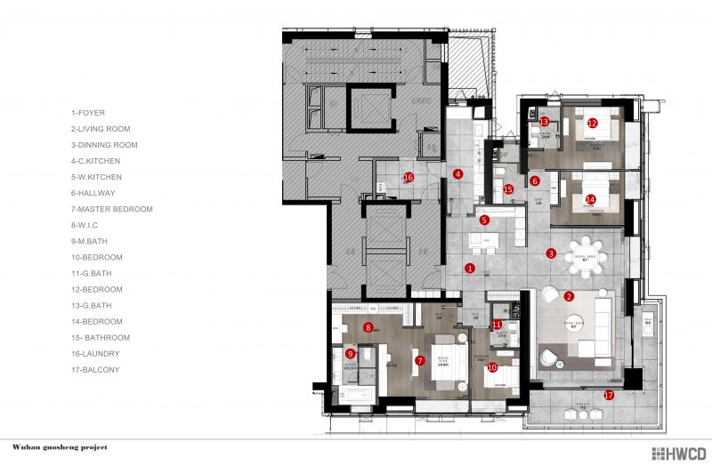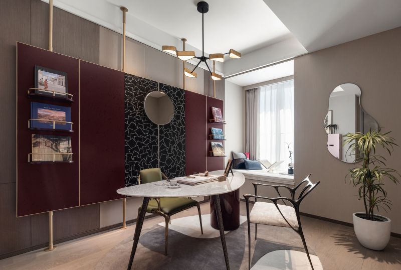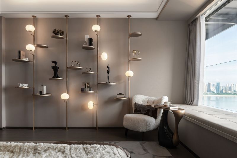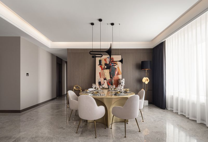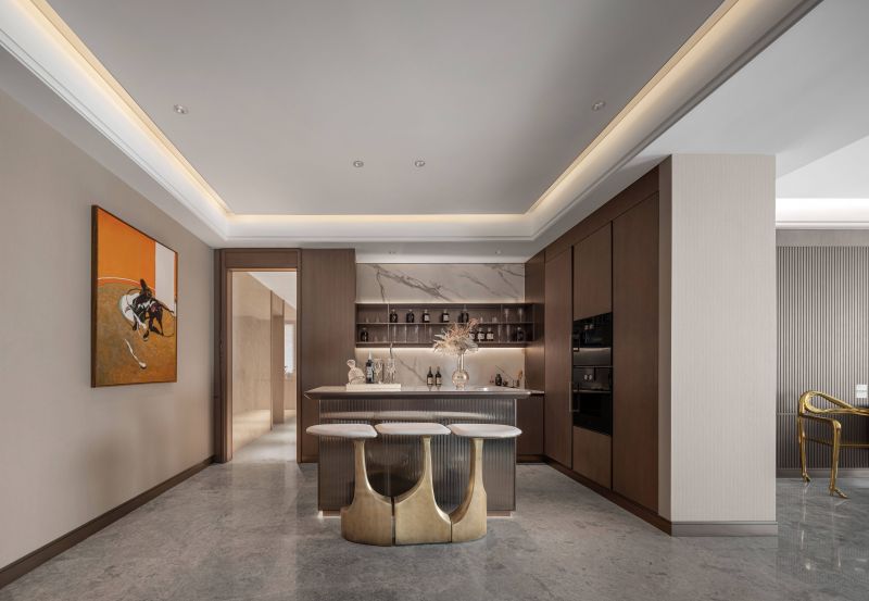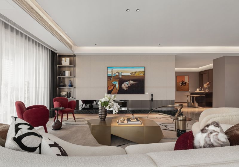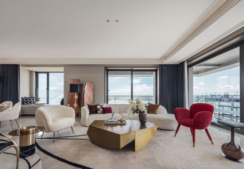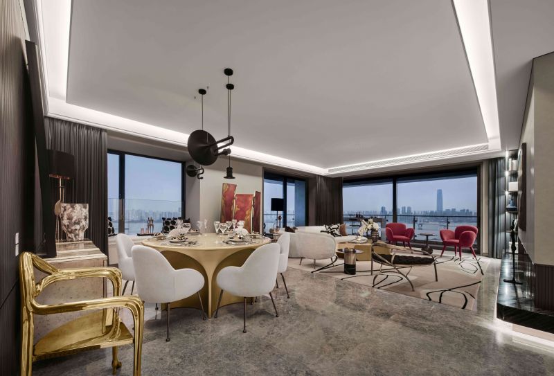 Designers focus on contemporary aesthetic trends while bridging the past's classics and the architecture's inherent temperament. The space, culture, and art of living are interweaved to create a stylish, elegant, and luxurious project. The floor-to-ceiling windows introduce a magnificent riverside view. With a large amount of warm wood, light-colored stone, and wallcoverings in the rooms, velvet and touches of gold on furniture collide in both a surreal and vintage visual sense. The art and furniture enrich the atmosphere and forms a substantial contrasting effect, mysterious and seductive.