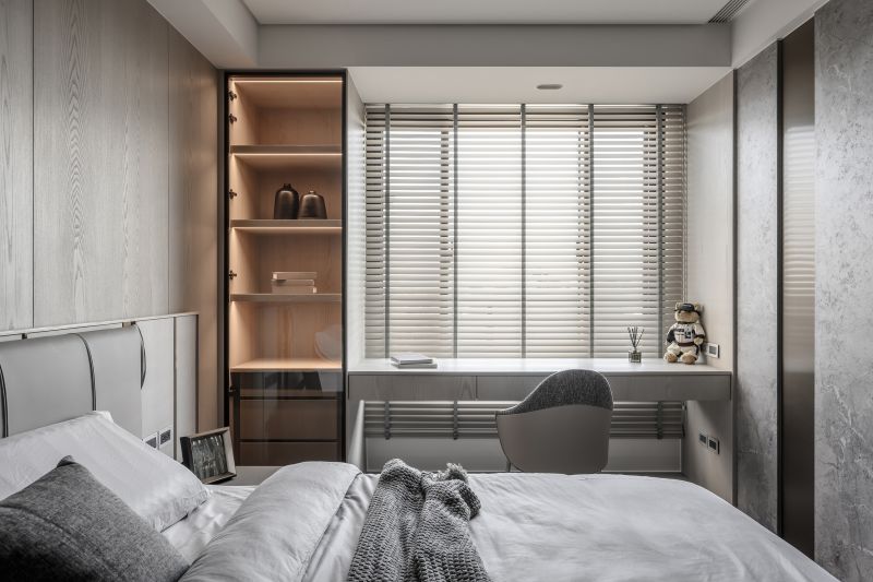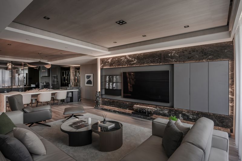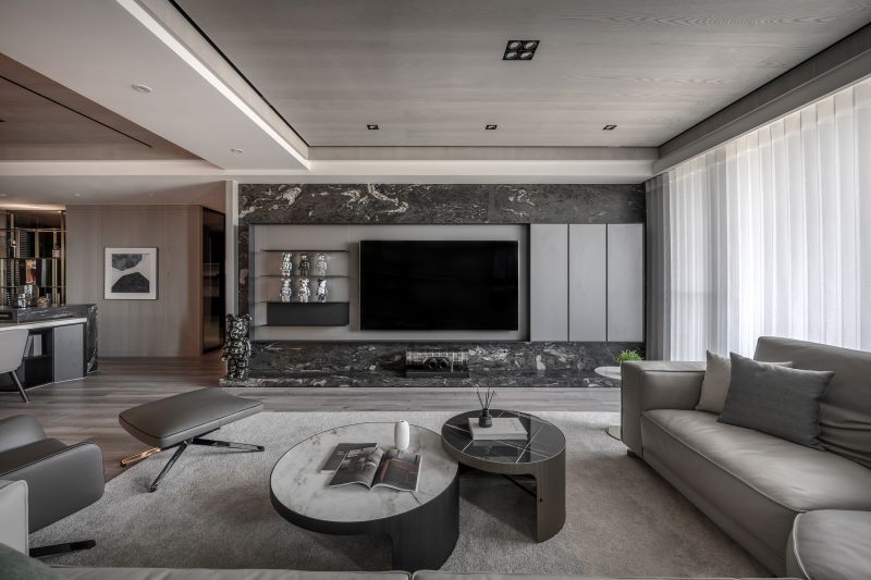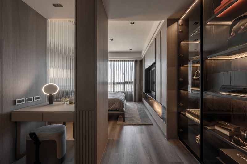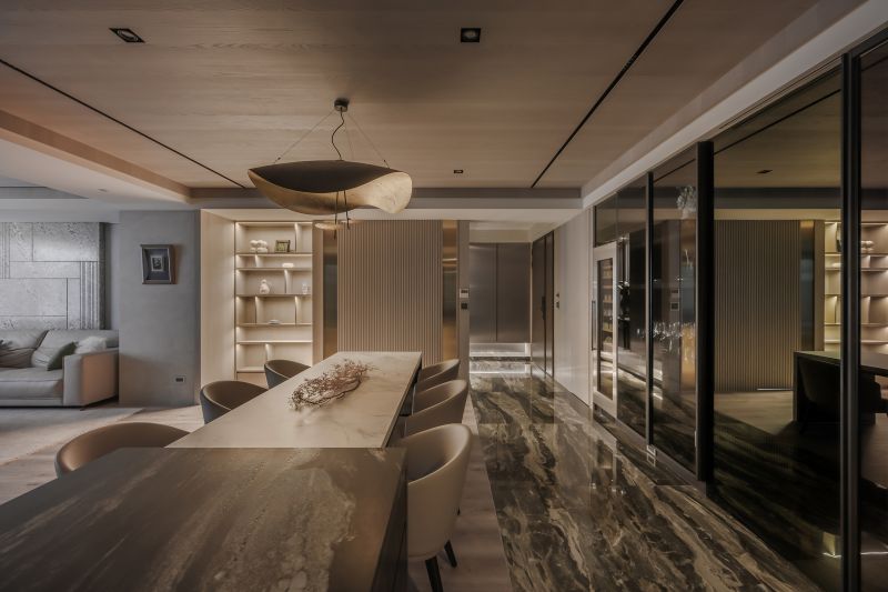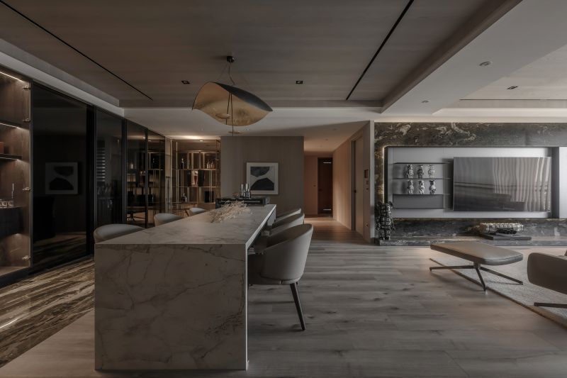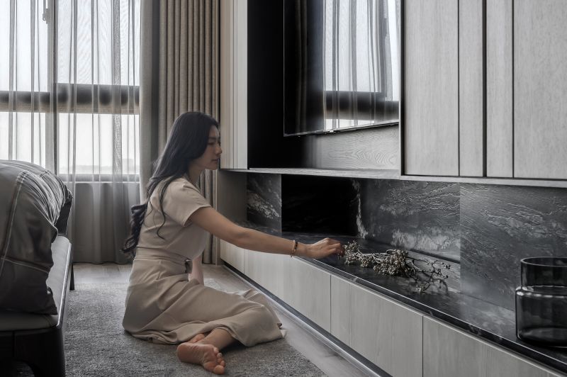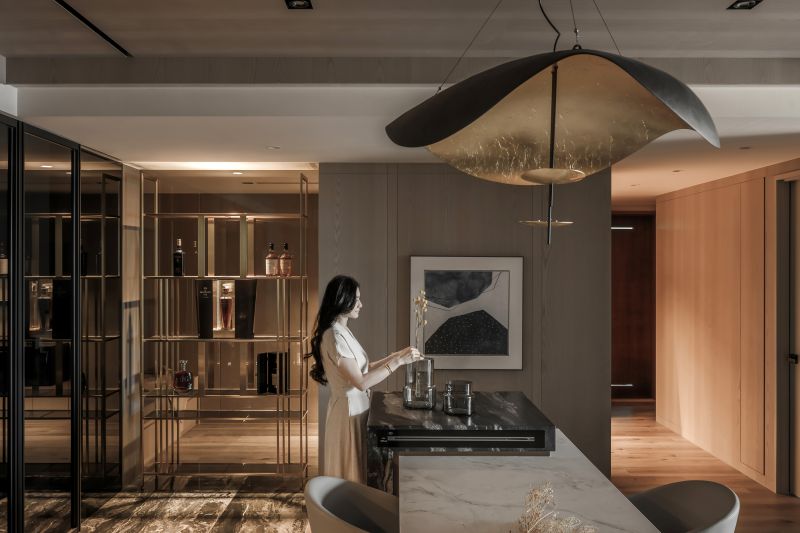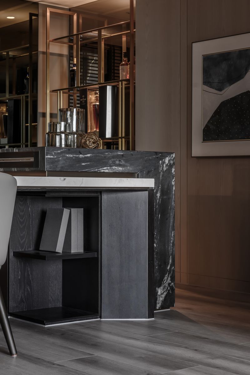 A balanced visualf the mater treat was created with woodwork, stonework, and titanium. The alternating o ials generates a perfect blend of warmth, steeliness, and elegance. Making the entire space sedate, consistent, and simple, thus creating an elegant and tranquil ambiance.