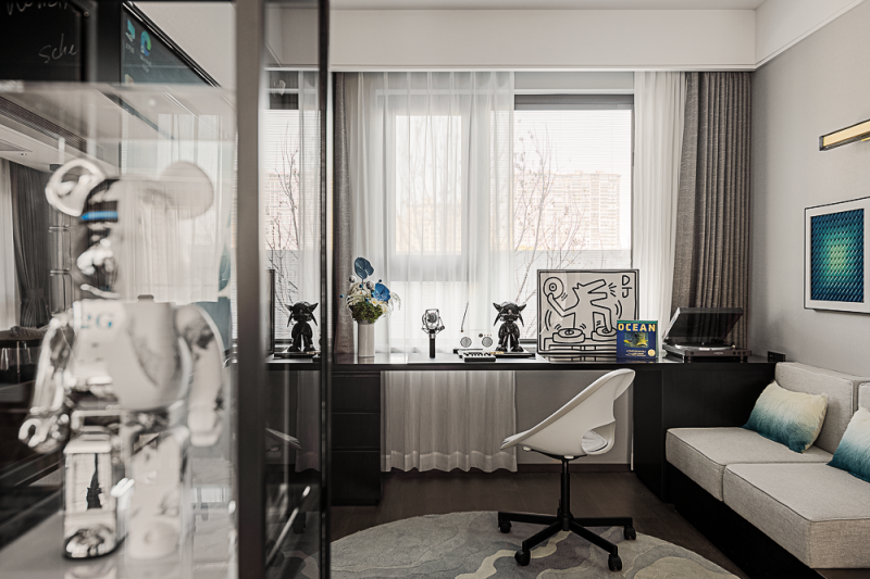 The designer of this case combines urban elite life and modern art closely, endowing the space with bright and fashionable design style, and constructing a social scene interwoven with music and quality in the super wide living room.