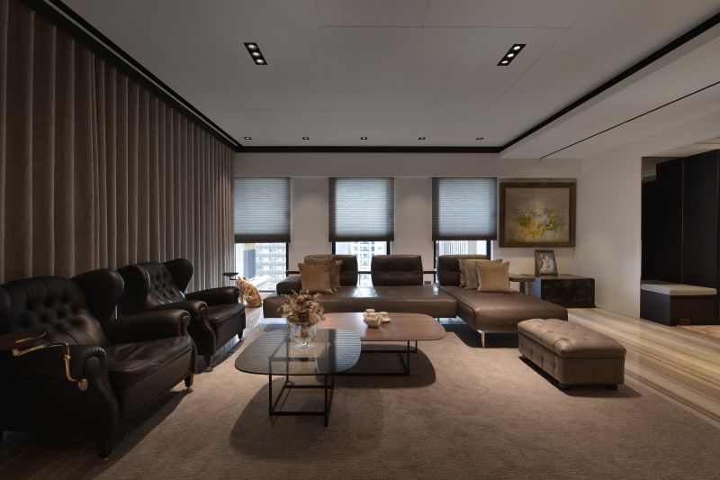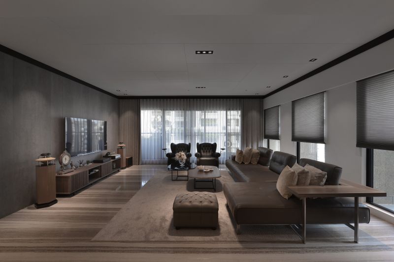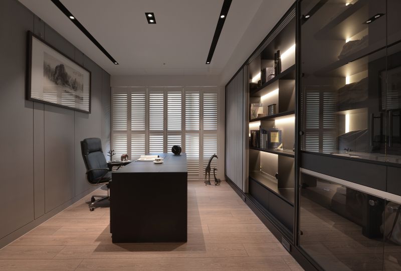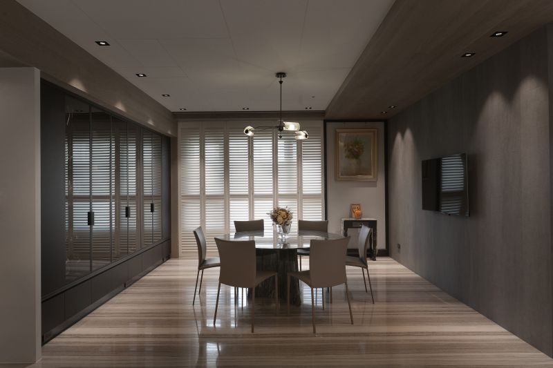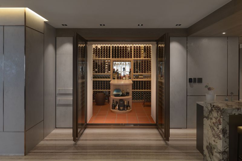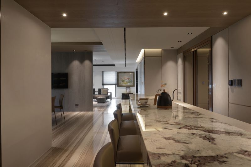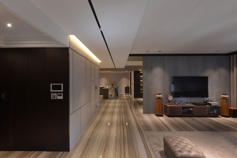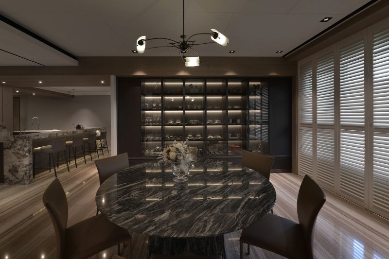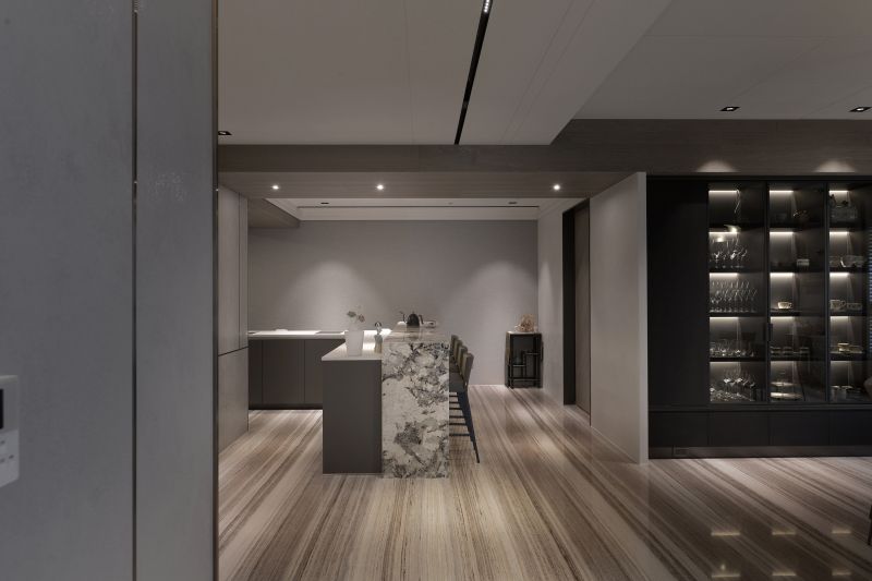 Adopt gray and earth color schemes; exploit marble and titanium-plated ironworks; apply linear trims and integrated splices; conceal the storage cabinets to manifest the minimalist yet stylish features.