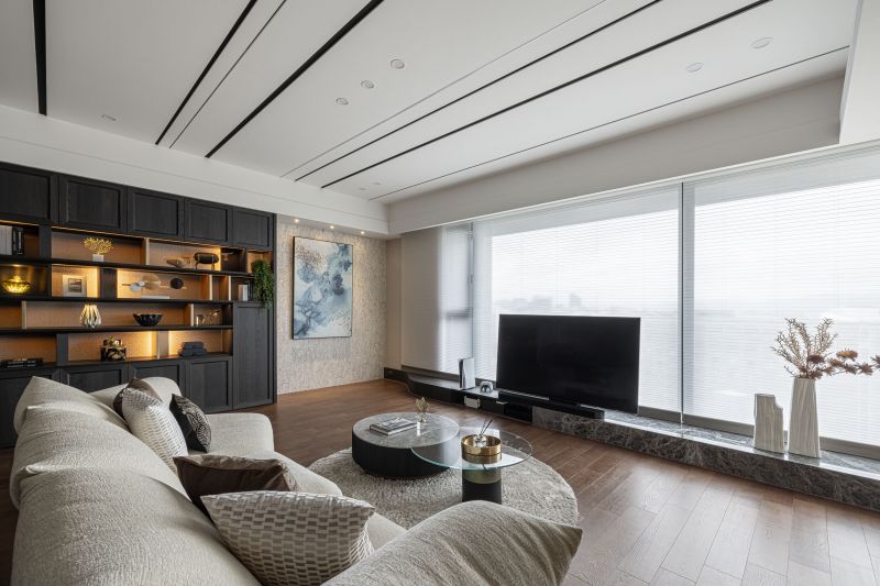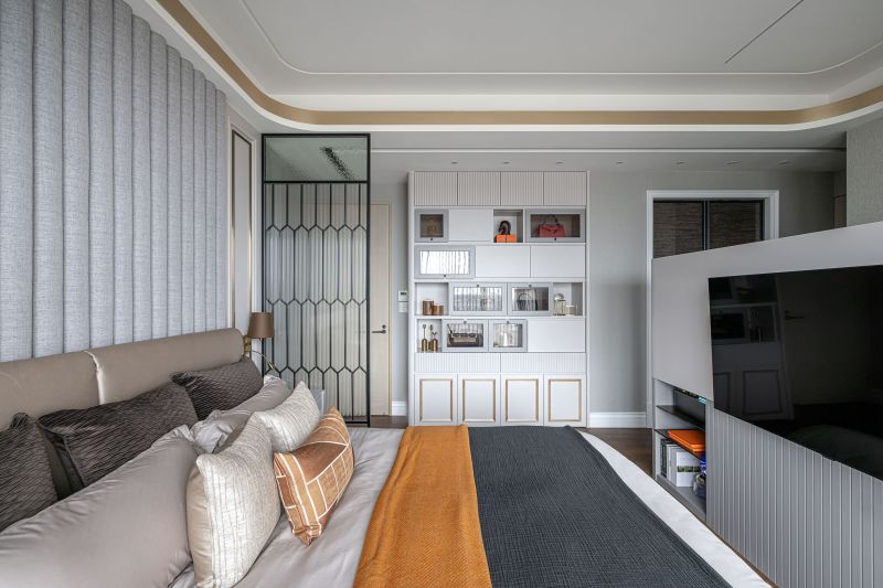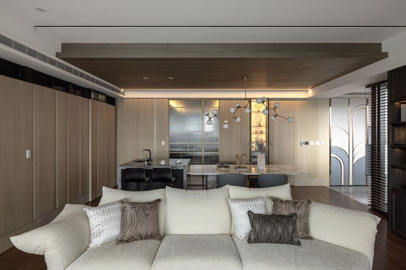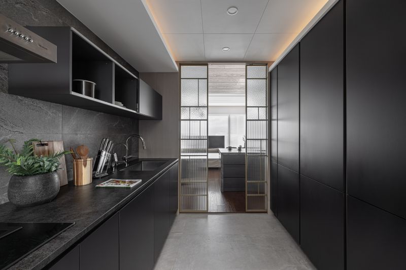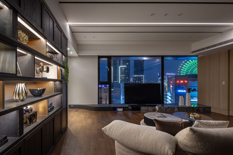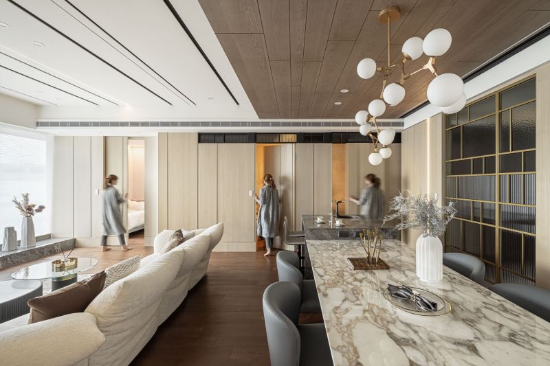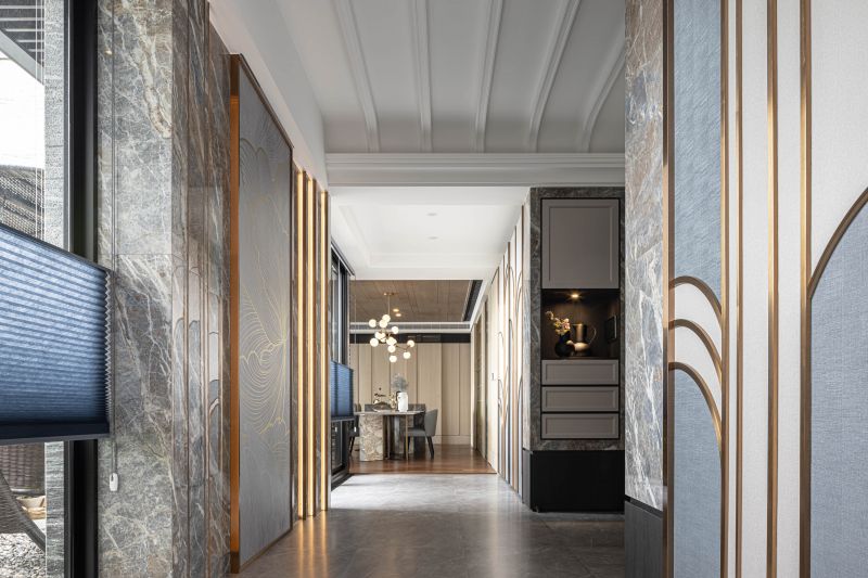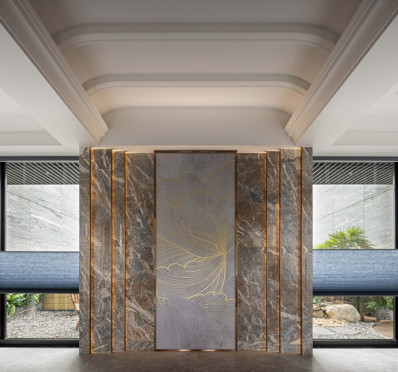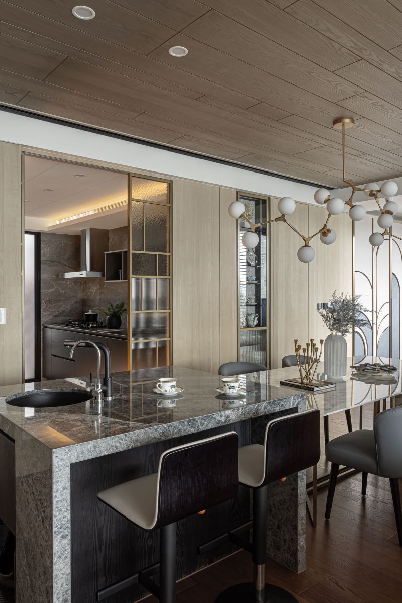 The contoured metal door is ingeniously matched with glass, marble, and leather, which endows a new expression of the modern mix-and-match style for the space. As a result, simplicity is not merely simple, while elegance is not just feeble; it is both low-key and luxurious at the same time.