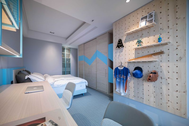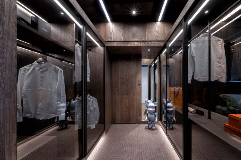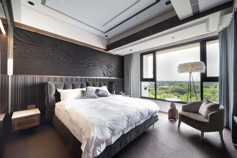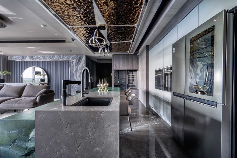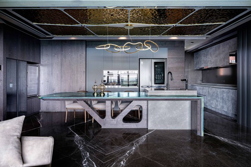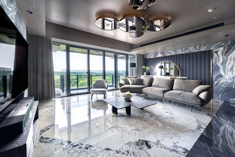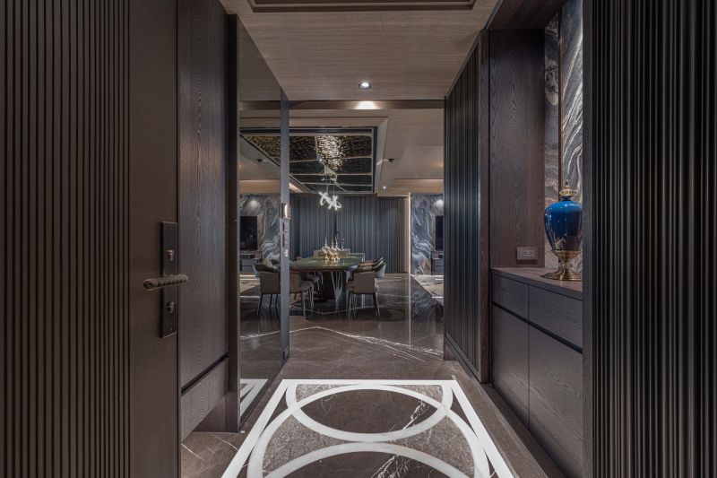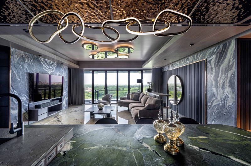 The design is full of "rhythm" in both the public and private sectors while bringing out the image of nature. The design team enhances the elegant design through the imagery of mountains, rocks, water, and rivers. At the same time, various curves link up the space. For example, the parquet flooring in the entrance hall symbolizes the image of wealth, the titanium panel on the ceiling of the dining room alludes to the pattern of sparkling water, and the pattern on the TV wall and the wall behind the sofa in the living room creates an atmosphere of splendor among the mountains and rocks.