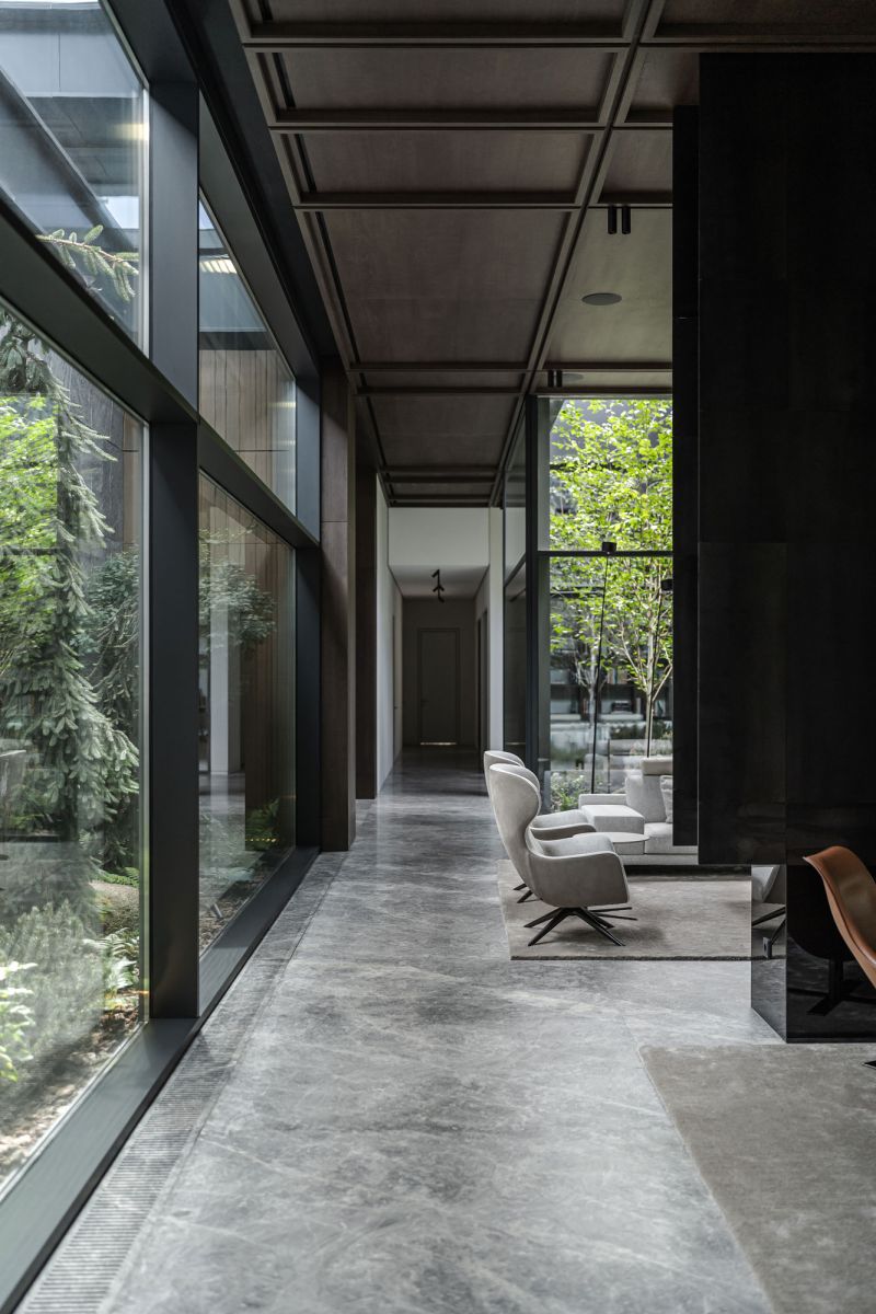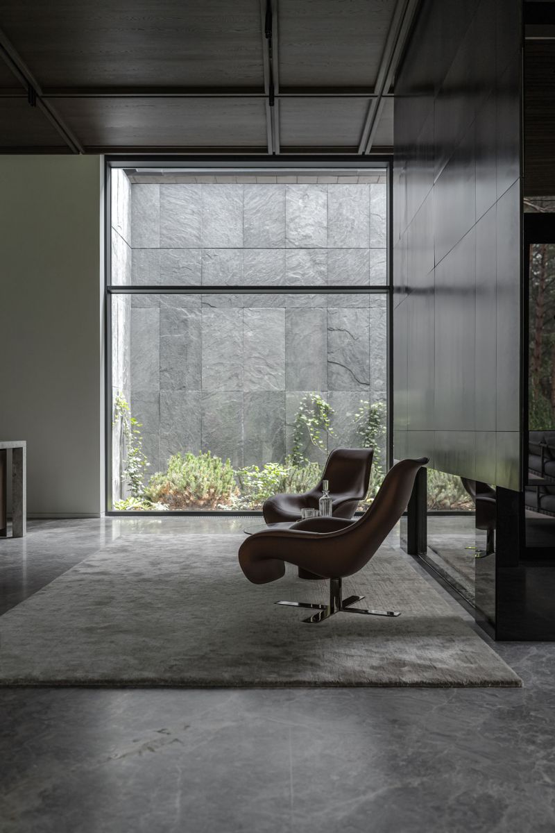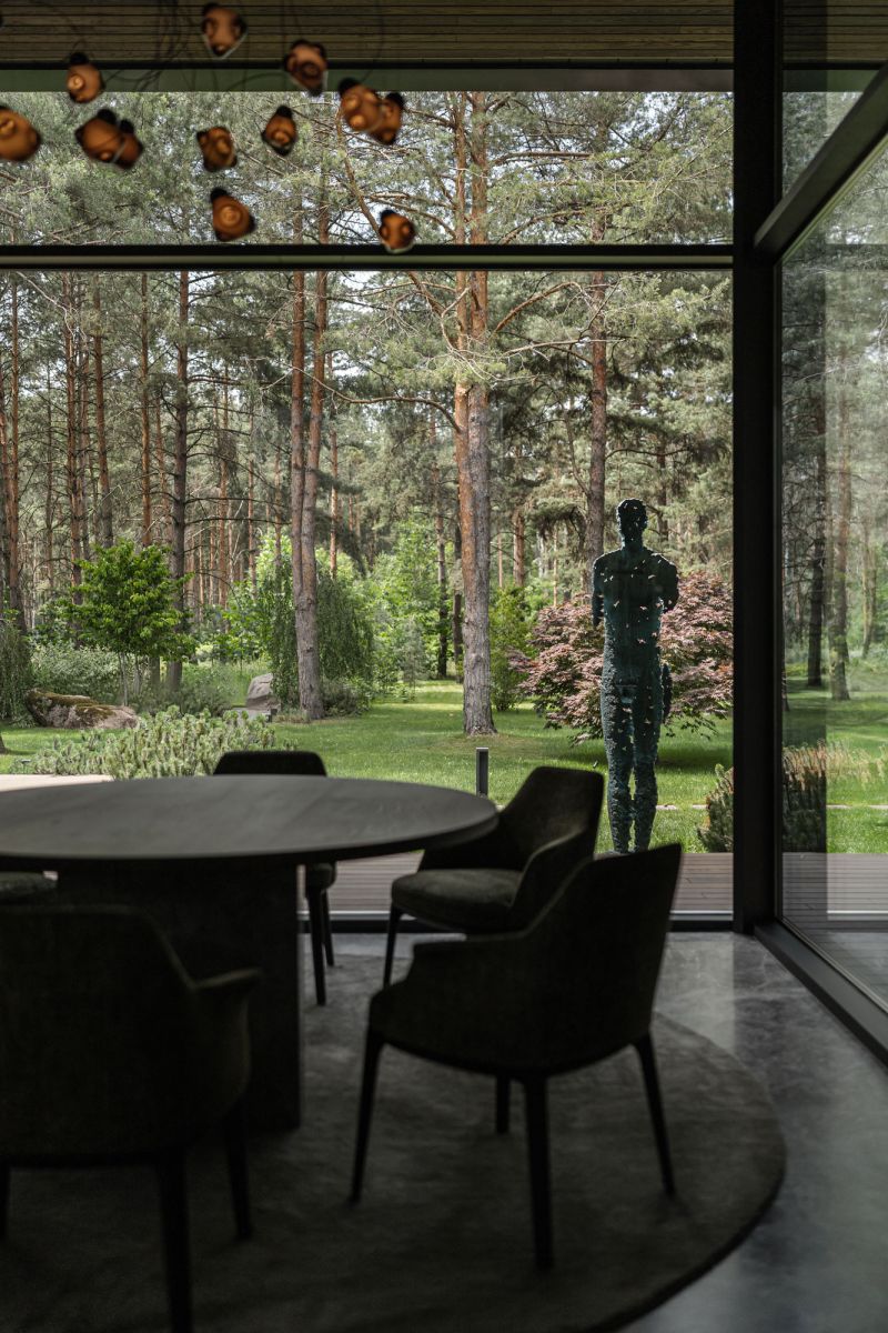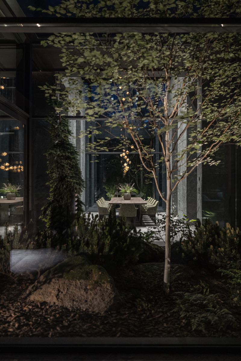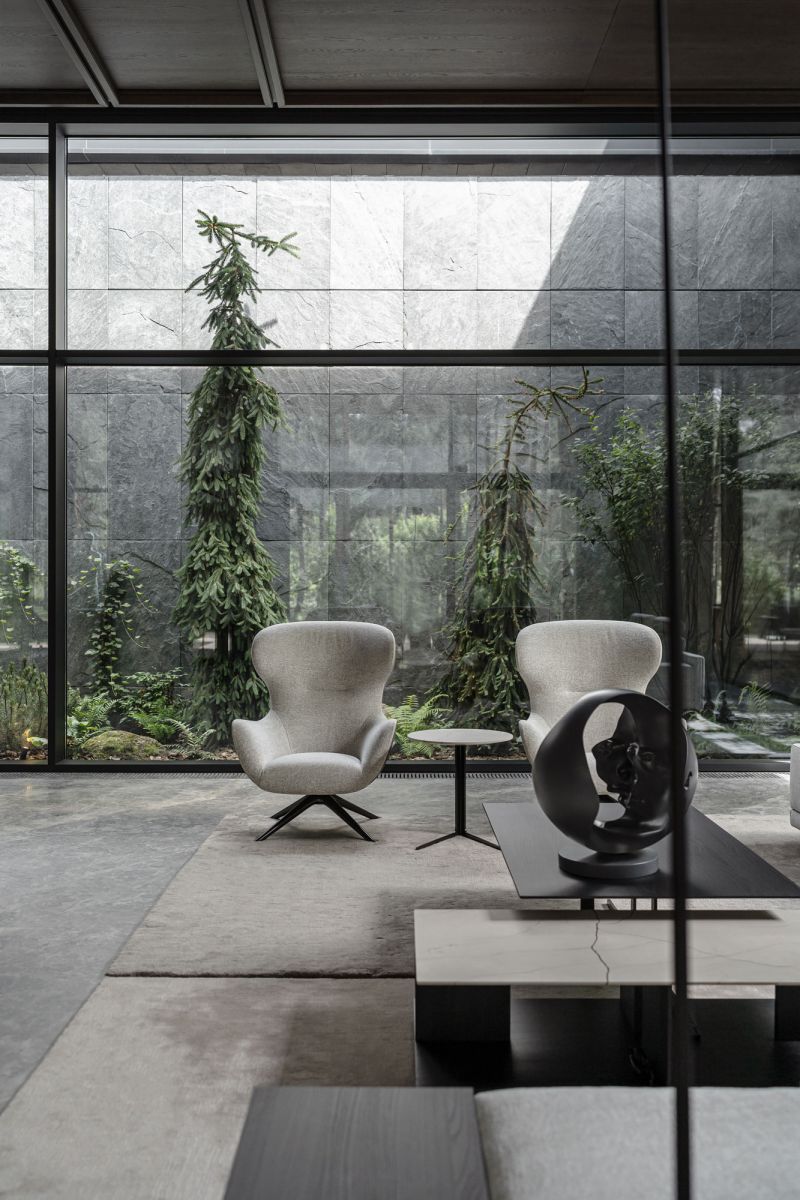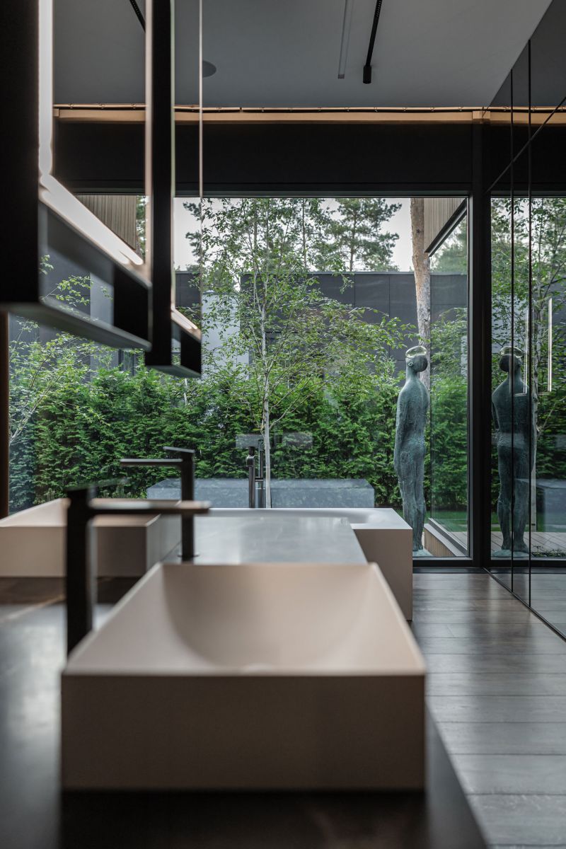 The choice of facade materials includes thermo ash, natural stone, glass, and metal. The living room, which has the lounge area and the fireplace, was designed to be the most spectacular room filled with fresh air. The house's main feature is the presence of green atriums.