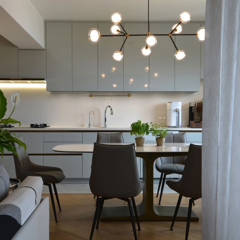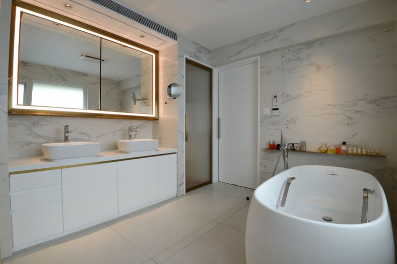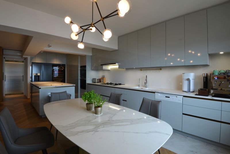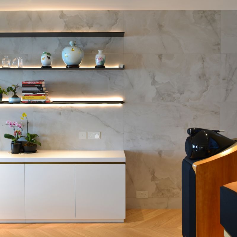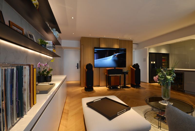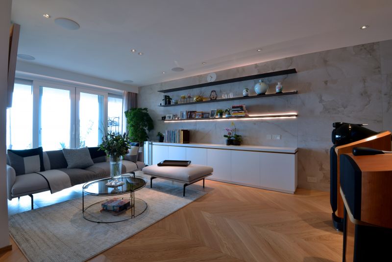 Urban de Escape concept is expressed at the House L by the design of open plan style, which connects Living & Dining areas like a boutique resort. The artistic pattern and textured timber floor run through the whole apartment. Together with the marble tiles feature walls as well as the fully marble finished bathroom, a spa like home is created to indulge in the under-stated luxury style. Sophisticated interior & furniture bronze details in delicate profile enhances the accent.