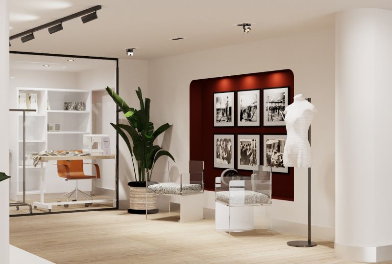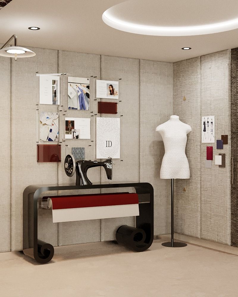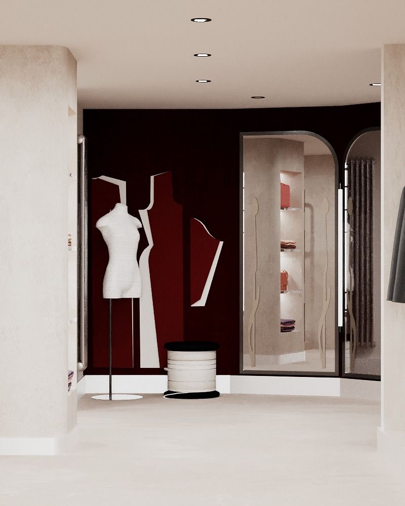 Simple lines, brightness of the room evoke the feeling of the warmth and comfort. The place has bright accents that symbolizes connection to the history and place where people are sewing since immemorial times.