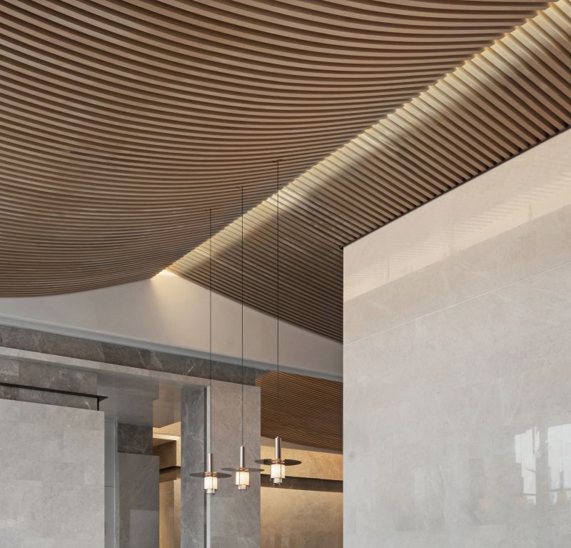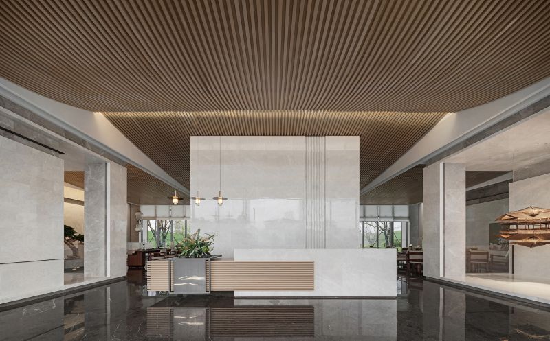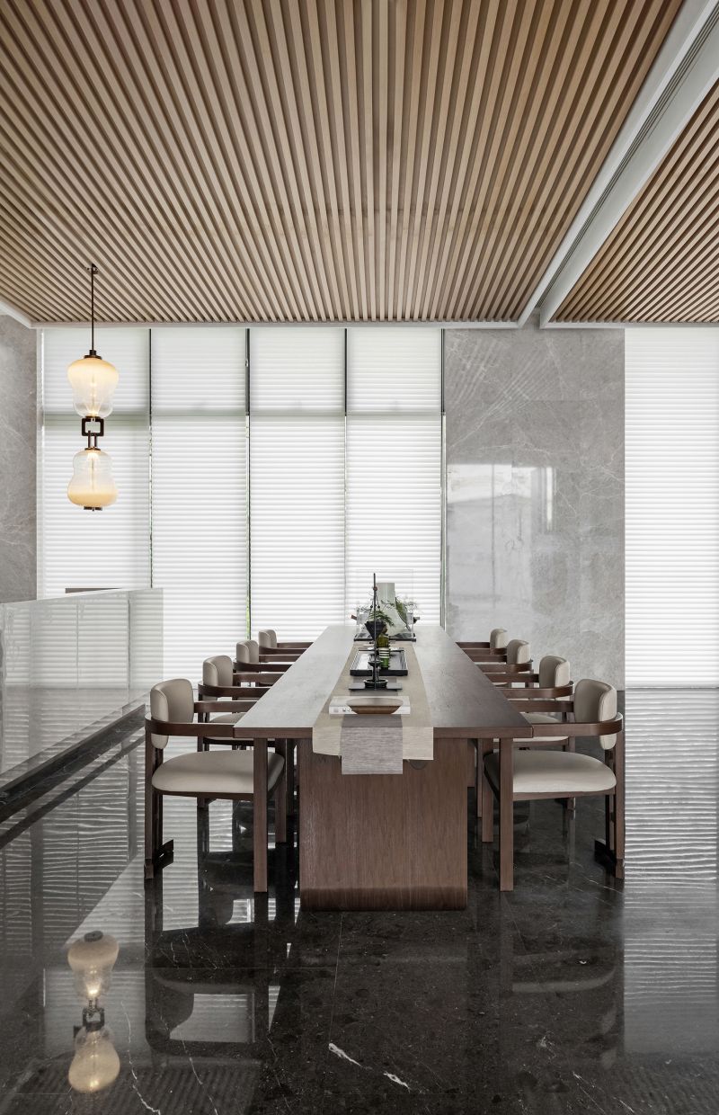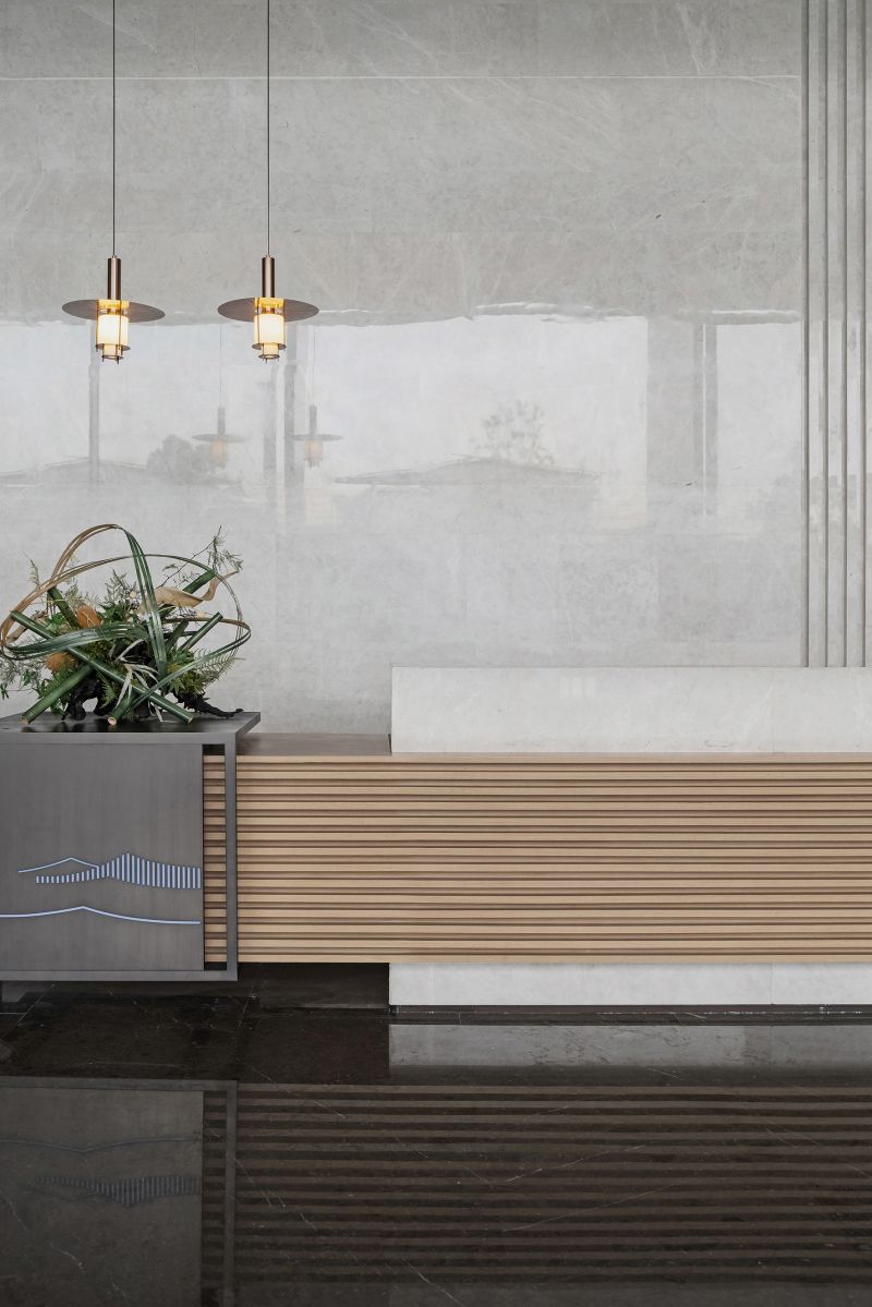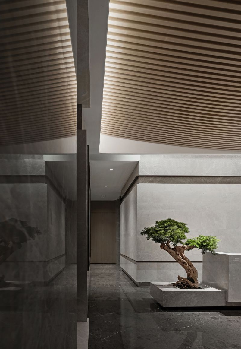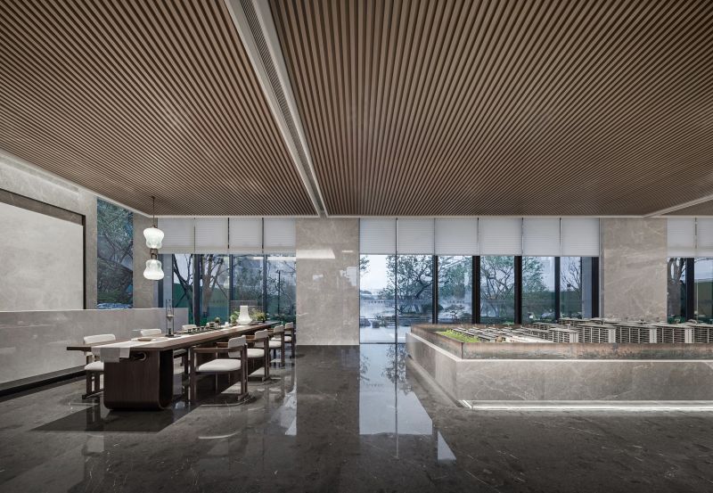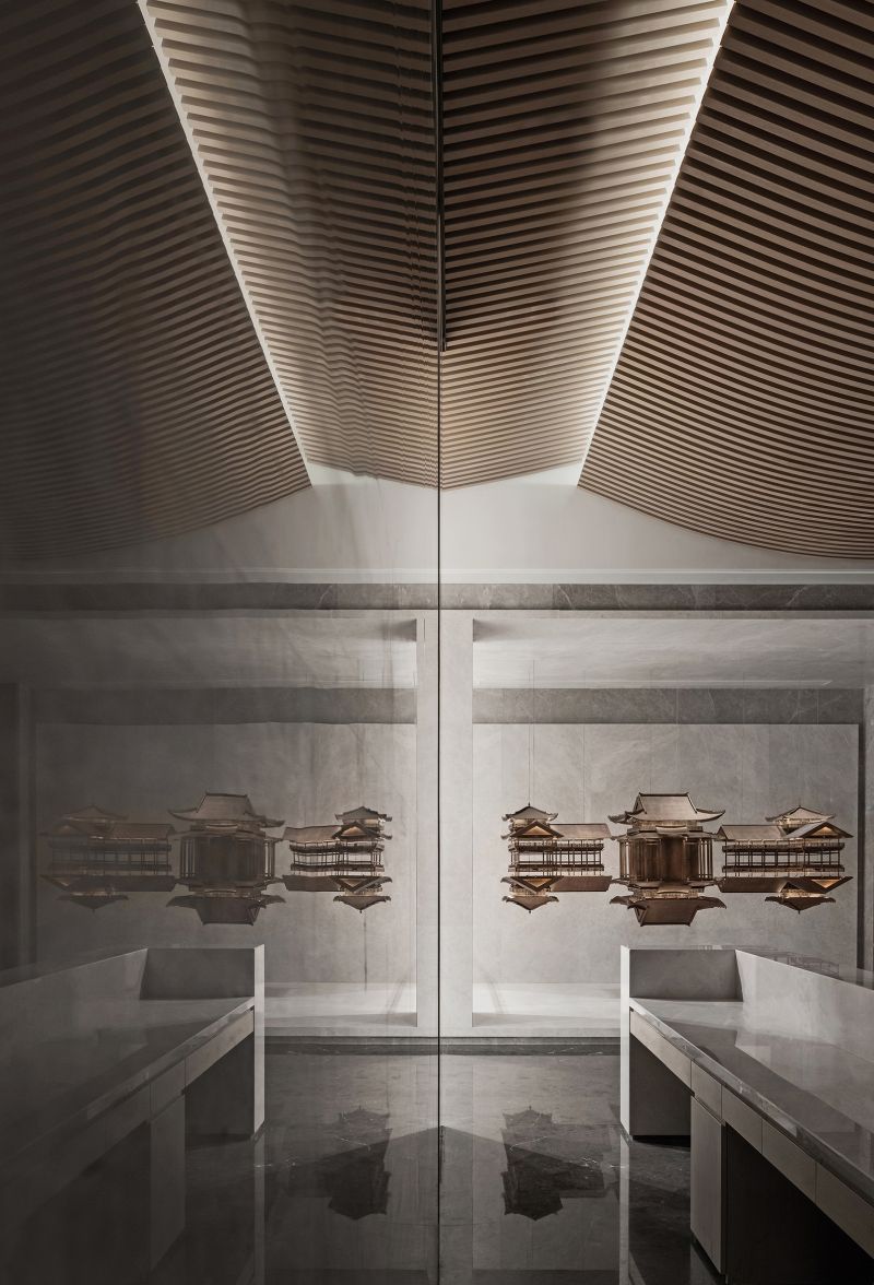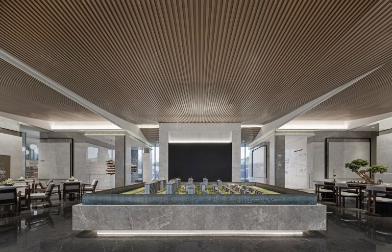 The sales center, through the combined use of traditional Chinese colors, simple and natural materials, and the decorative elements of incense, tea, paintings, and flowers, is designed to impress visitors with its profound elegance. The design of the entrance hall is inspired by the supreme shipbuilding skill and the delicate and beautiful architecture of the Song Dynasty, and therefore the ceiling features soft contours and curves overhead.Walking past the screen wall, one comes to an area with three different spaces, namely, the sand table, the book and tea bar,and the meeting space.
