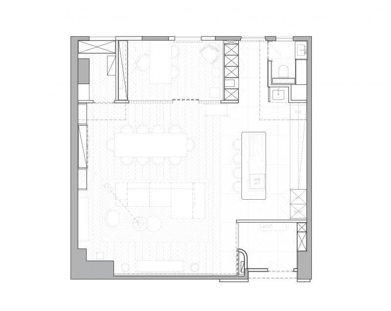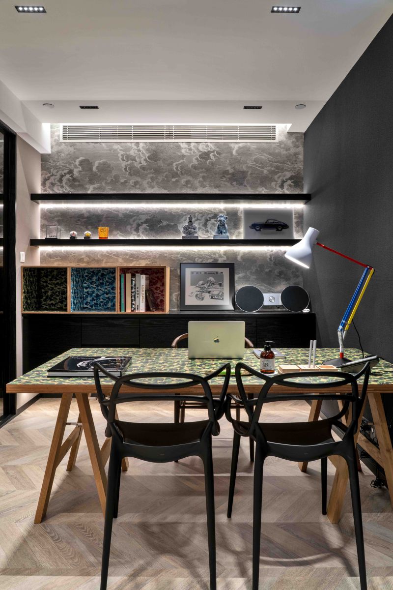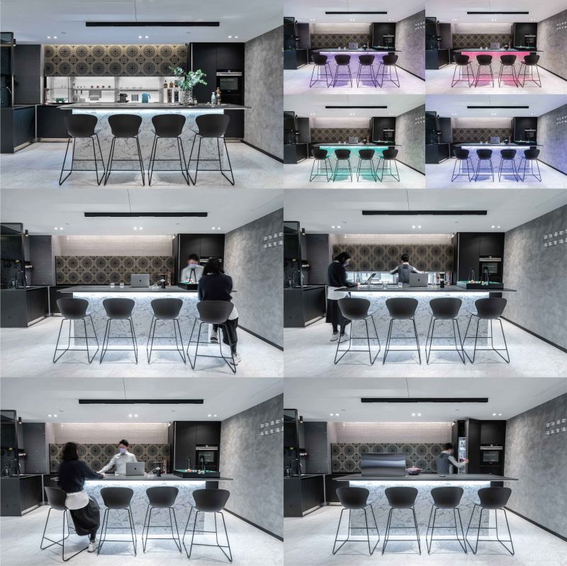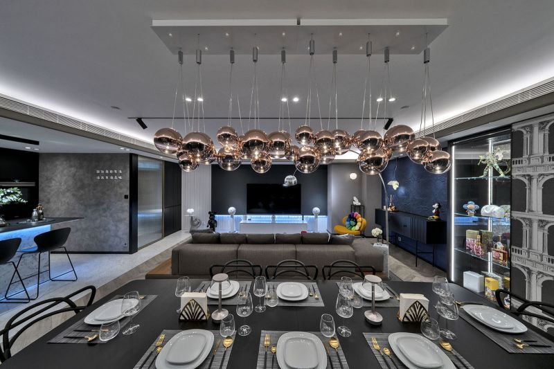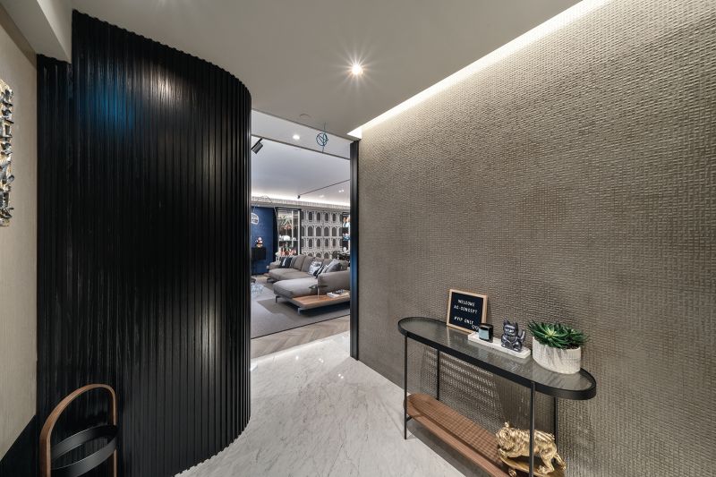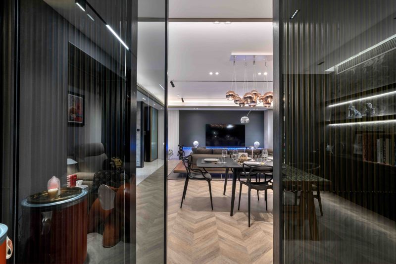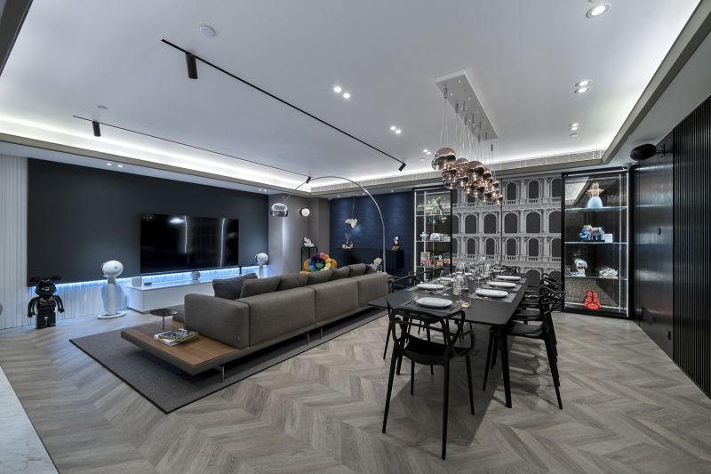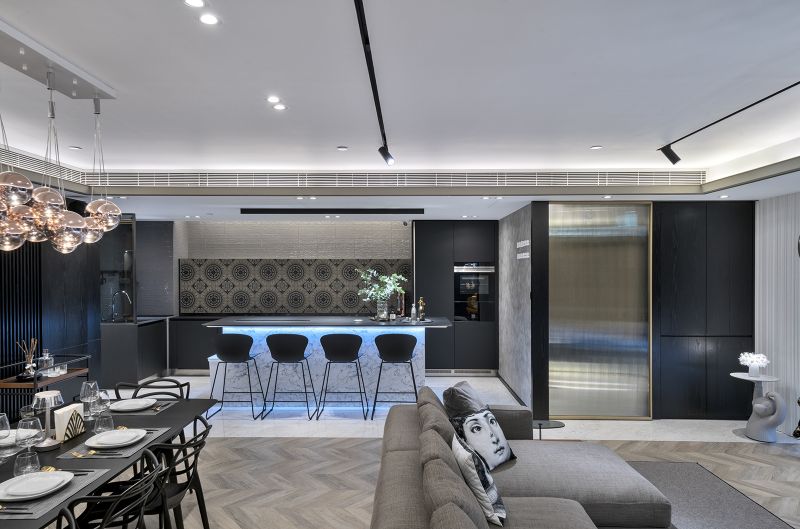 To increase the sense of space and to encourage interaction, an open-plan environment was adopted. It was mainly divided into an entrance, living area, dining area, kitchen, and a workspace. Designers focused on creating layers by using various kinds of colour tones, materials and lights. Also, a well-developed automation (including lighting, air conditioning, sound, and security was adopted in the design.)