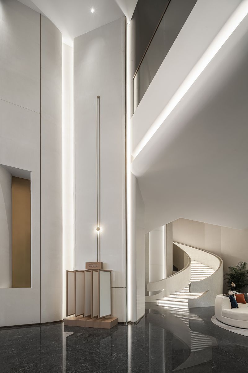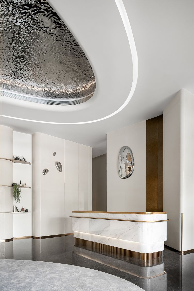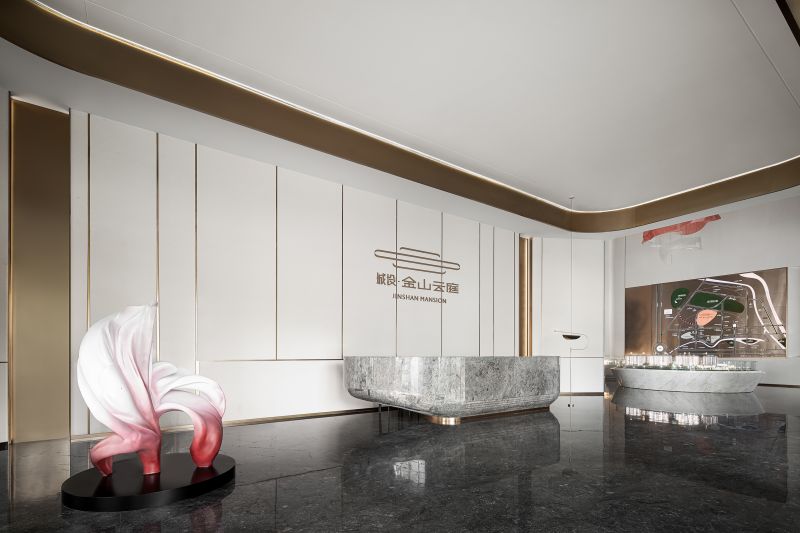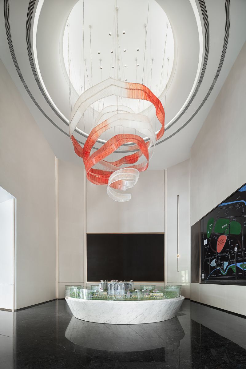 The floor sculpture in the concierge area is inspired by the budding bud. It adopts the external architectural form of blooming flowers, borrows natural elements and combines floral art, as if swaying in the wind gives the sculpture a new meaning, and then constructs a free, flexible and imaginative quality space. The sand table area is pure and simple. The hovering art installation adds dynamic balance to all kinds of static, creates the presentation form of art, and makes its charm infinite, so as to promote the superposition of interesting elements of space.