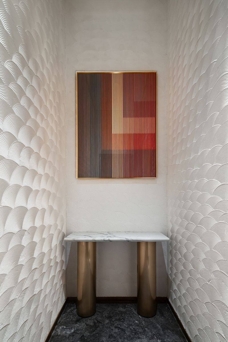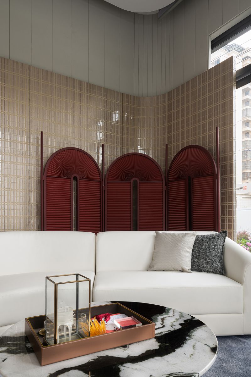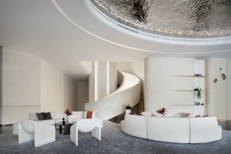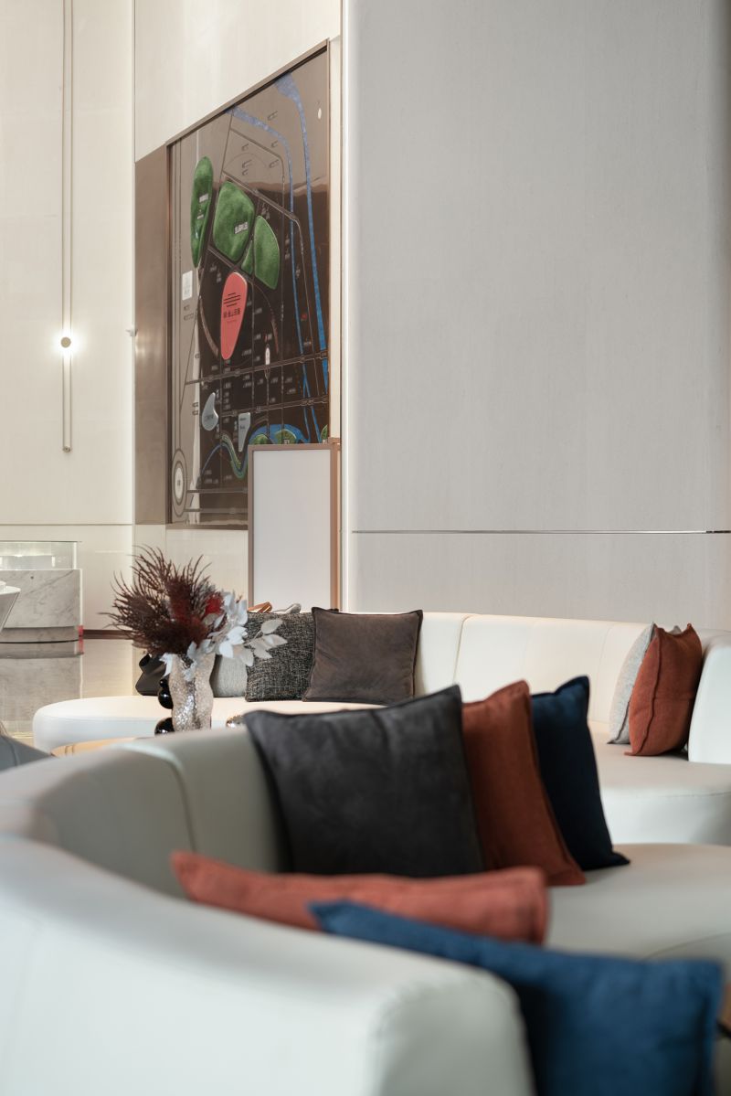 The floor sculpture in the concierge area is inspired by the budding bud. It adopts the external architectural form of blooming flowers, borrows natural elements and combines floral art, as if swaying in the wind gives the sculpture a new meaning, and then constructs a free, flexible and imaginative quality space. The sand table area is pure and simple. The hovering art installation adds dynamic balance to all kinds of static, creates the presentation form of art, and makes its charm infinite, so as to promote the superposition of interesting elements of space.