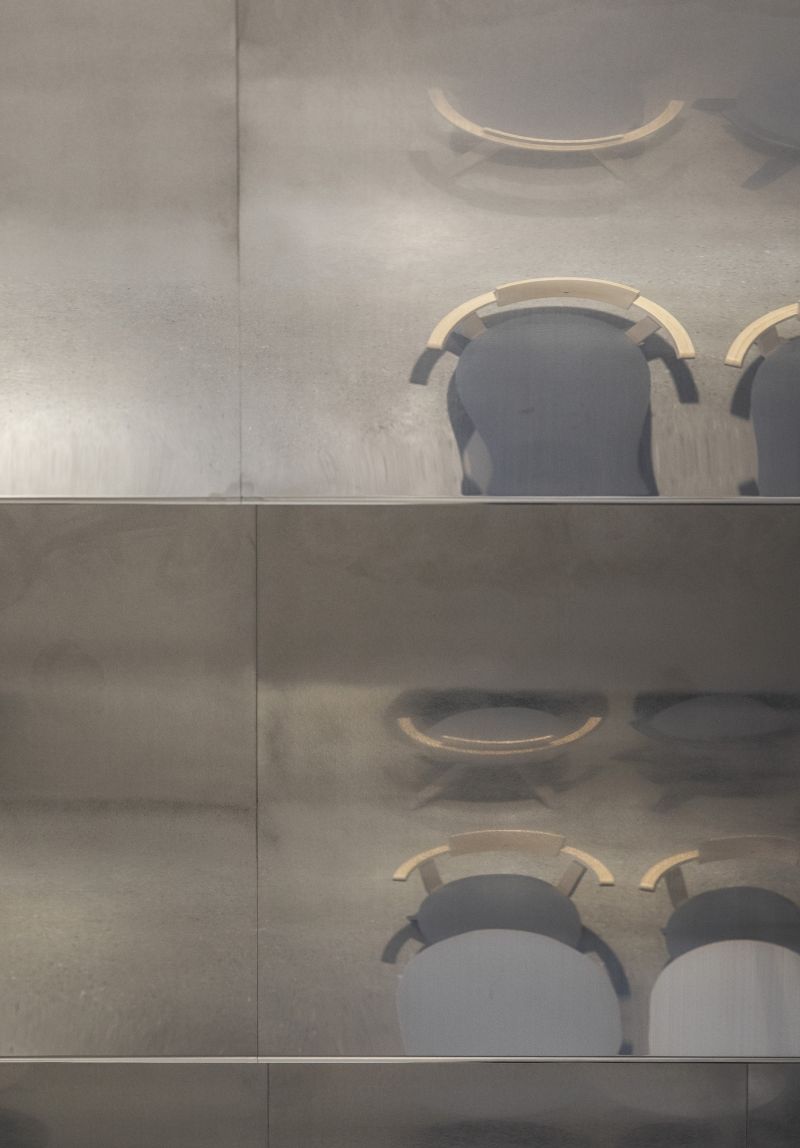 The entire space is designed to resemble the sea surface. This has been achieved by creating waves on the ceiling surface that come form the gradation to vibration of stainless steel processed onto the mirror face.