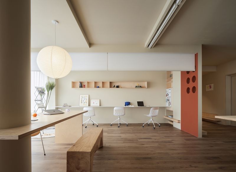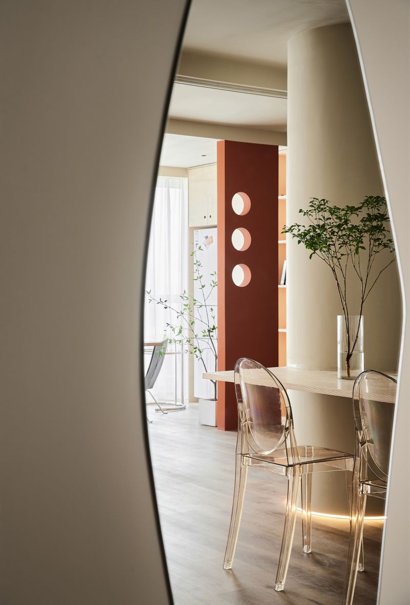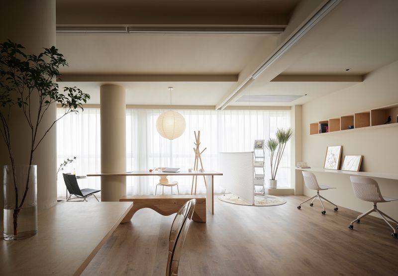 The design industry is also inseparable from communication. We transform the original kitchen area into a communication area, and transform the original cuboid smoke exhaust pipe into a circular column bearing the support point on one side of the negotiation table. The long table provides a more convenient form of face-to-face communication for people. Although the space is limited, we will extend the wall area along the trend, making full use of the combination of steel plate and wall, thus completely presenting a whole area of material selection and collocation.