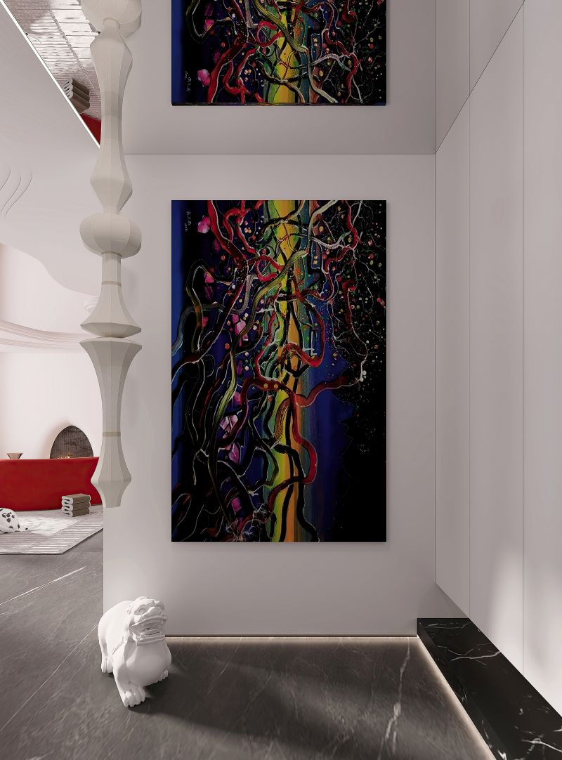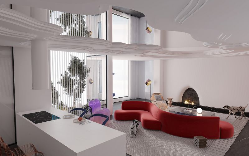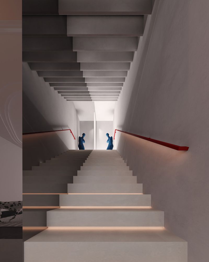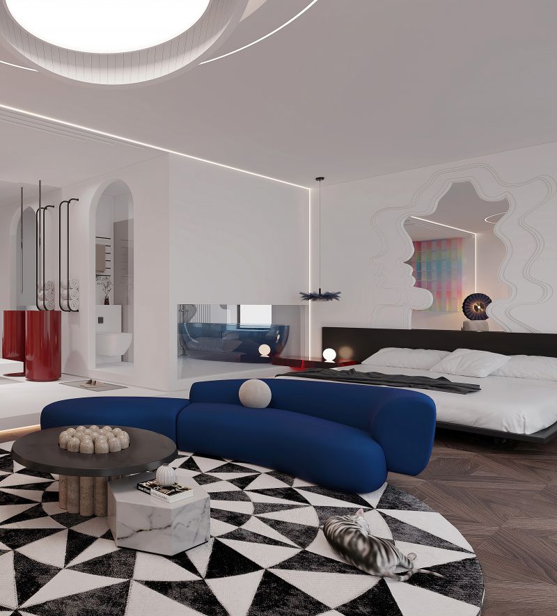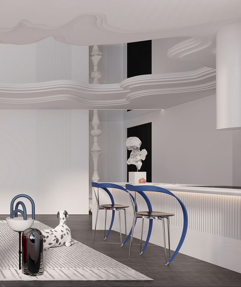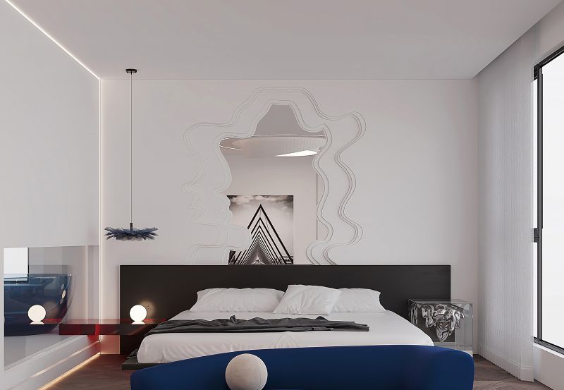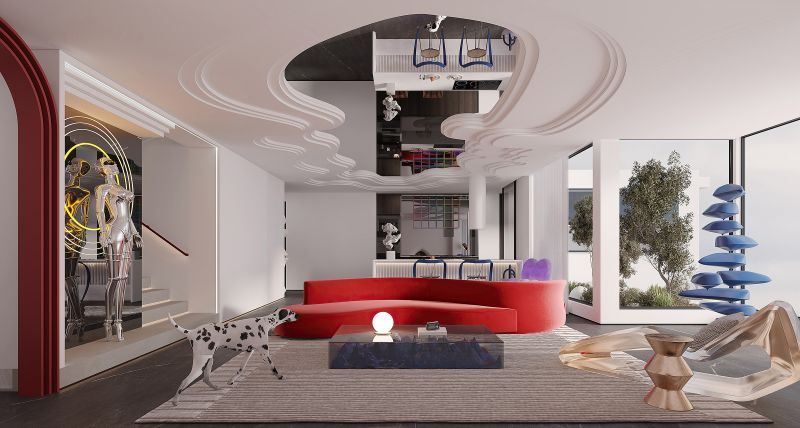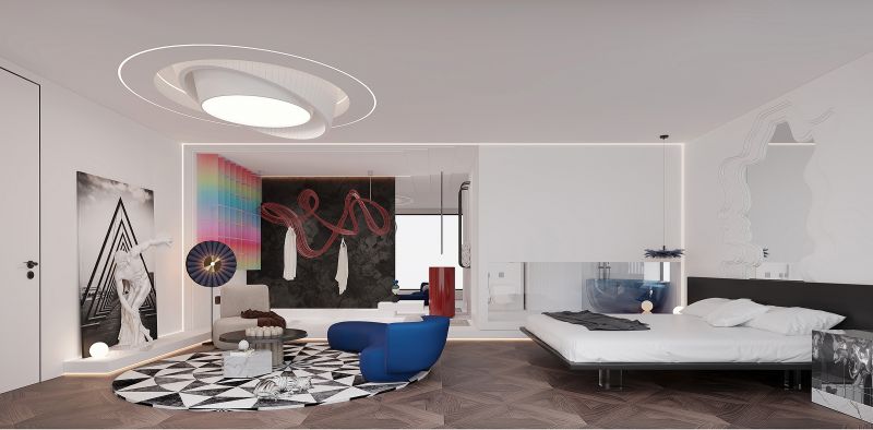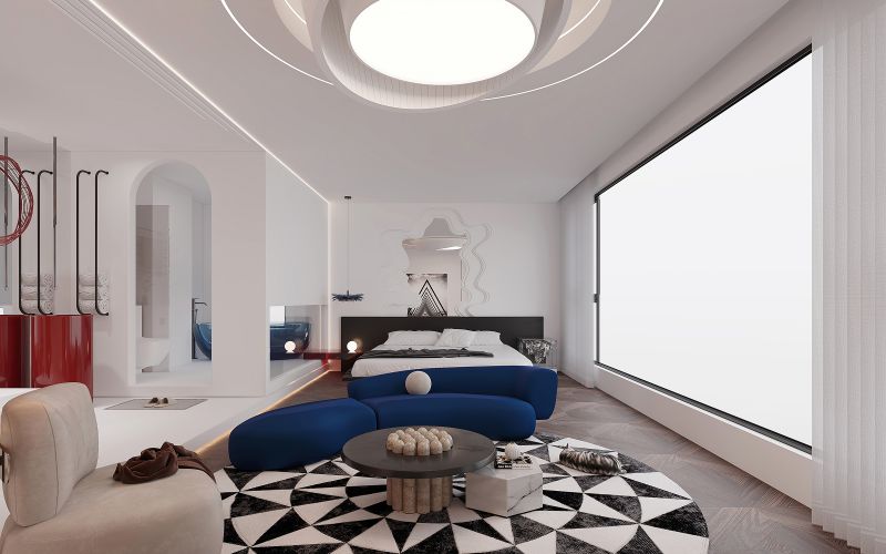 The bright color of the living room becomes the focal point of the whole space, the unique ceiling curve modeling, color blocks and curves, symmetry and asymmetry collocation, create eye-catching visual tension. Interior design is the pursuit of heaven, Earth, walls, furniture and furnishings, including the overall environmental style and unity. The main function of the second floor space is the master bedroom as well as the living room. Simple lines after the treatment of curvature, cleverly to the bedroom to rest, wash the area is divided out, functional significantly enhanced.
