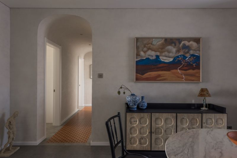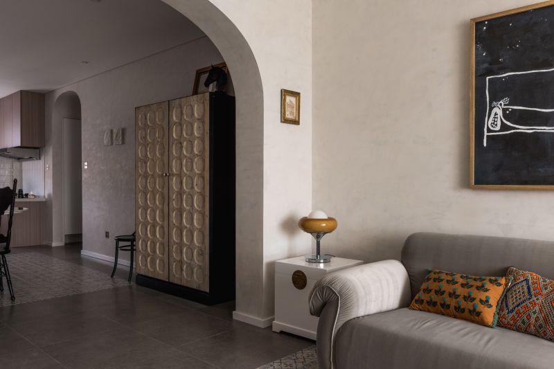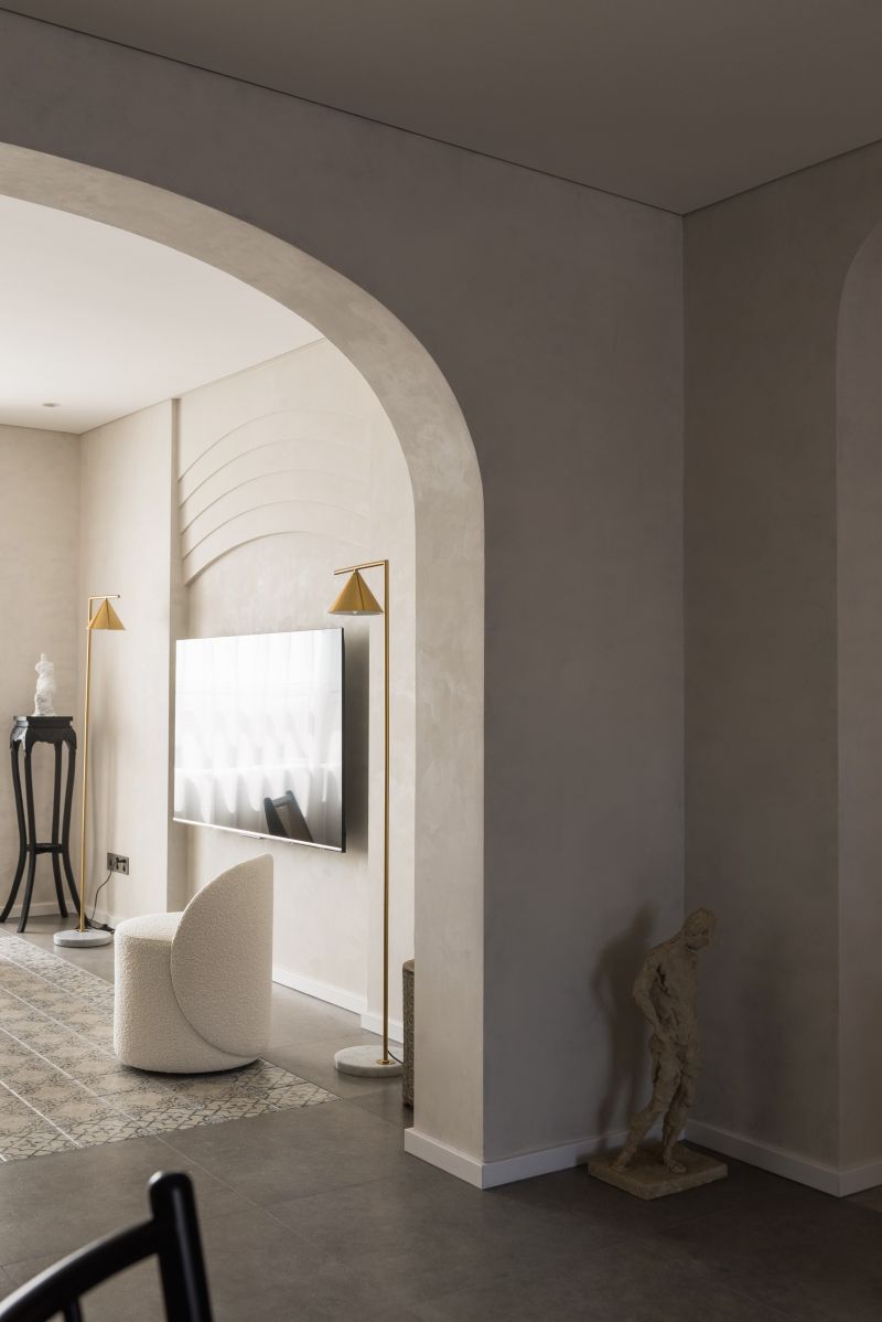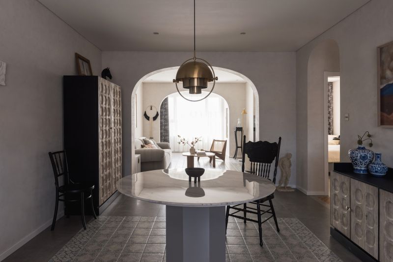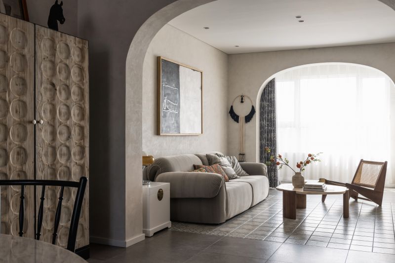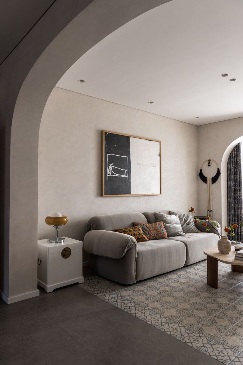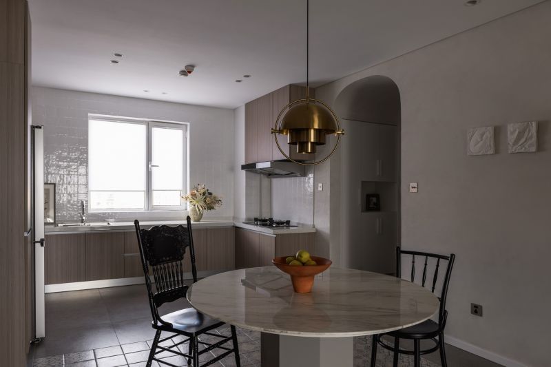 The hostess of this apartment is an artist with unique dressing taste and aesthetic opinions, holding different expectations for this new home that should be low-key but profound. For her Hui nationality, the designers got the inspiration from the mosque this time, taking the arch as the main space symbol to expand the design. The kitchen space, living space and balcony are separated by two arched walls, just like the curtains of the stage performance. Walking through them, one can get the sense of ritual in different life scenes during the day.