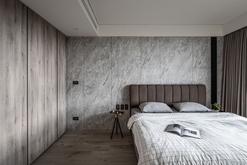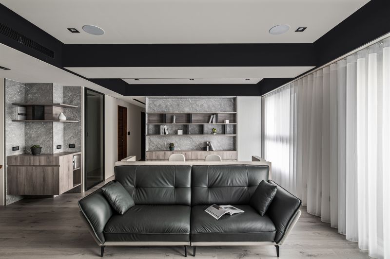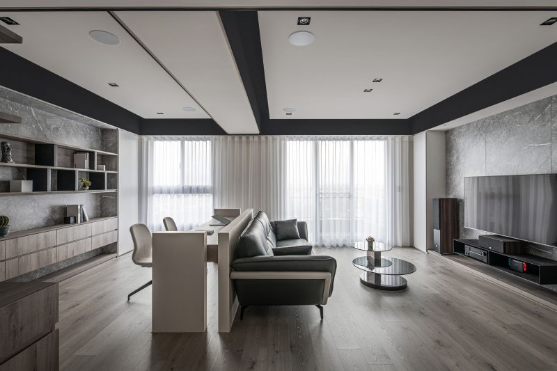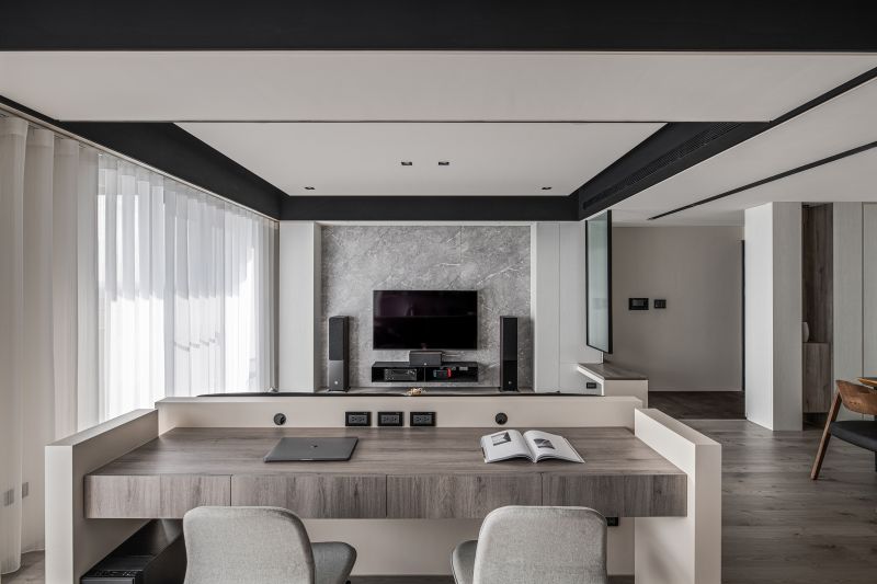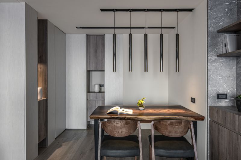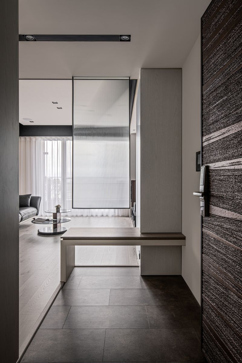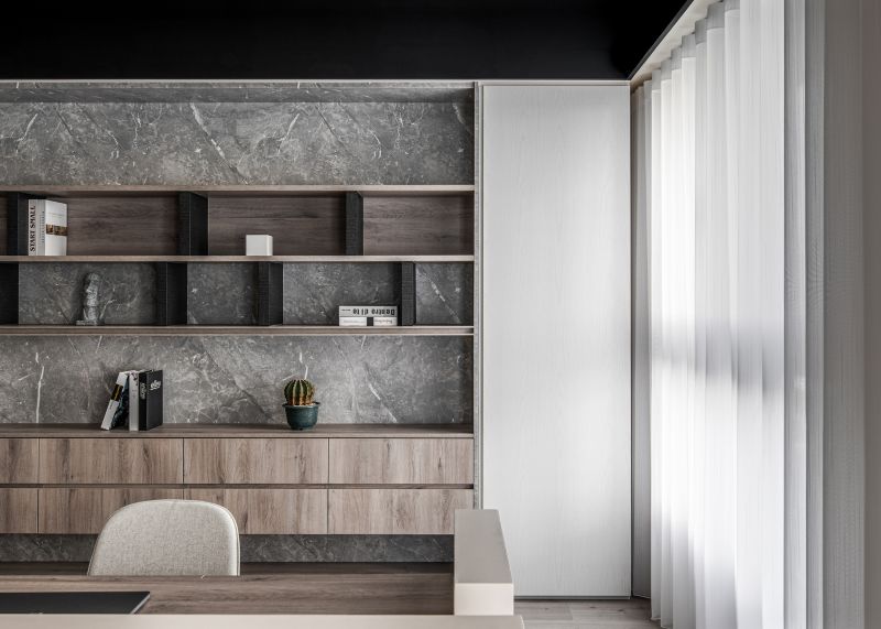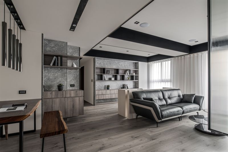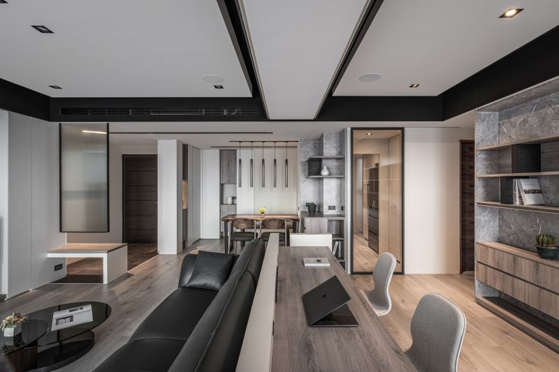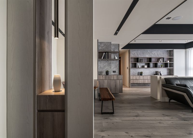The deep, vivid ink color complements the clean white hue vertically and horizontally, shaping clear spatial boundaries. Then, coupled with stable, gray marbling walls, balmy timber elements, and glossy decorative light fixtures understatedly manifest an elegant fashion style. We set up a lightweight figured glass screen and the chase cabinetry, which achieve aesthetics and privacy features. Also, skillfully resolving the homeowners' concerns about geomancy taboo and fulfilling their expectations for a better, joyful life.