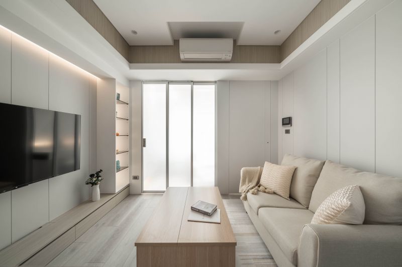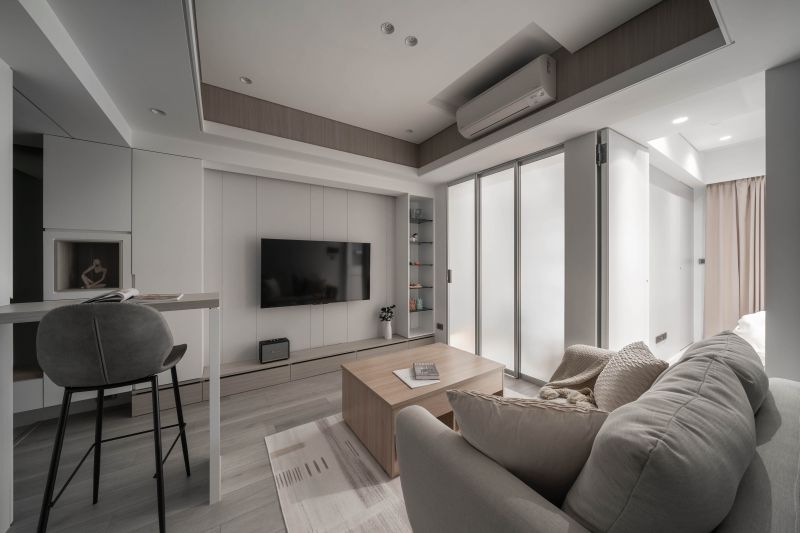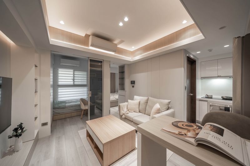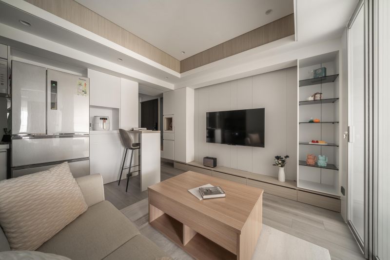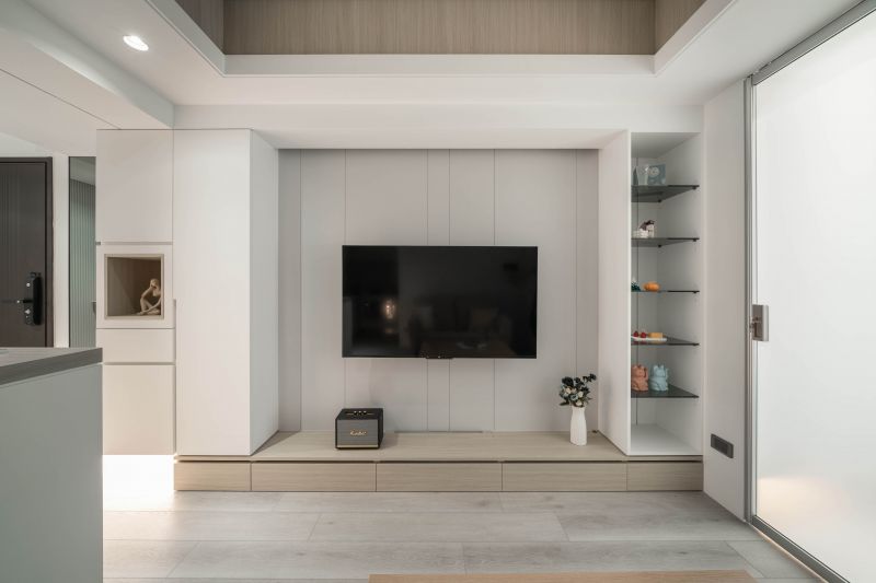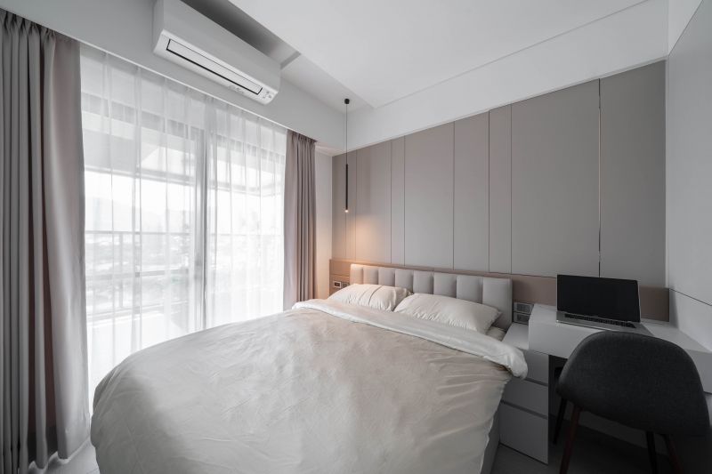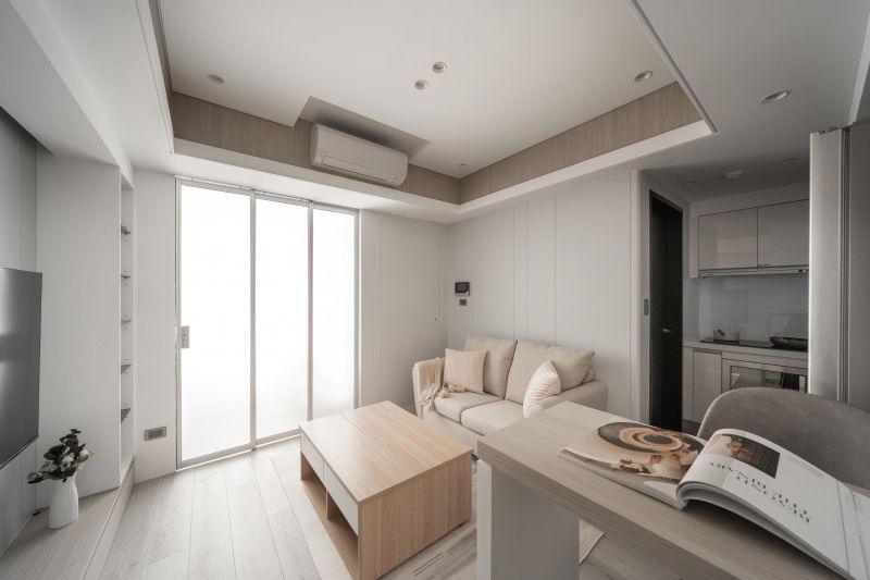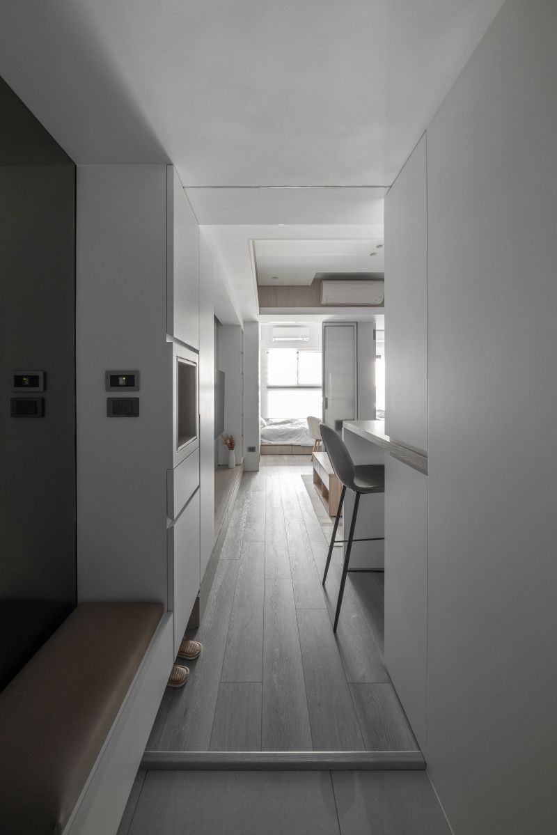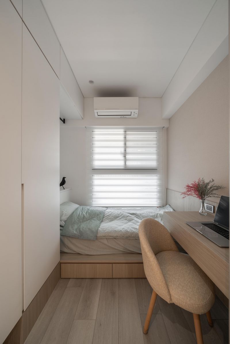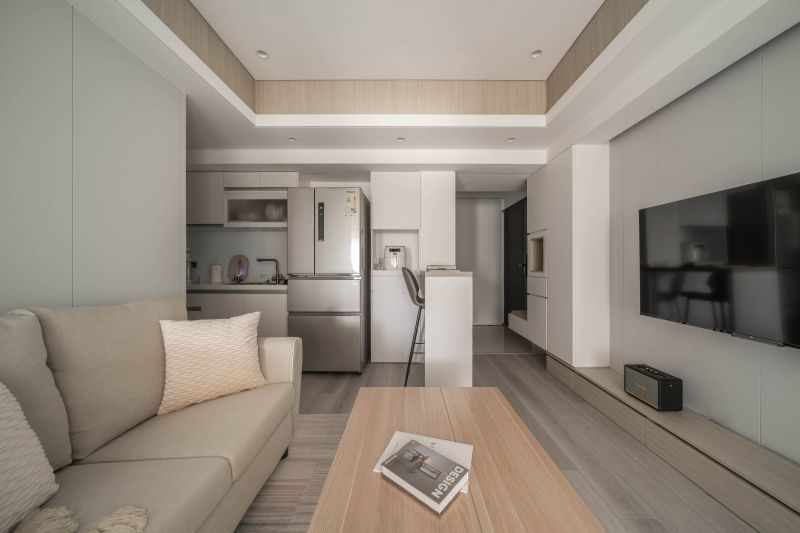 The light-colored minimalist space is decorated with warm wood veneer. The space is not overly decorated and cut, but only the horizontal and vertical interlacing design presents a fresh atmosphere and echoes the minimalist style. The project is like a box with an exquisite design. When the client opens the door, he can experience the effect of light penetrating from the master bedroom to the public area, like a delicate box being opened with surprise. The light gray wall extends to the master bedroom, and the light blurs the boundaries, giving the space translucency.