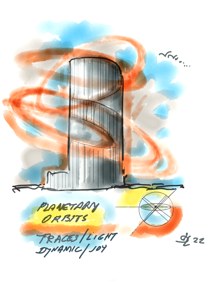The Orbit Tower is inspired by the planet orbital movements. The unique appearance is achieved by projecting the trajectory lines of different planetary movements on the building. By articulating the areas between the orbit curves, the rhythm and proportion of the façade is enhanced.