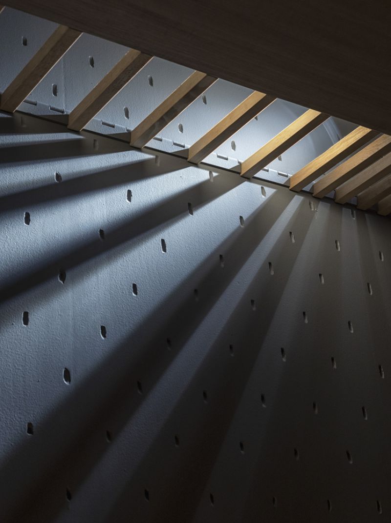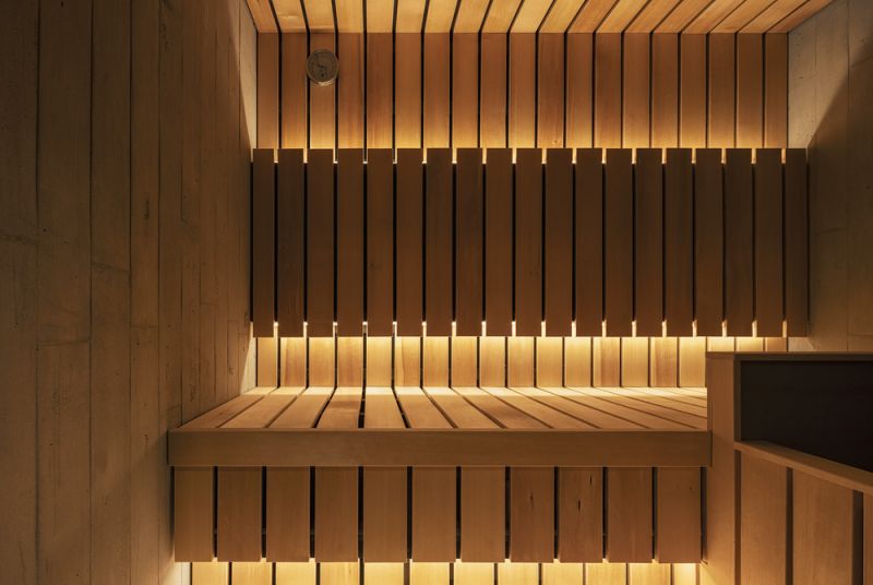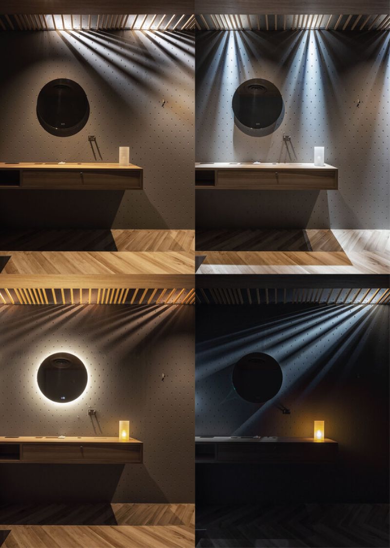 Japaneseword “shinkan” means “deep stillness” . It expresses a way of falling completely silent without making a single sound.Therefore, we focused on sounds. By eliminating all the noise we tried to create a sauna space where one person can relax.The partition walls extend to the attic, all finishing are uneven, and sound proofing material is used inside the walls to minimize noise.Furthermore, by applying lighting that corresponds with a direction, intensity, color temperature of the natural sunlight, the space was designed to express the silence of a naturally born and growing forest.