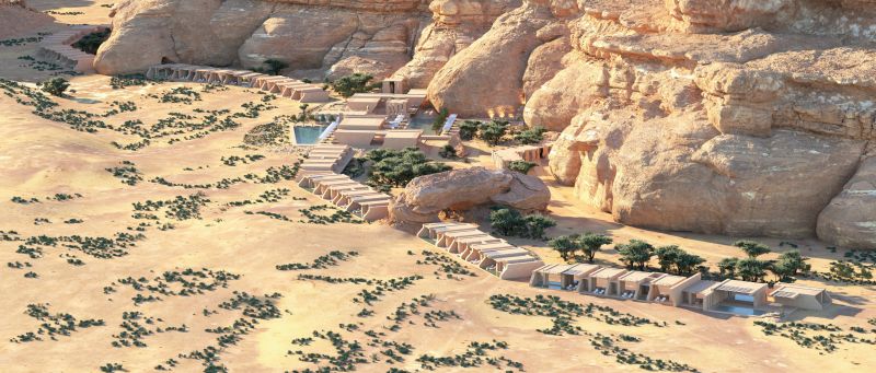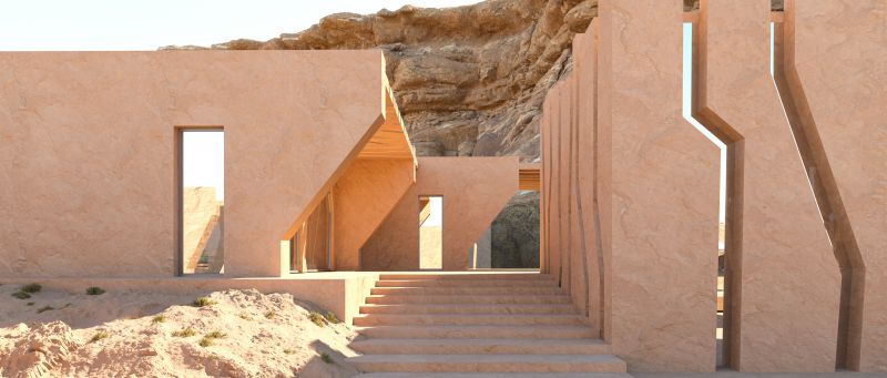 Its structures are inspired by the shapes and colours of the surrounding rock formations and dunes, and its materials and finishes were deliberately selected to look and feel as if they were part of the landscape. The buildings are made using green building strategies and are oriented to minimize heat gain while providing outdoor views.