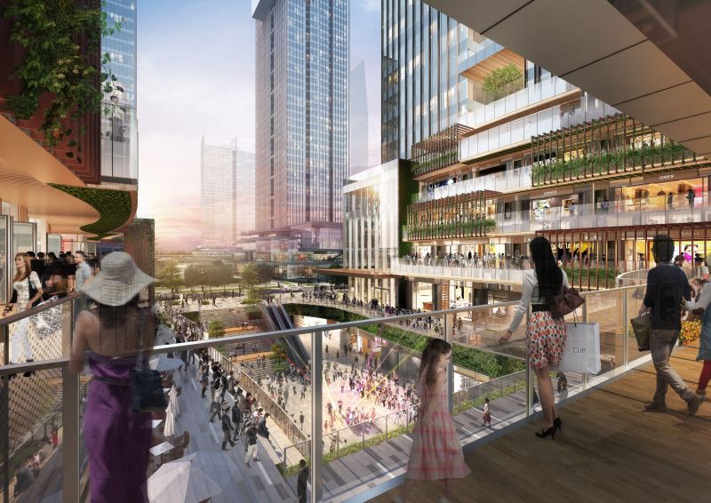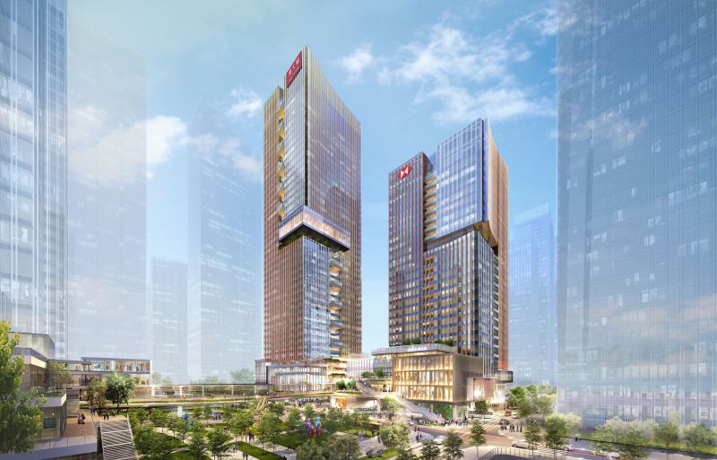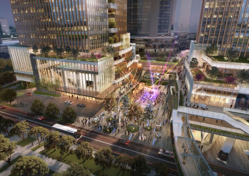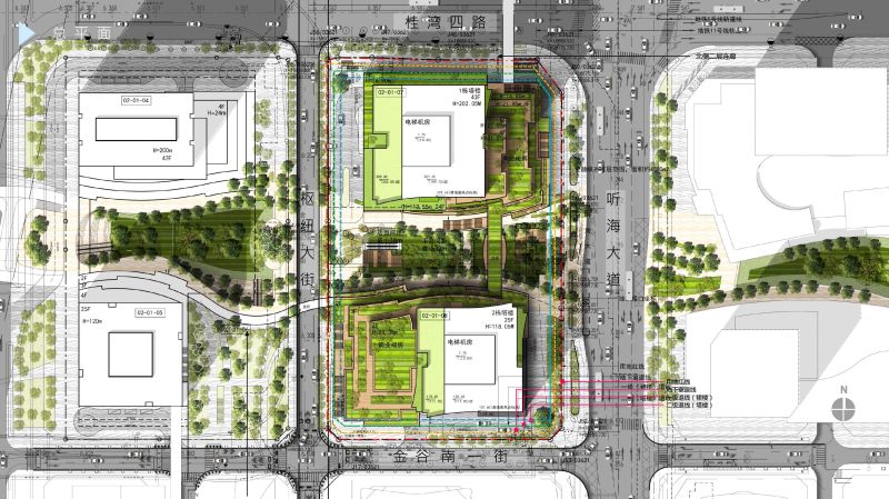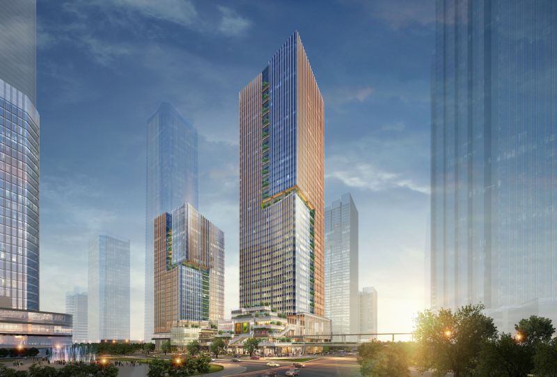 Located in Guiwan area, Qianhai, Shenzhen, the mixed-use development features two office towers sitting on top of a retail podium with exhibition areas, green terraces and community facilities. Proposed as “Park in the Valley”, the design creates dynamic layers of green terraces on two sides of the central valley, with green balconies stacked up to the office towers above, producing a unique landmark in the district. Walking through the “Park in the Valley”, visitors will notice the rich palette of materials – timber, stone and glass lavishly applied in this new urban oasis.