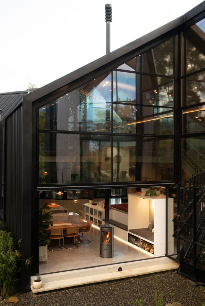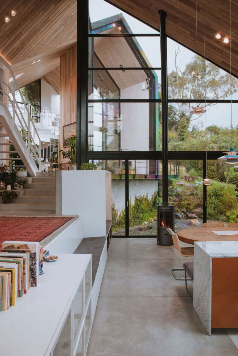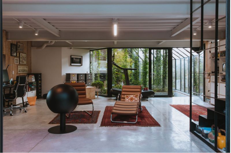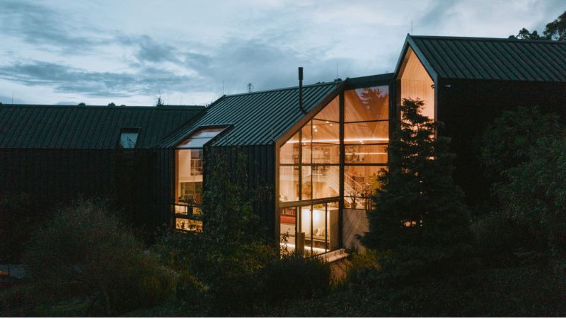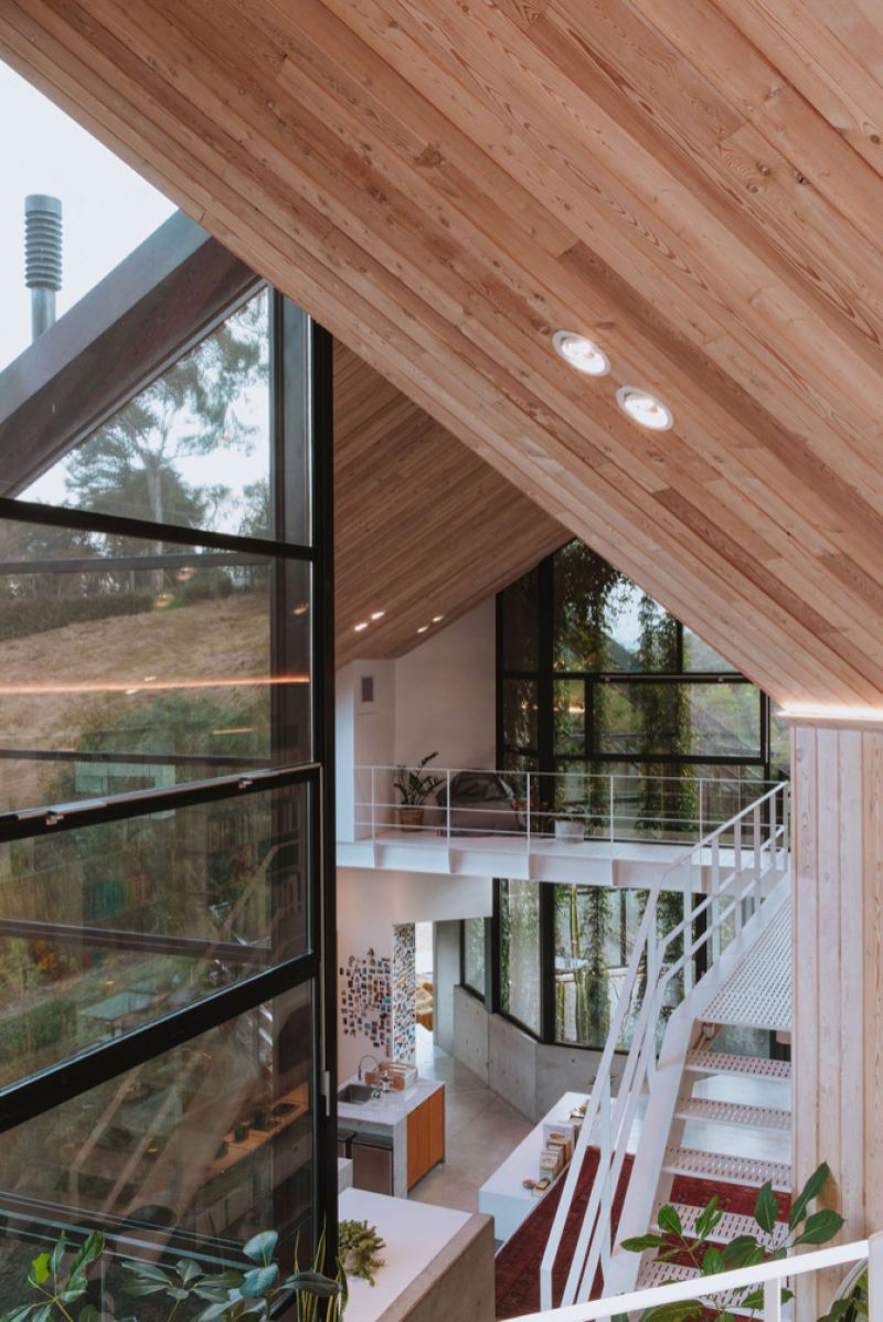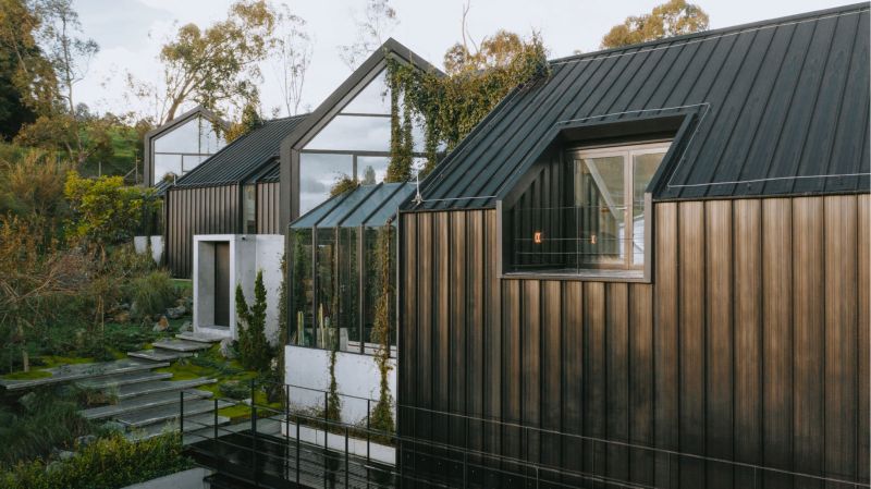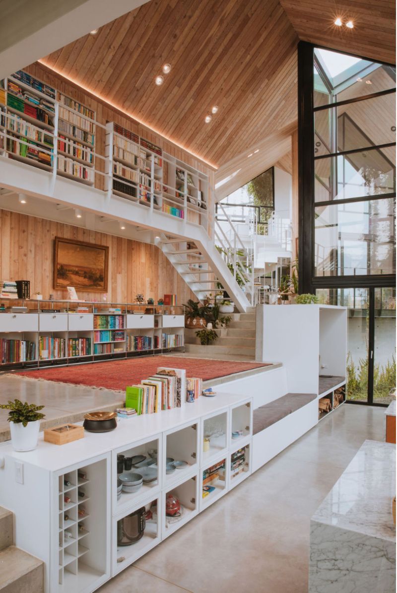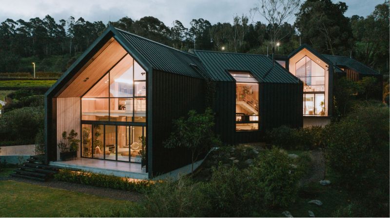 This is a house that unfolds to look at itself, the SKL house is staggered on a sloping topography by means of four modules. They, apparently independent, are joined by two garden tunnels that make this house a single unit. With the rotation of these pieces, angular openings are created that allow the creation of interior gardens, each one keeps the same proportions, but is inverted with respect to the previous one, which allows us to generate a common principle between roofs, ridge levels and side heights of the facades.