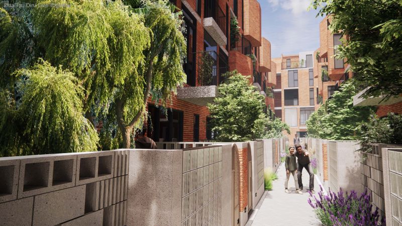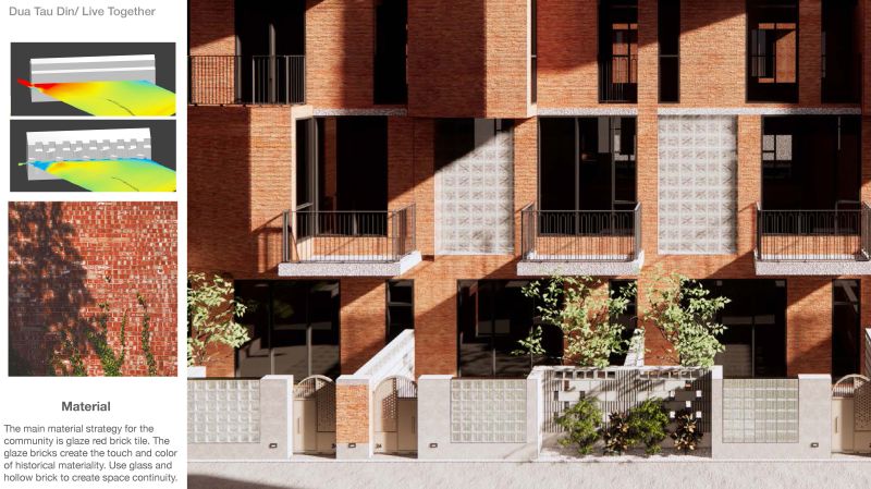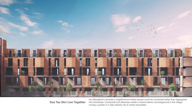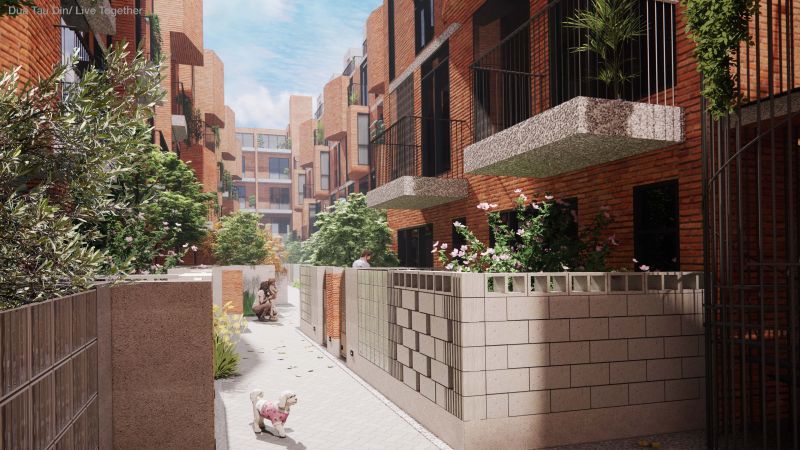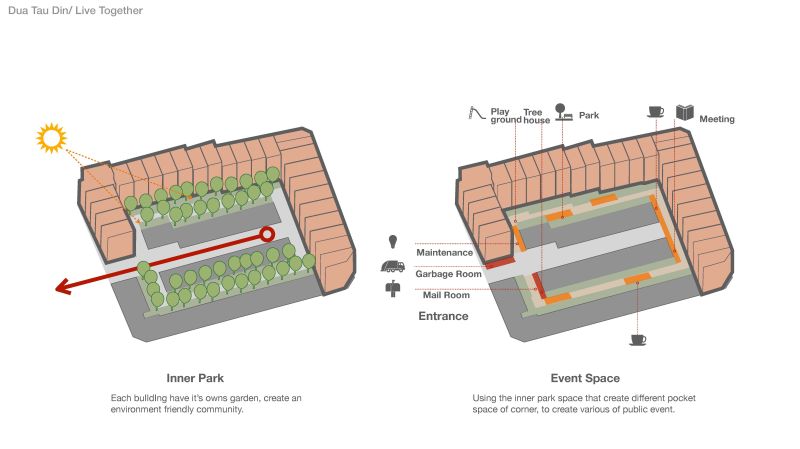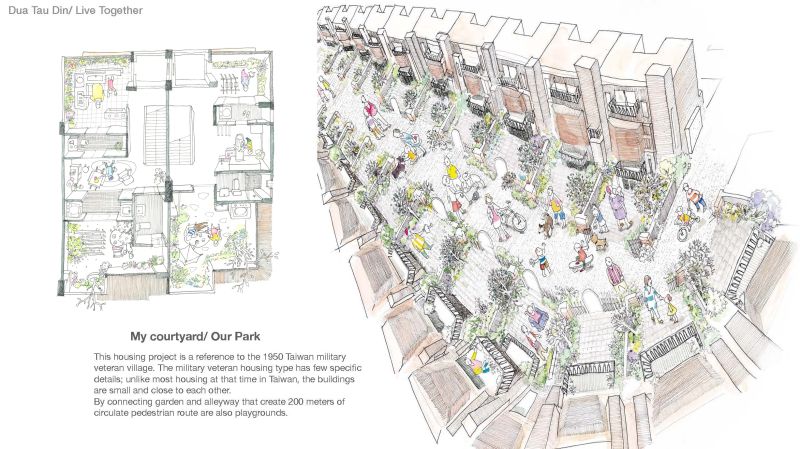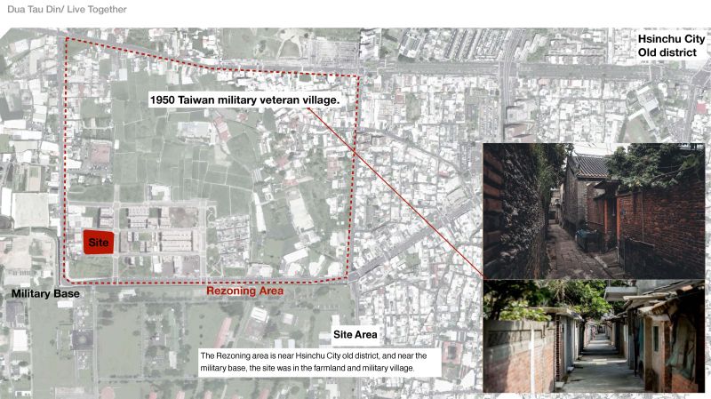 The project location is in Hsinchu City, Taiwam; it's a rezoning area from farmland and a military base. The village that once stood there dates from 1950; the location is a formal Air Force veteran village; the air force village was famous for flying high altitude surveillance planes; and the people who live there are highly bonded as a community. The old village was demolished for a new high-density residential area. The memories of the old village and childhood neighborhood are rapidly disappearing with modern development, so this design is an attempt to continue the lost memories.