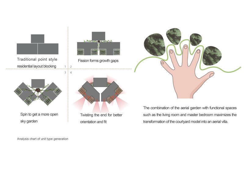 The concept of vertical forest runs through the entire design process: this case combines height difference to introduce the canyon, and organically connects the canyon area with the ancient tree square through micro terrain, forming an ecological green valley and constructing a bottom vitality center; The pioneering "petal style" aerial garden balcony mode allows every household to enjoy a panoramic view. The maximum combination of air balconies with functional spaces such as the living room and master bedroom has achieved the transition from a "courtyard" model to an "air villa".