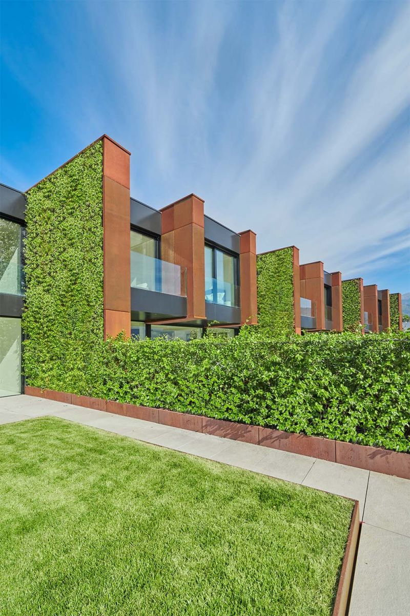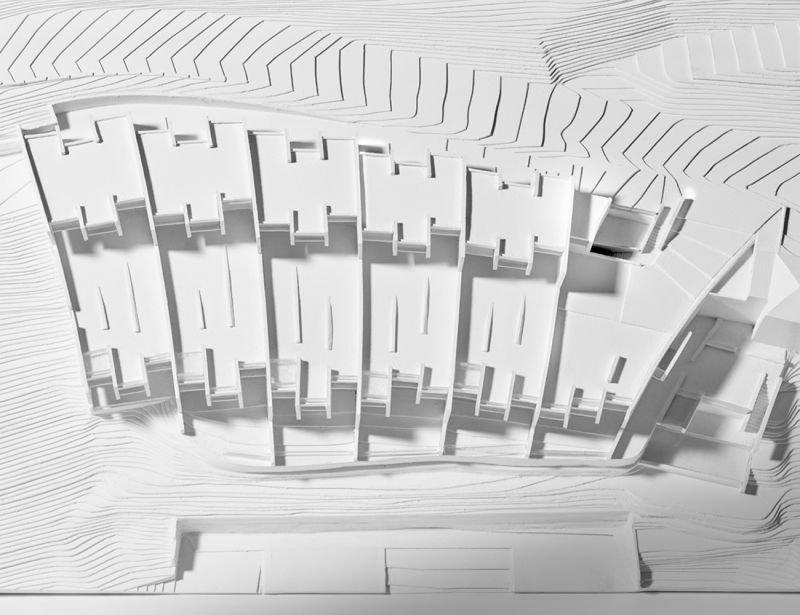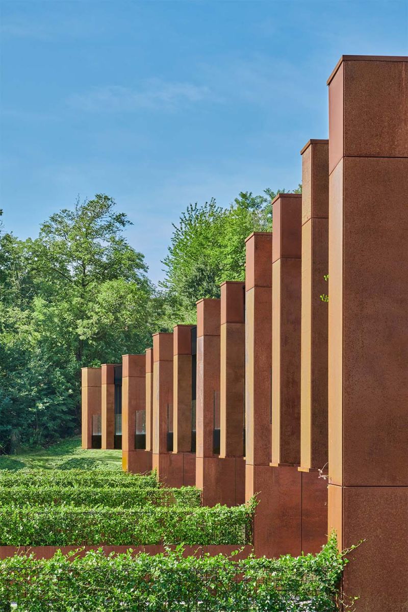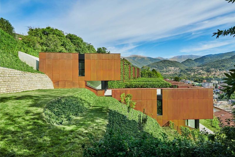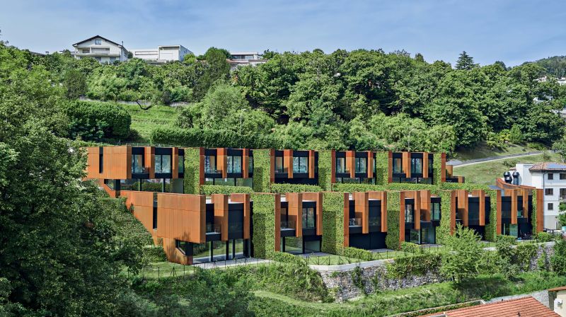 The inspiration for this residential complex in Canobbio, Switzerland, comes from the art world, specifically from the works of the artist Richard Serra, evocative spatial sculptures built with metal sheets.