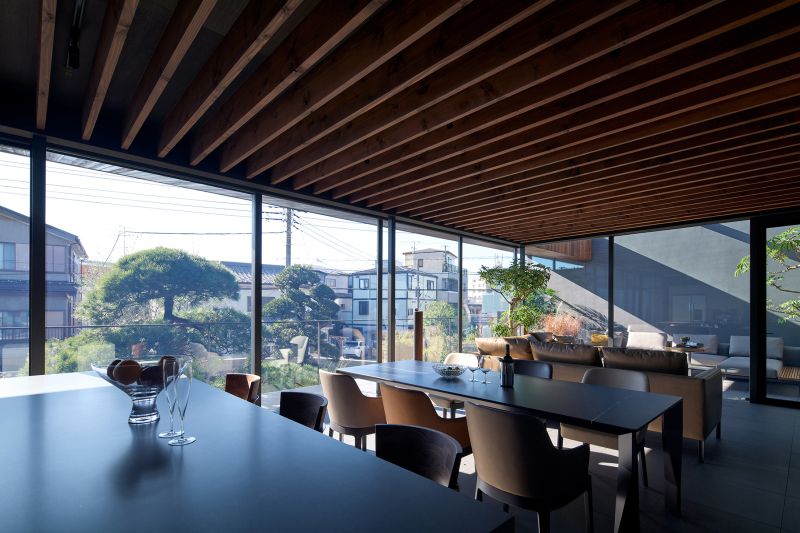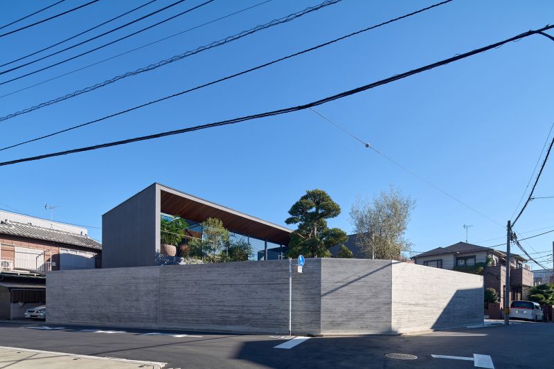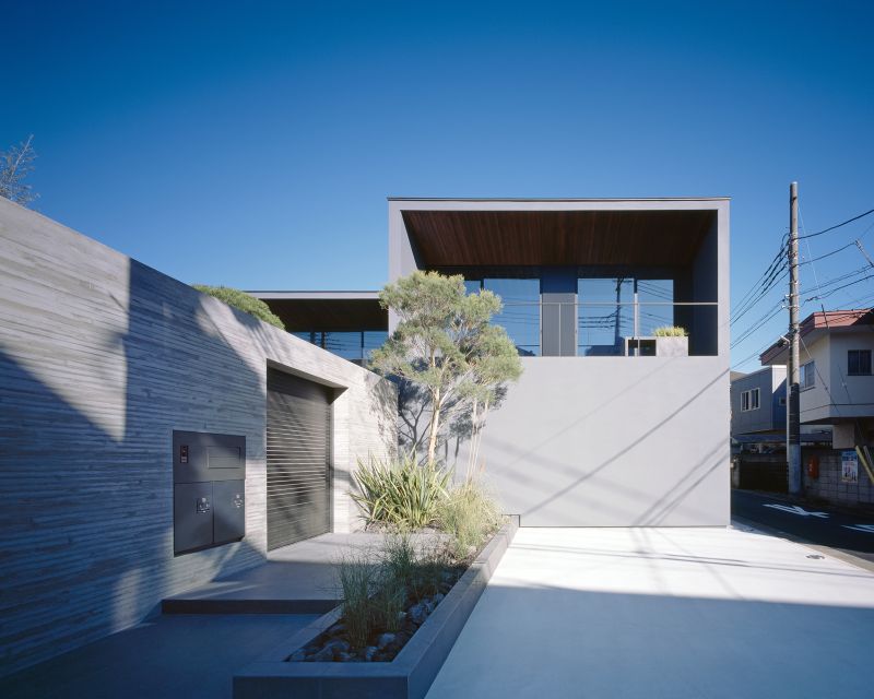 Located in a quiet residential neighborhood, this multigenerational home rebuild project was designed around a large garden. The verdant garden defines the property, which is surrounded by tall, board-formed concrete walls to ensure security and privacy. Two large pine trees already growing on the site anchor the landscape design, which features diverse species intentionally scattered throughout the space. Adjacent to the garden, a large gate and door made of wooden louvers leads to a long, broad approach where the focal point is an old olive tree opposite the front door.
