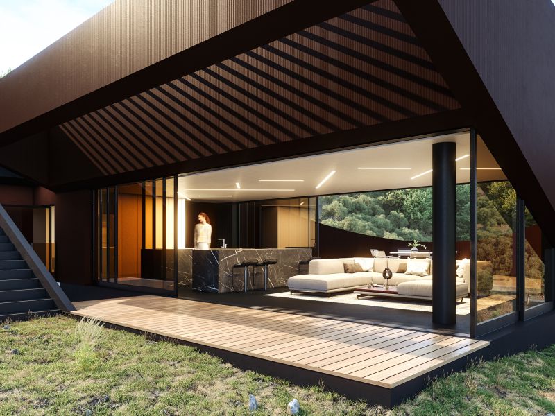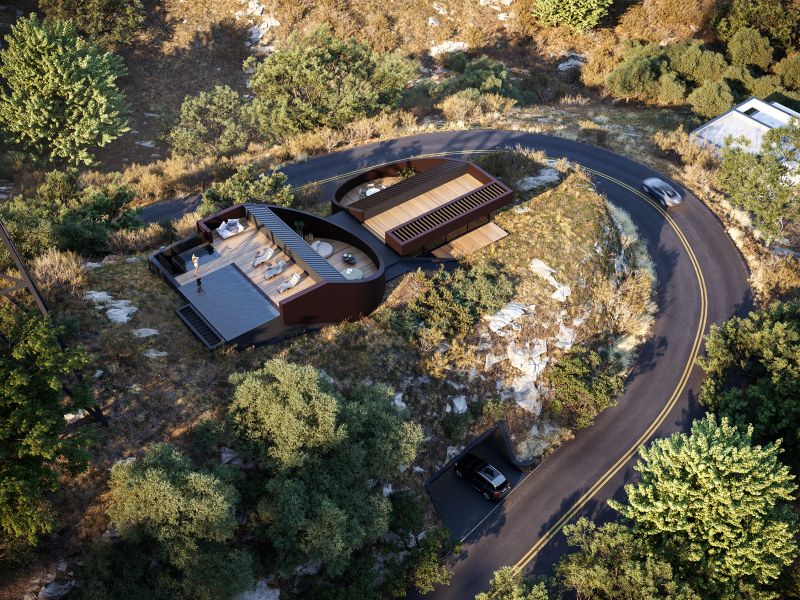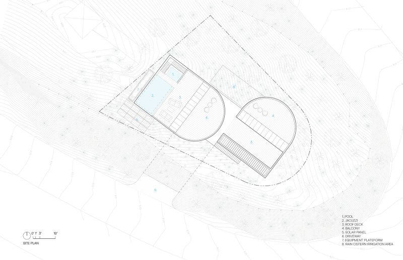 The proposed project is a 1,717 sq ft single-family dwelling on a 7,776 sq ft upslope escarpment near Mulholland Drive, Los Angeles. Its focus is on preserving the natural topography by gently integrating a bisected form and unique tunnel access. The design harmoniously blends with the ridge's topography, featuring a low-profile building on the ridgetop accessed via the tunnel. This approach preserves the site's natural aesthetics by eliminating a disruptive vehicular driveway, ensuring the land's beauty is protected.
