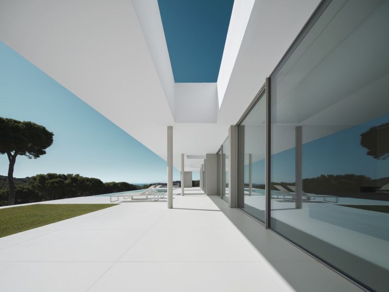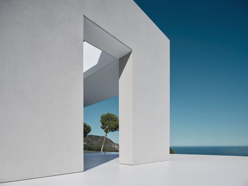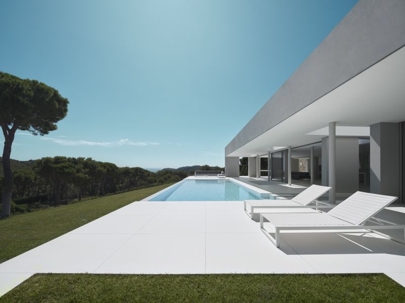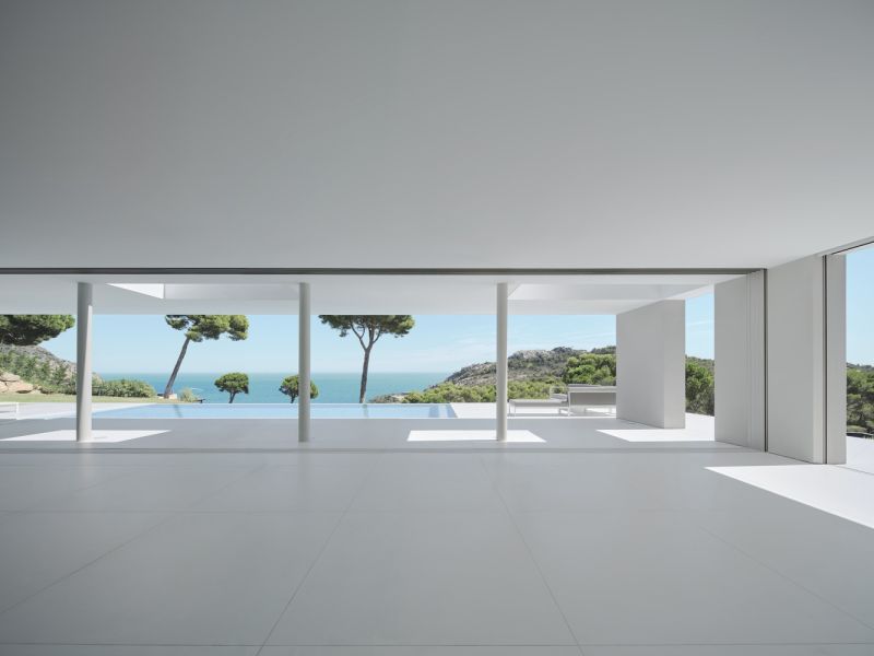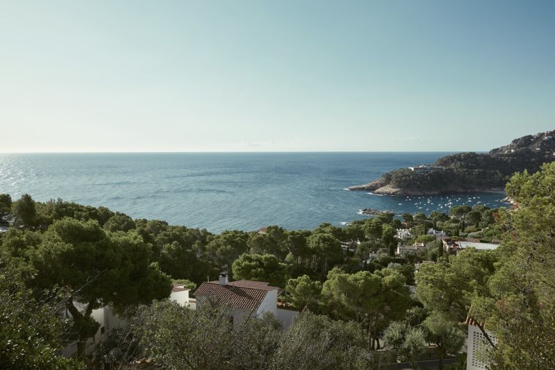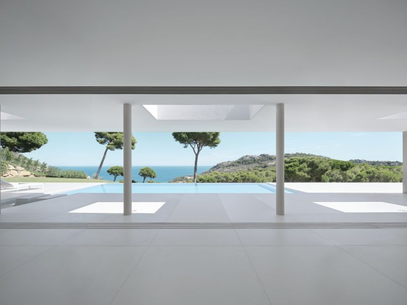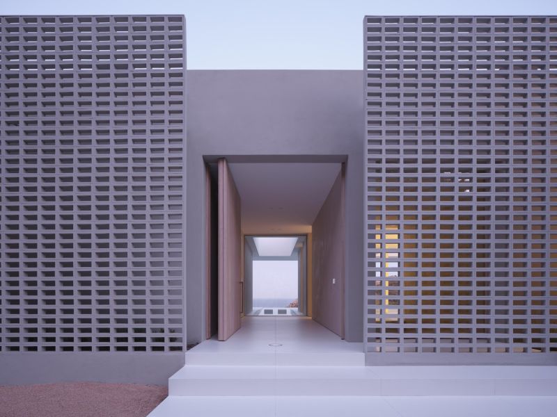Perched on a plateau above a steeply sloping site on The Costa Brava in northeastern Catalonia, the house is surrounded by pine trees and commands panoramic views of the Mediterranean Sea. Brise-Soleil screens dominate the approach to the house. A single aperture with a sandblasted timber door opens to the interior and a framed view of the coast beyond.