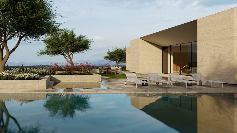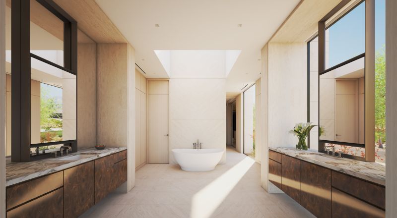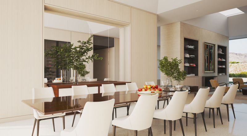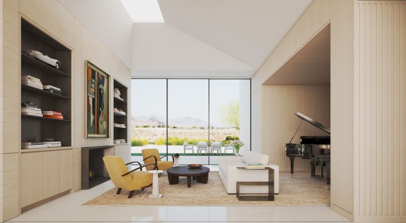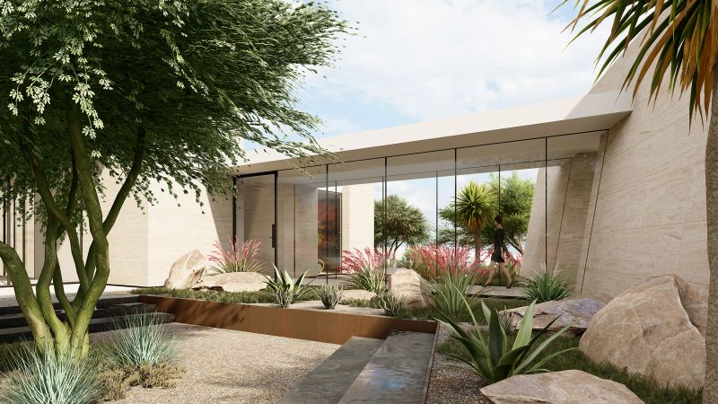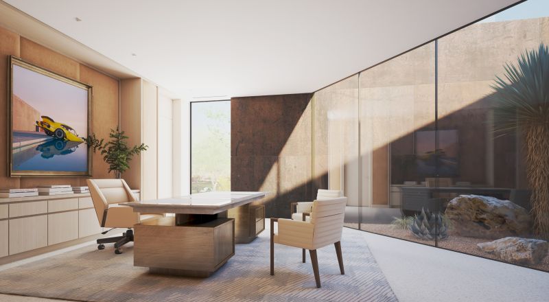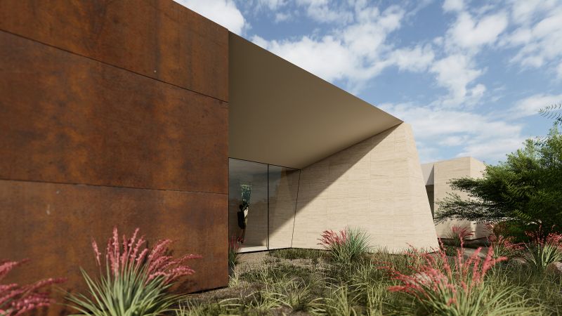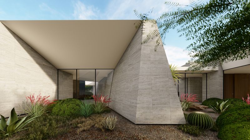 The design explores the dissection and manipulation of a rectangular mass to create a sculptural experience of space with orthogonal efficiency. Rotated and battered walls, deep knife edge overhangs, chamfered ceilings, and plays of light and shadow carry the angular, sculptural language throughout the design. Organized around a courtyard, the presence of natural light permeates all spaces. The long and low-slung roofline mimics the horizontality of the surrounding desert plateaus. The chamfered wall detailing surrounding the glazed openings provide protected access to views and light.