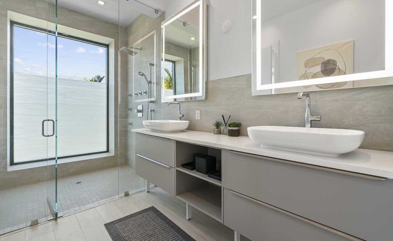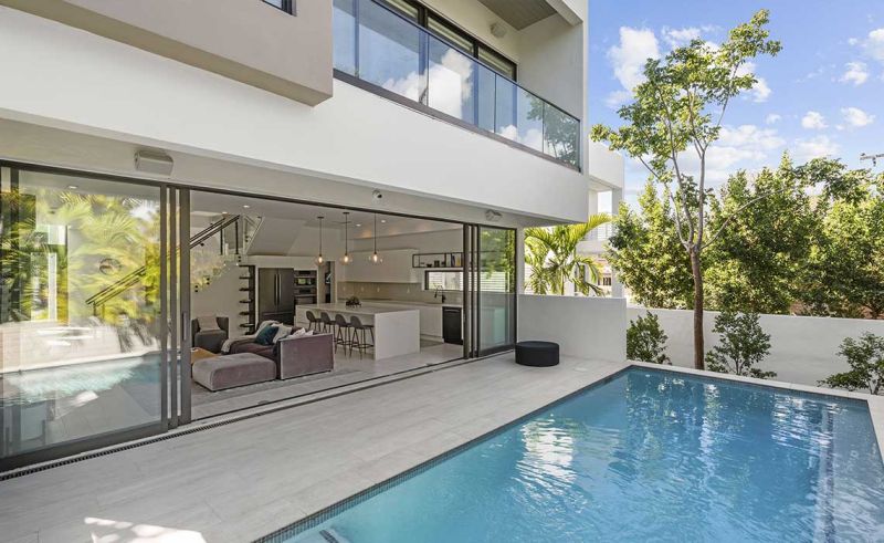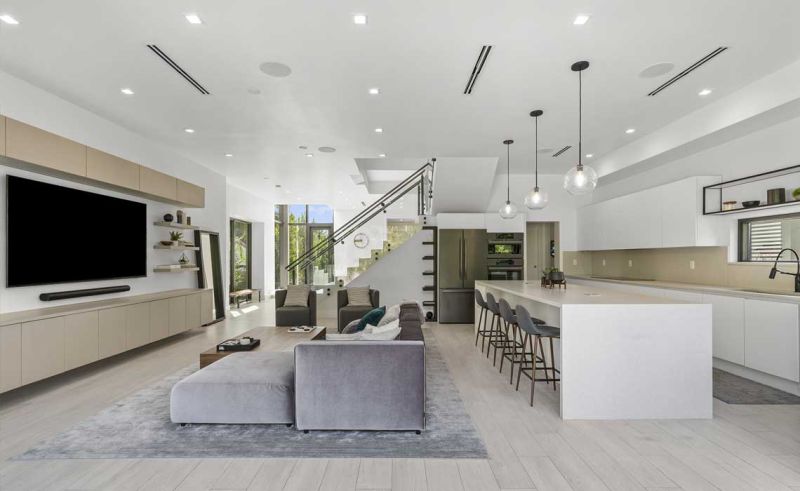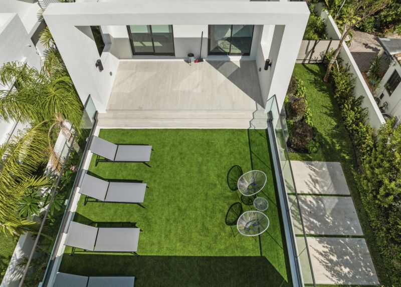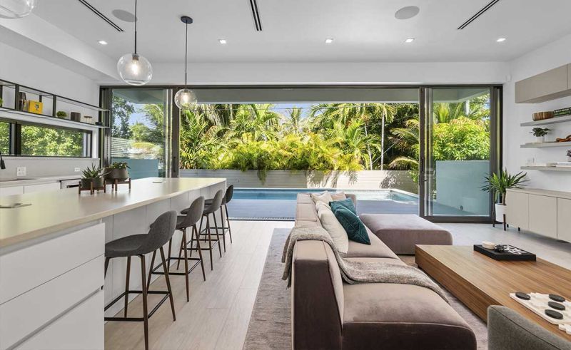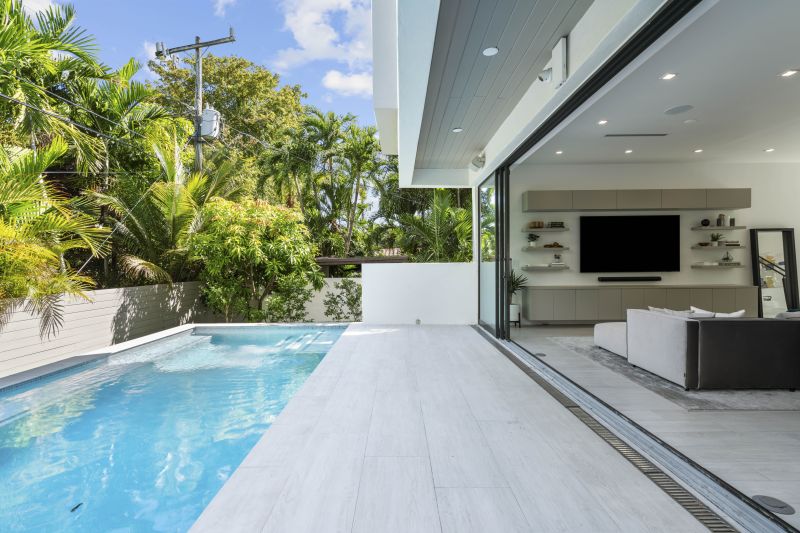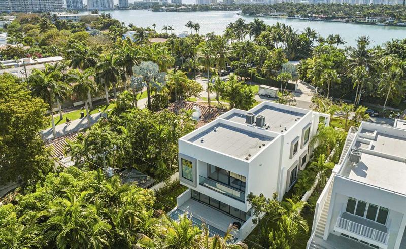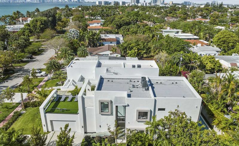 Shadowbox is a new 2 residence located in Miami Beach, Florida. The new 3,600 SF 2 story home is located on a narrow and deep lot close to the waters’ edge. The ground floor features a side entrance 2 car garage with an oversized roof terrace facing the bay on top. The storefront glass tower entry feature is pulled back into the site to draw the eye into the property. Floating concrete stairs lead to the front door.