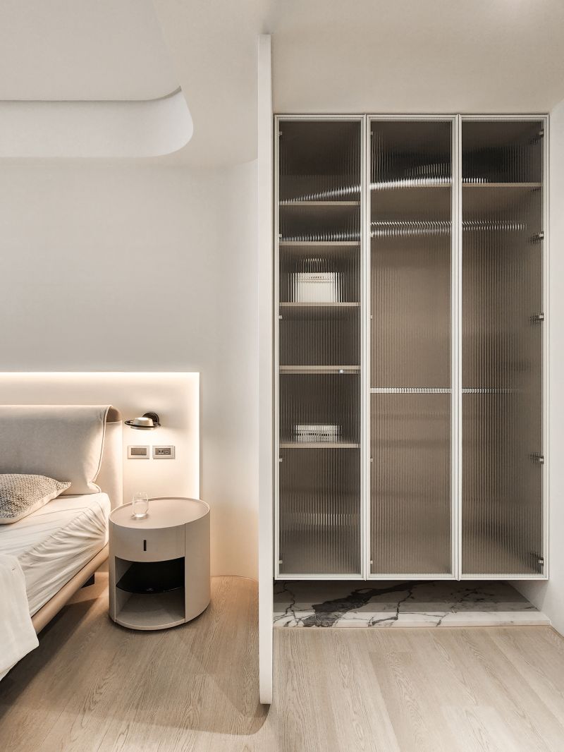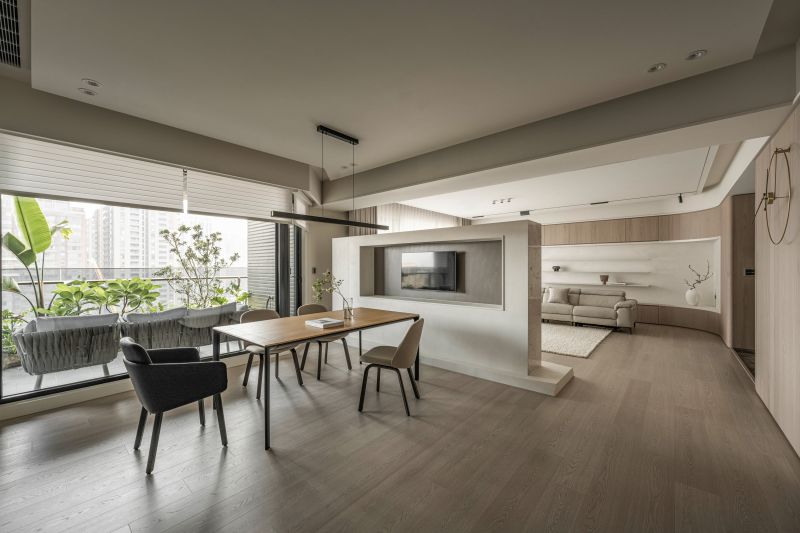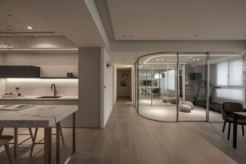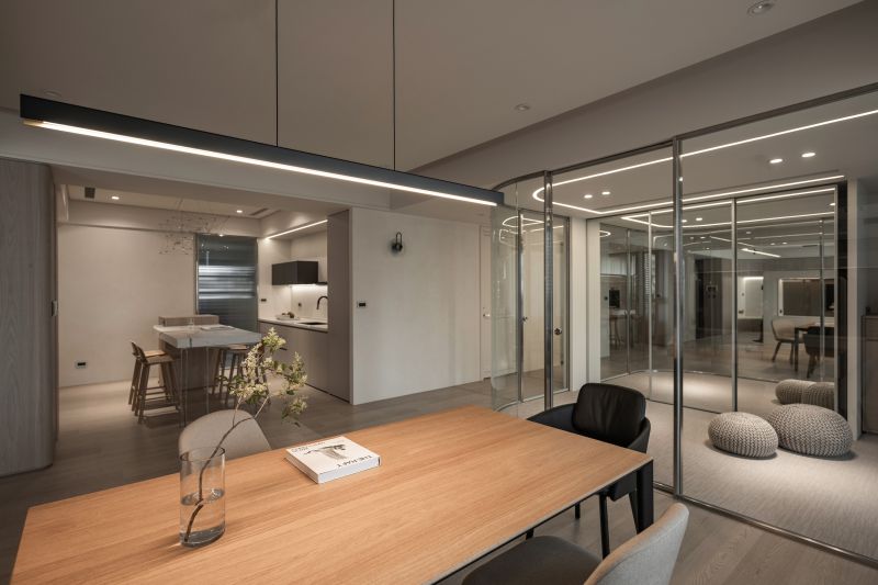 In the post-pandemic landscape, this design is a game-changer for both home and work spaces. The mirrored sliding doors, coupled with the translucence of glass, extend the sightlines to create a visual "horizon," magnifying the sense of space. A double-U layout connects public areas while a half-wall separates dining and living spaces, with one side serving as a TV wall and the other fitted with a small meeting screen. Far more than a mere layout, it's a life philosophy that anticipates the evolving needs of a world in flux, providing a holistic solution for modern living.