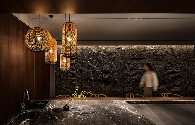 By fusing the symbolic "nest" of the restaurant with Zen-like tranquility, we artfully present a peaceful dining area using stone cladding, wood, and water, integrating eco-friendly materials and elements from the surrounding natural habitats. We sought to convey the intimate relationship between nature and humanity via simple and rustic textures. Additionally, skillfully utilize modern techniques to recreate ancient screen walls at the storefront, along with the turning corridor at the back that provides the guests with a respite from the hustle and bustle of daily life.